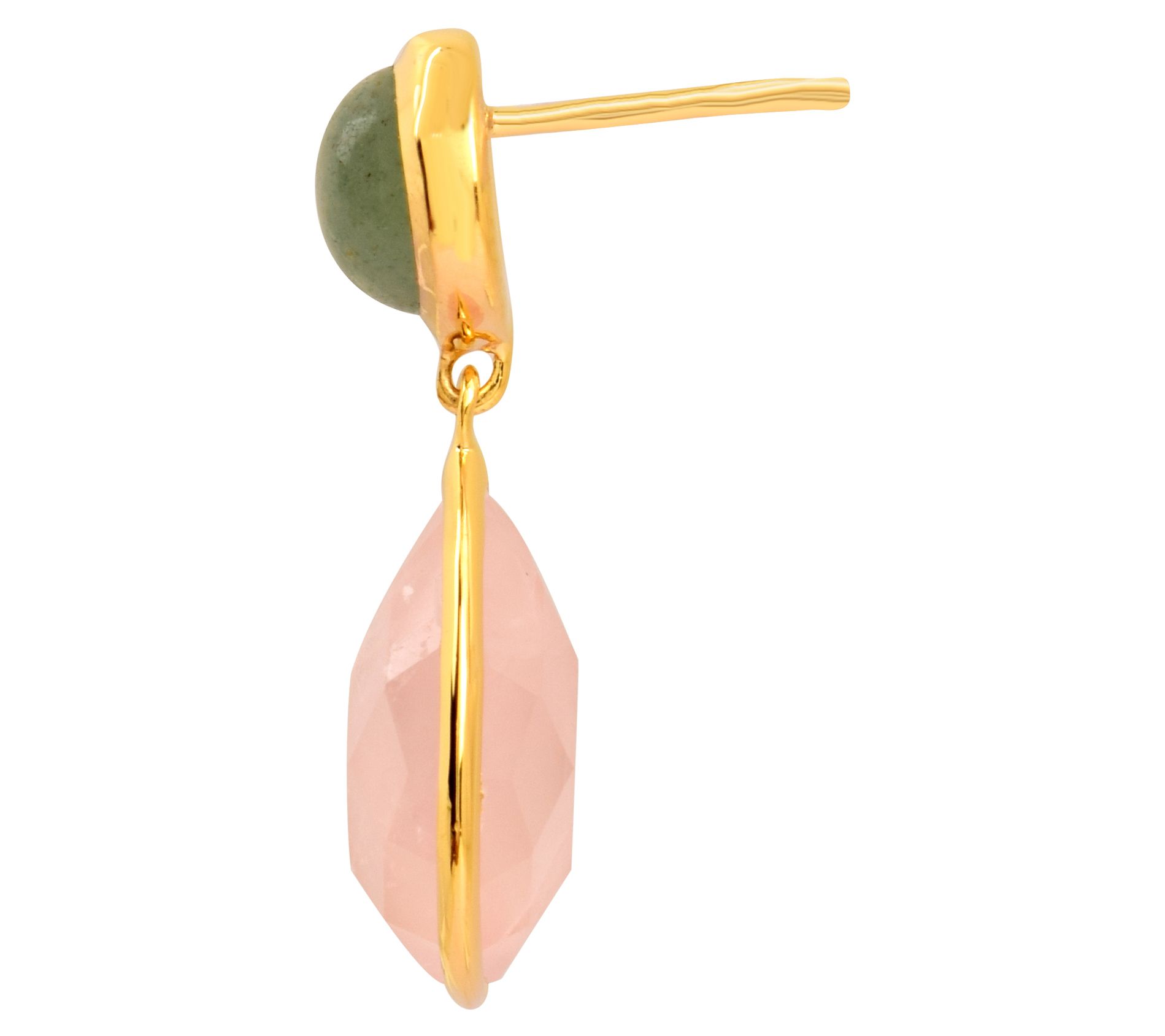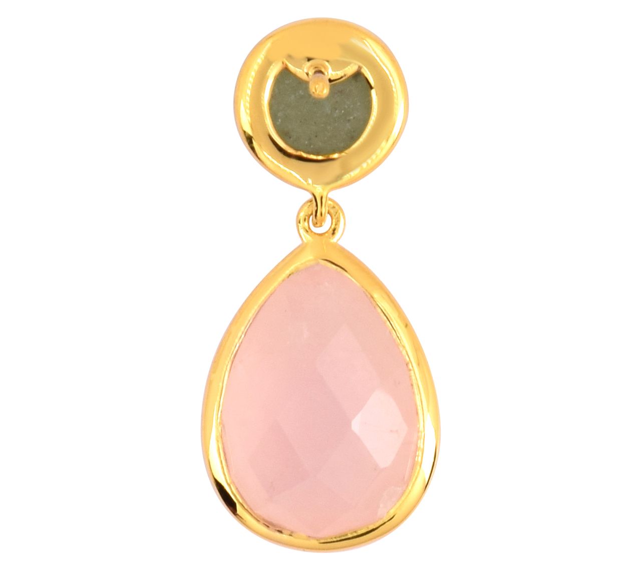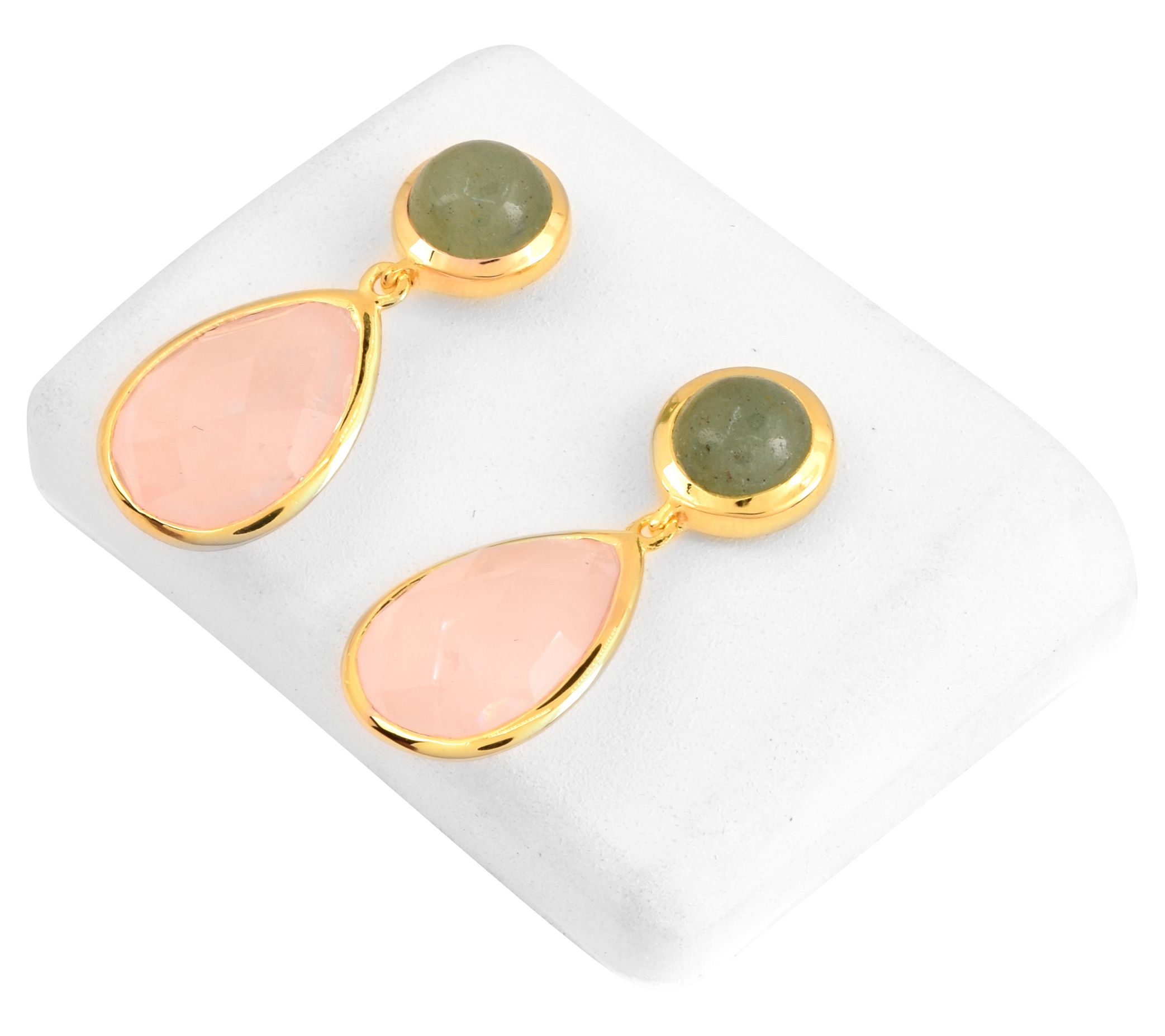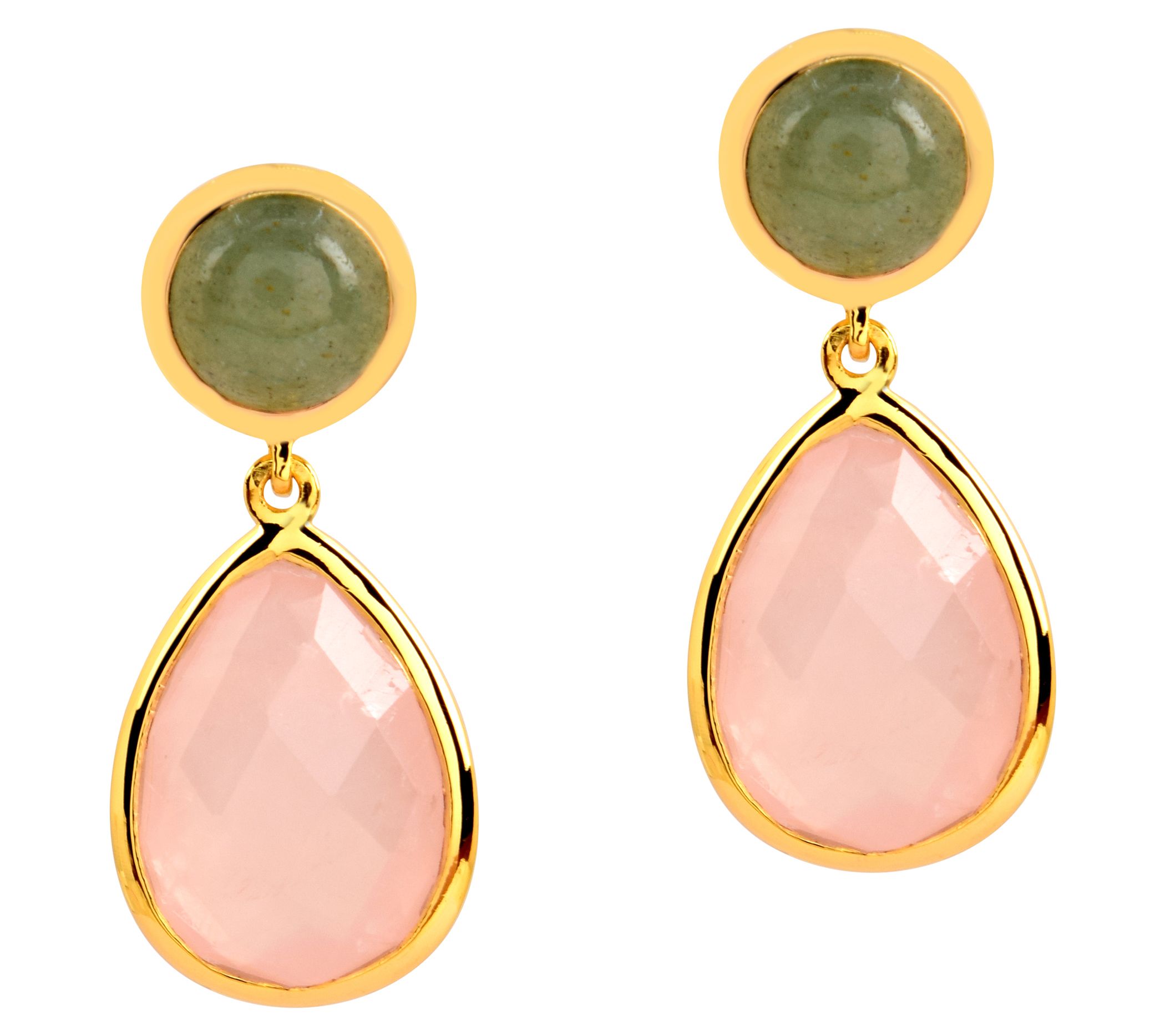 - Round aventurine and pear-shaped rose quartz, bezel-set, dangle design