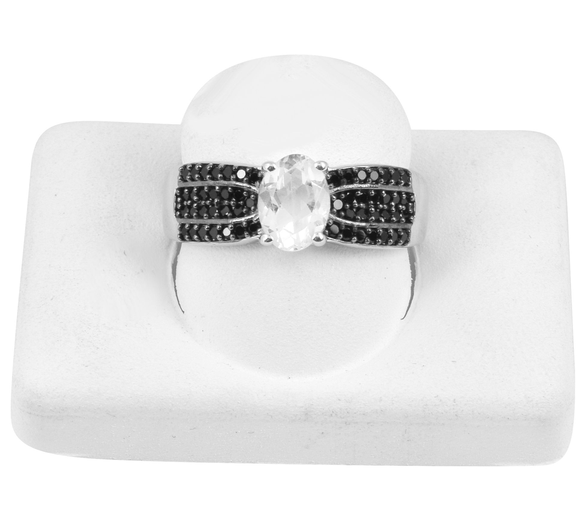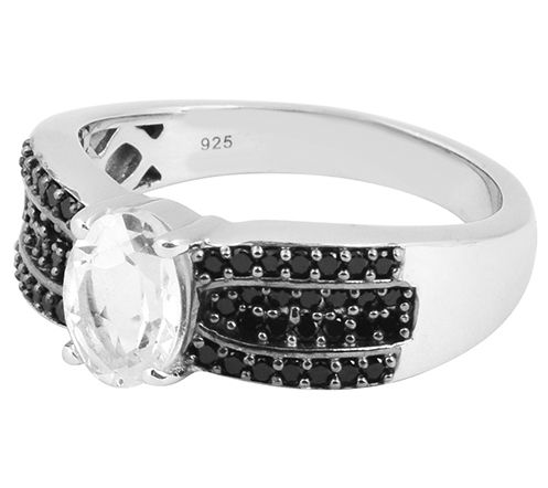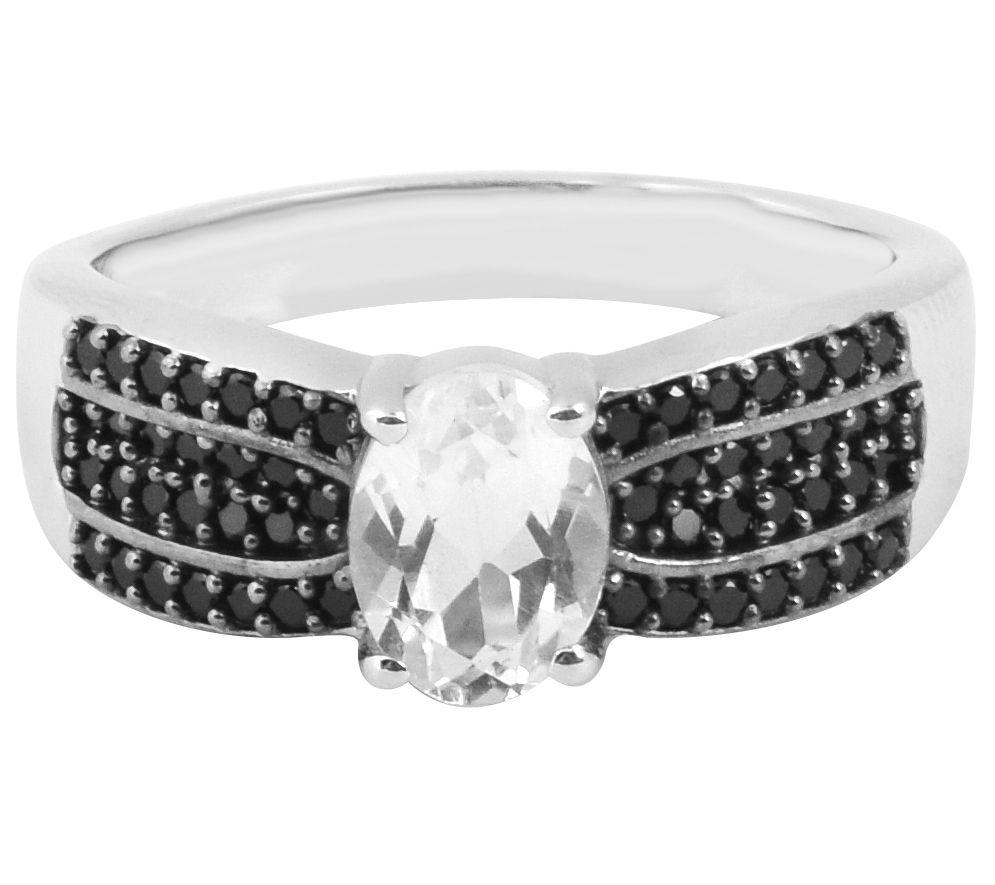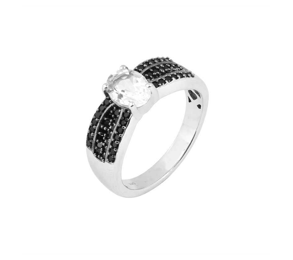 Round-cut, black spinel and oval-cut white topaz gemstones in a prong-set ring
