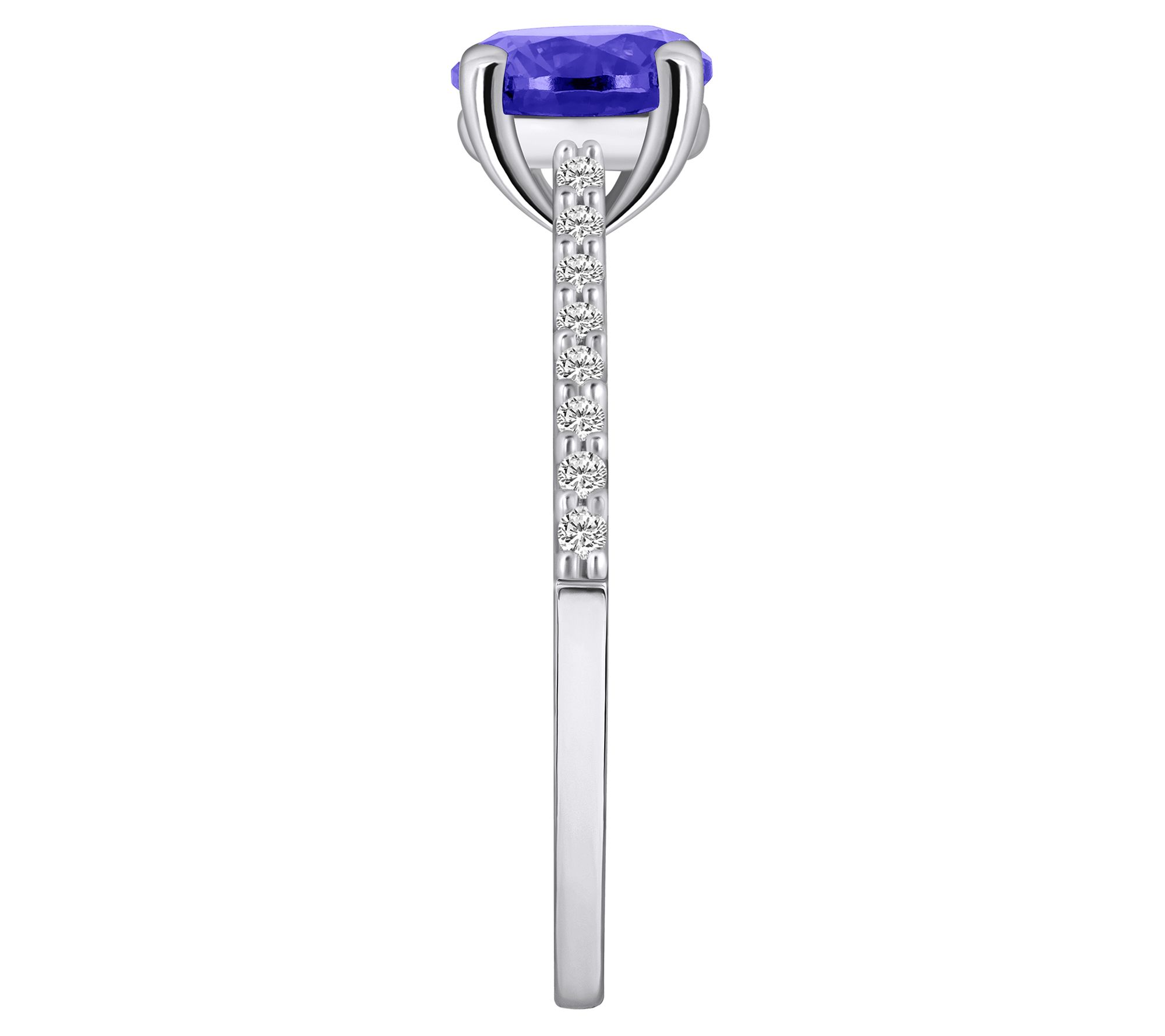 - Round-cut, prong-set tanzanite gemstone with round-cut, prong-set diamond accents down the shank