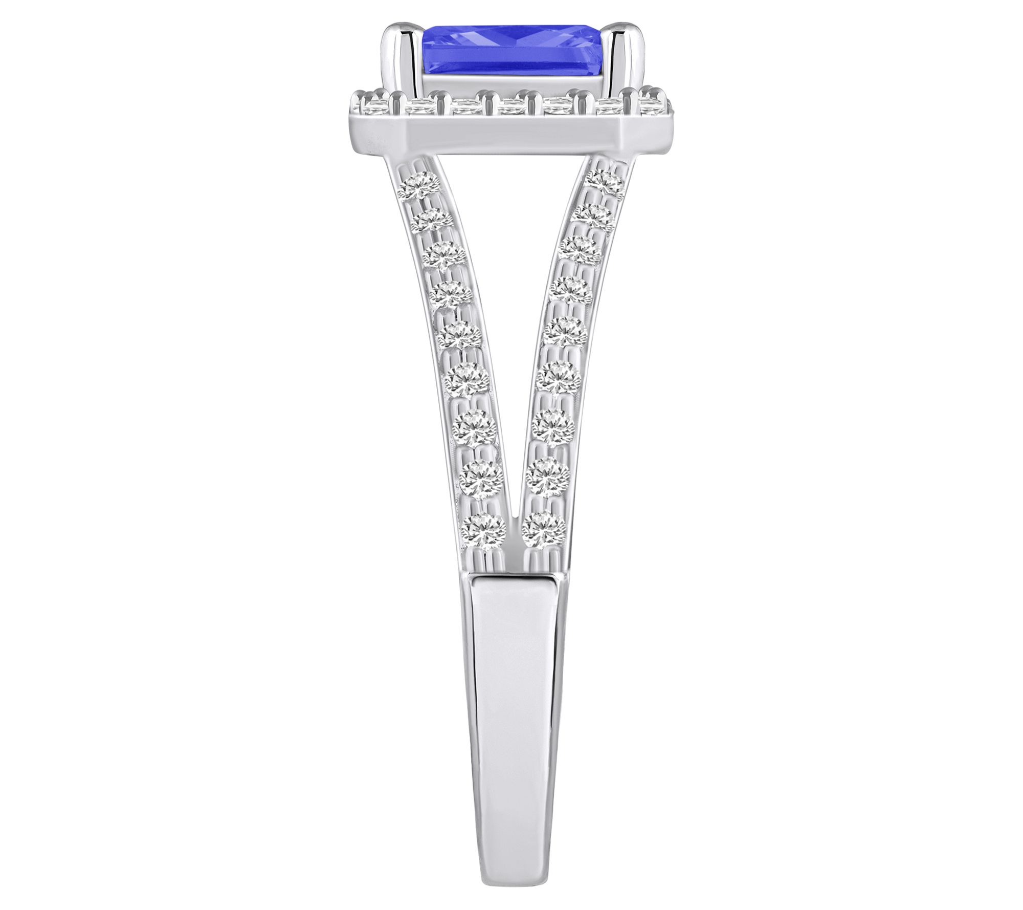 Prong-set, emerald-cut gemstone surrounded by a halo of prong-set, round diamonds with prong-set, round diamond accents going down the spit shank