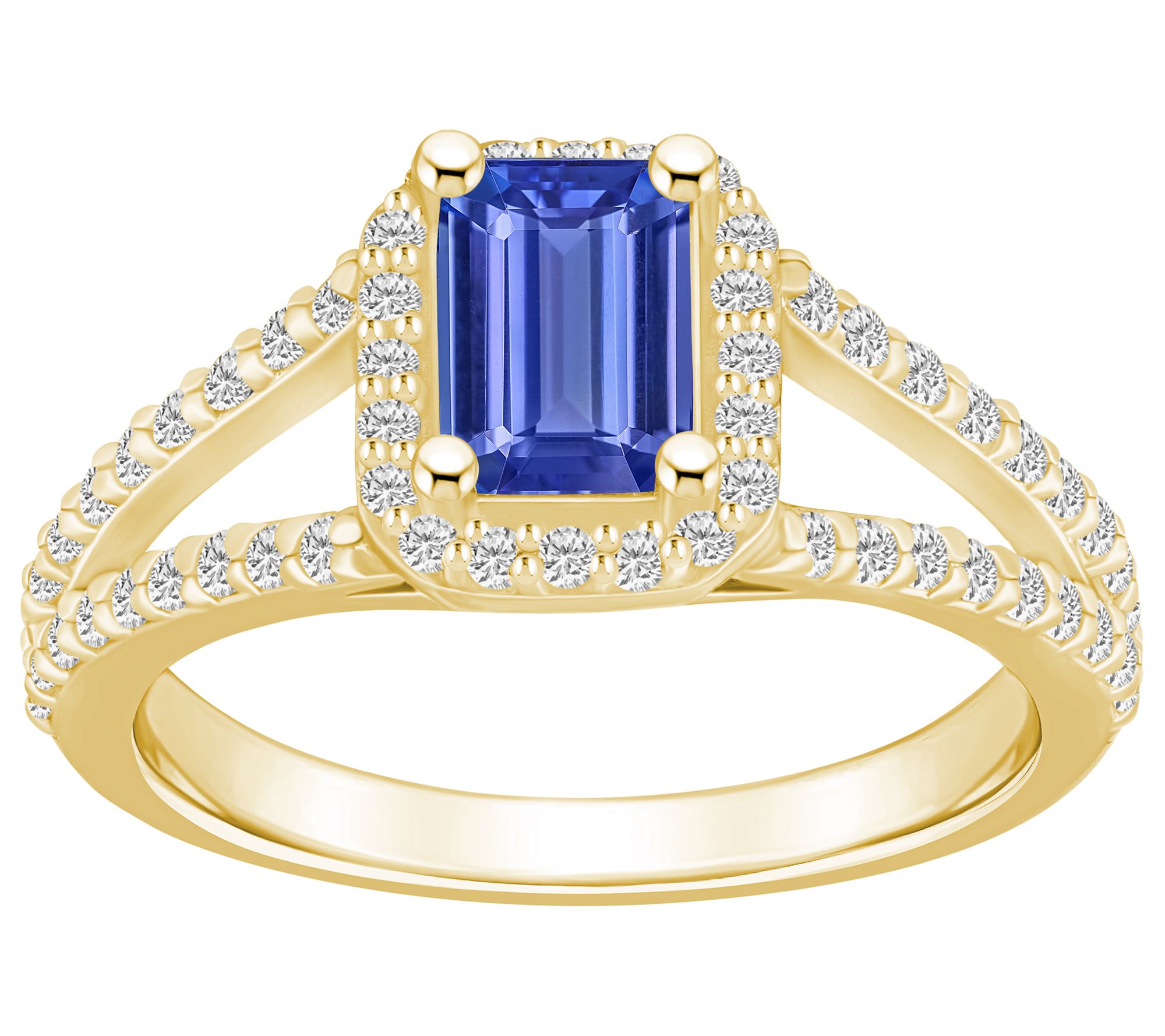Steal the spotlight with this striking 14K gold ring, fashioned with a prong-set, emerald-cut gemstone at the center surrounded by a halo of prong-set, round diamonds. A glittering procession of prong-set, round diamond accents decorates the split shank to finish off this gorgeous piece. From Affinity® Gems.