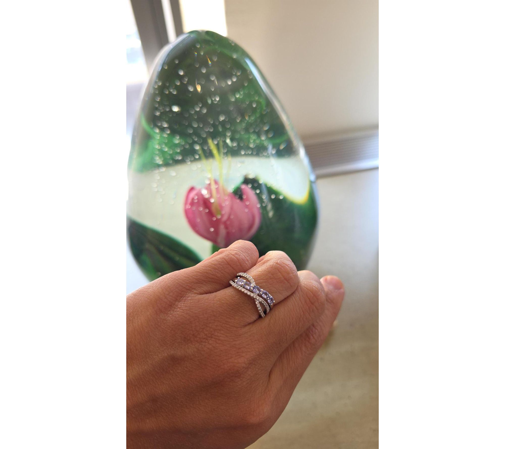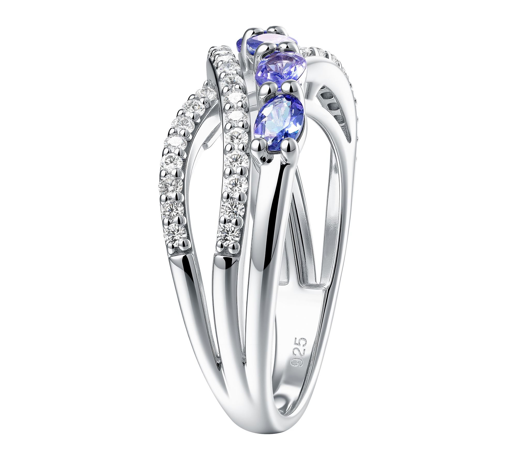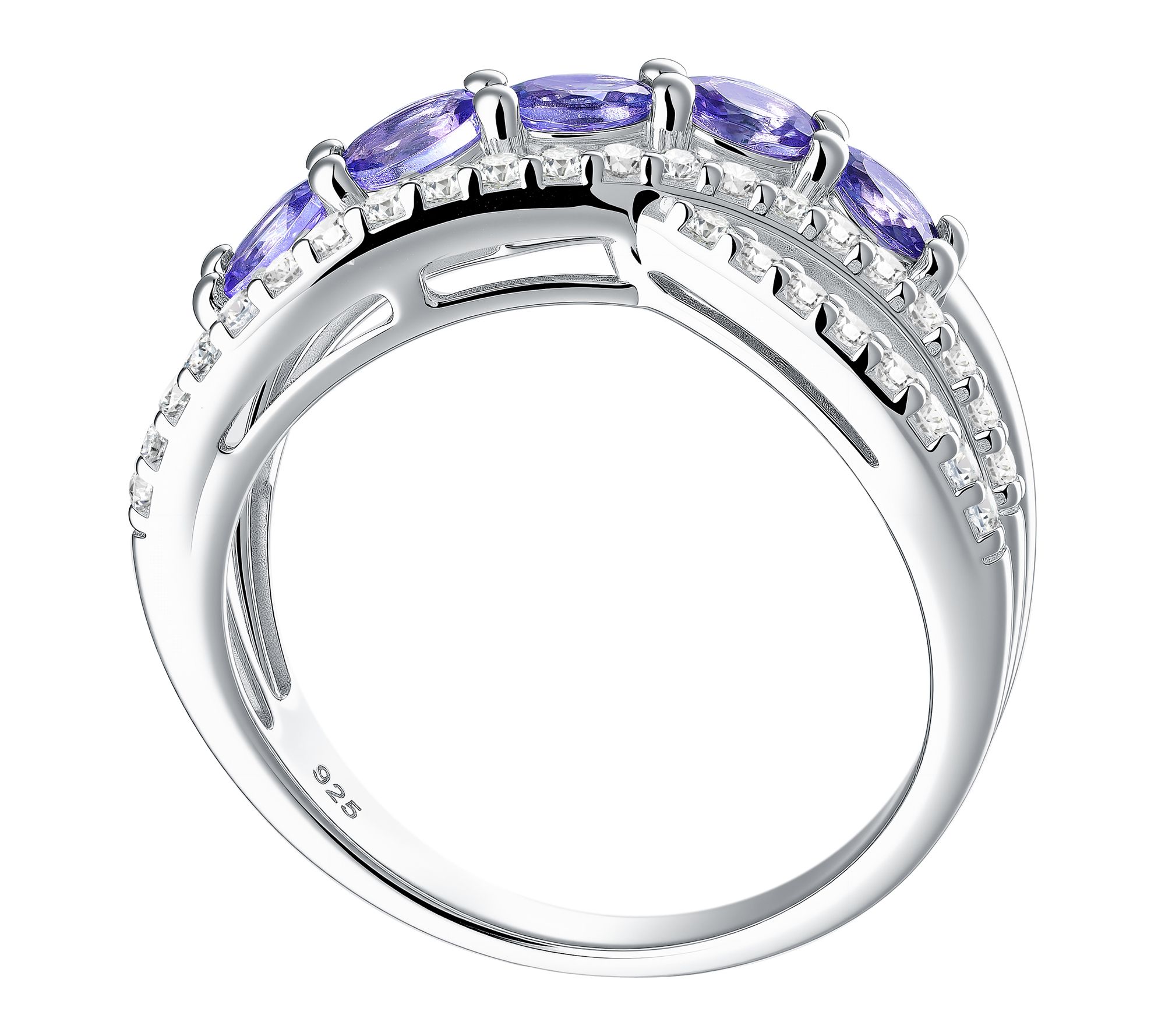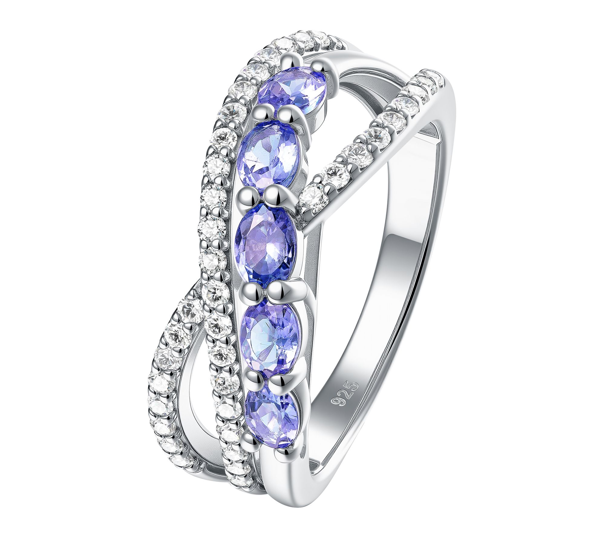 Five oval-cut, prong-set tanzanite gemstones; white zircon accents on cross-over band