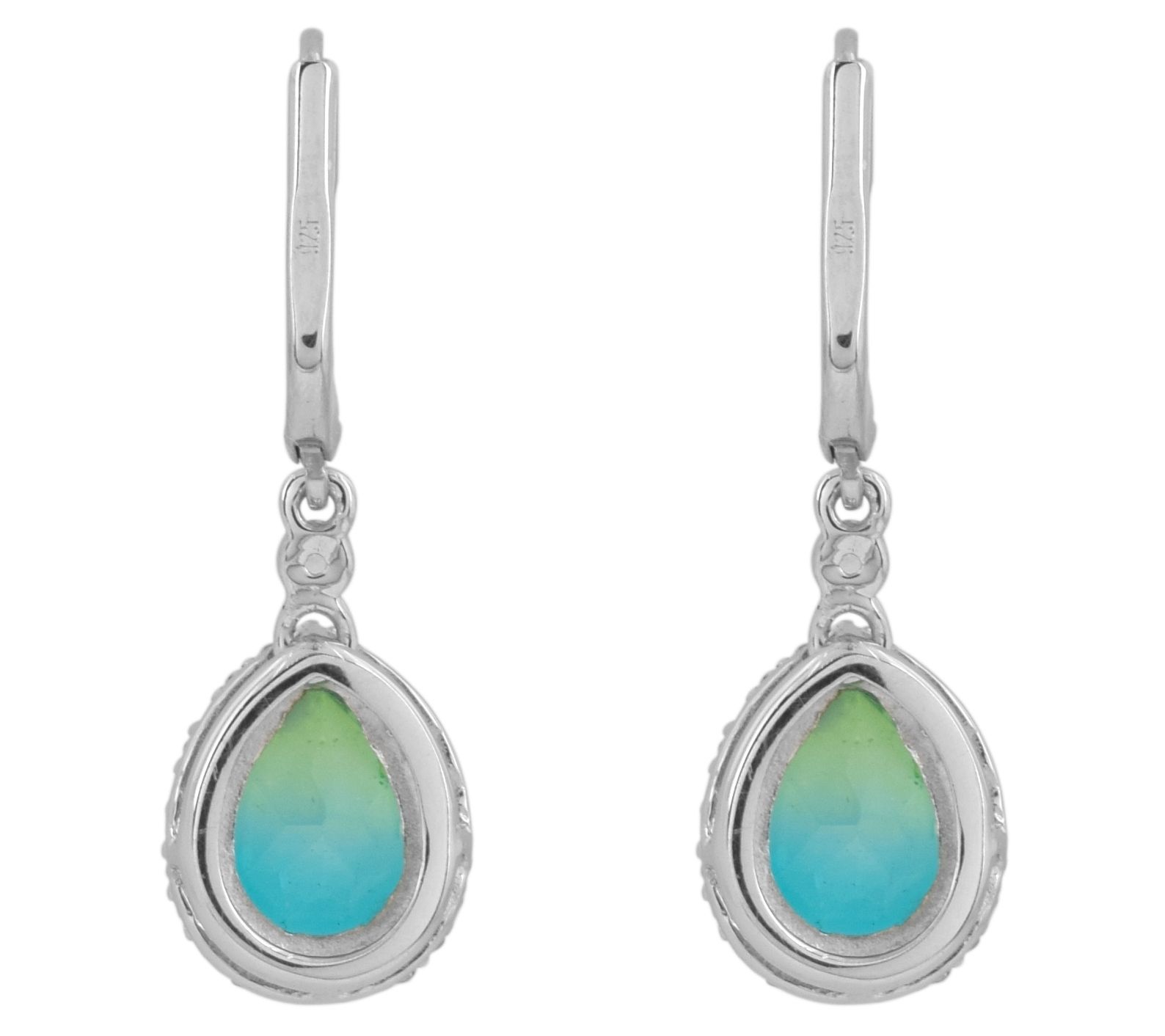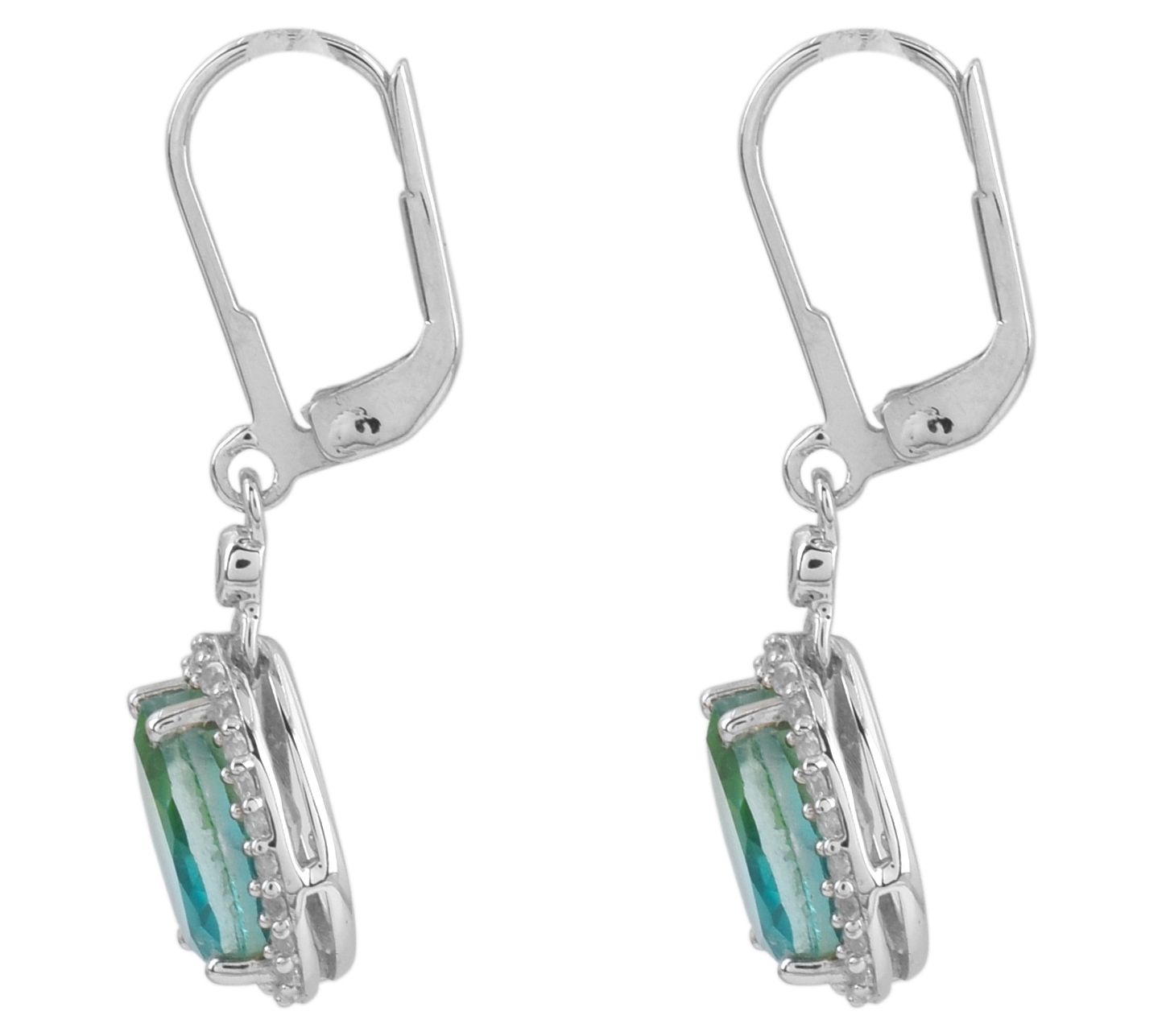 • Round-cut white topaz; pear-cut doublet aurora borealis mystic quartz; prong and pave settings; platinum plating