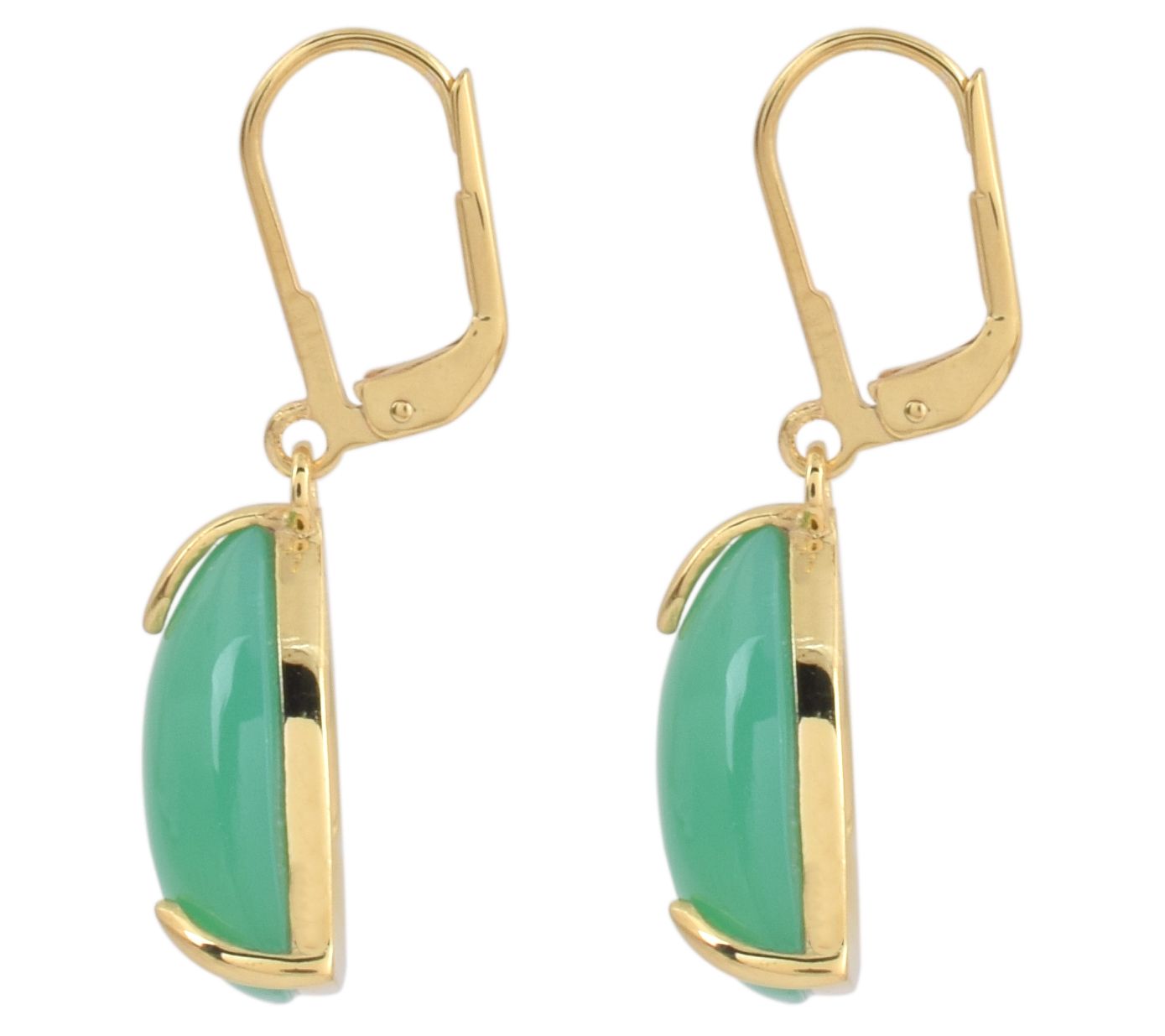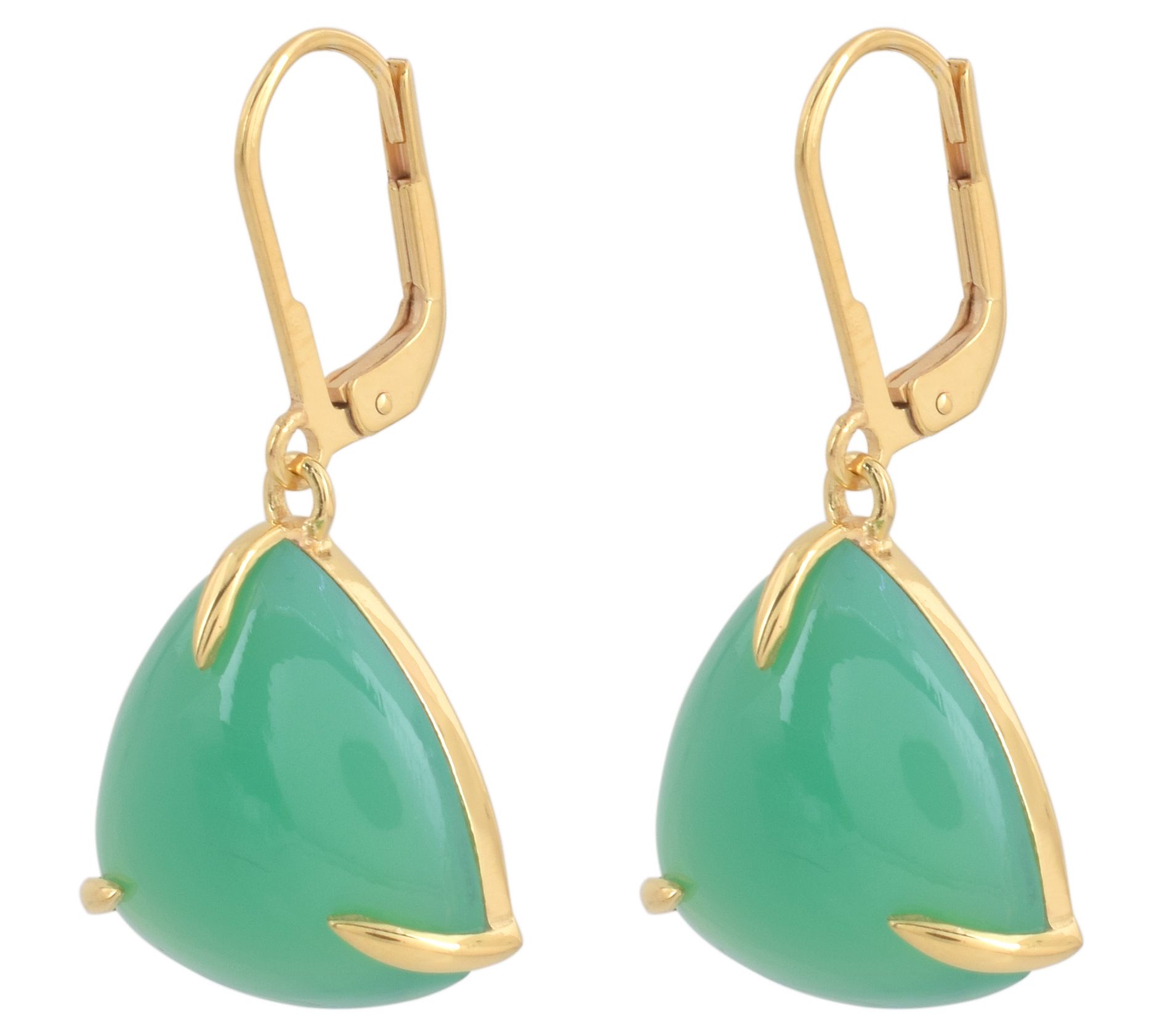 Elevate your elegance with Affinity Gems trillion chalcedony earrings. These stunning dangle earrings feature chrysoprase-colored chalcedony cabochons, prong set in 14K gold plating. Perfect for pierced ears, they secure with lever back closures. From Affinity Gems.