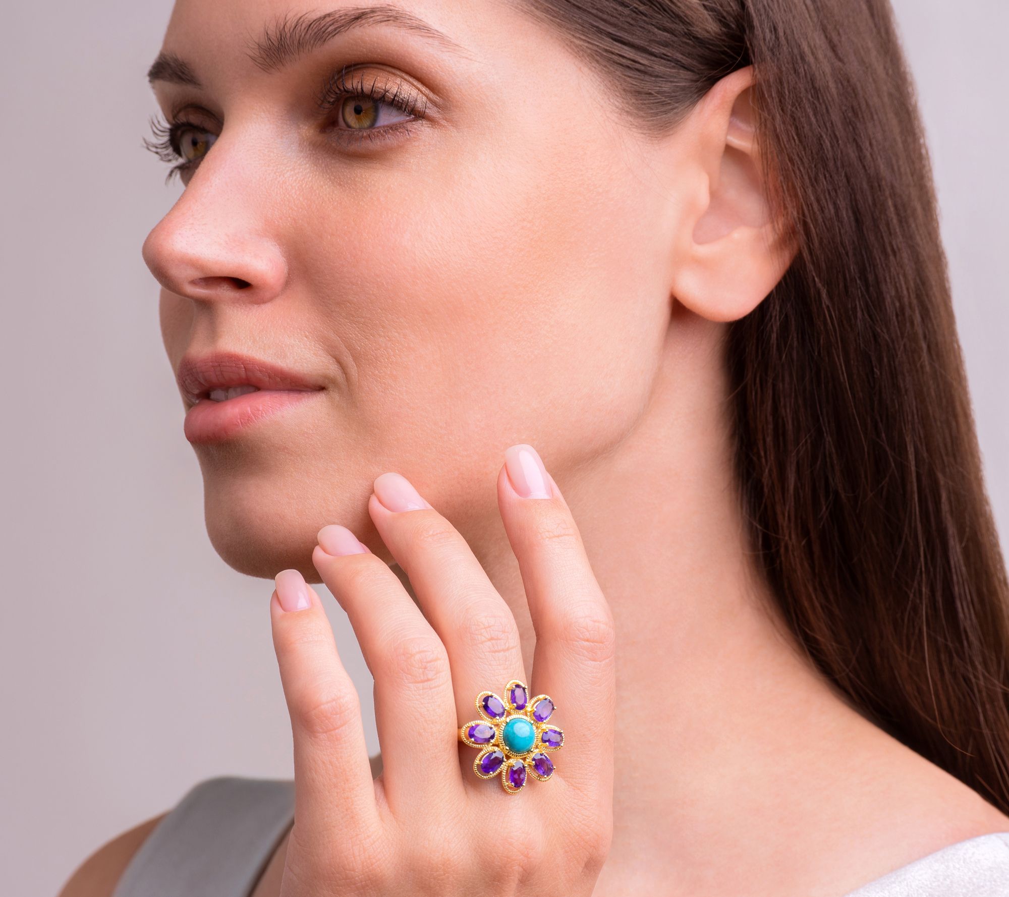 Dazzle in the beauty of nature with the Affinity Gems Turquoise and Amethyst Flower Ring, where the vibrant hues of stabilized turquoise and African amethyst come together in a stunning floral design. Set in 18K gold-plated sterling silver, this piece captures the essence of spring's bloom on your finger. From Affinity® Gems.