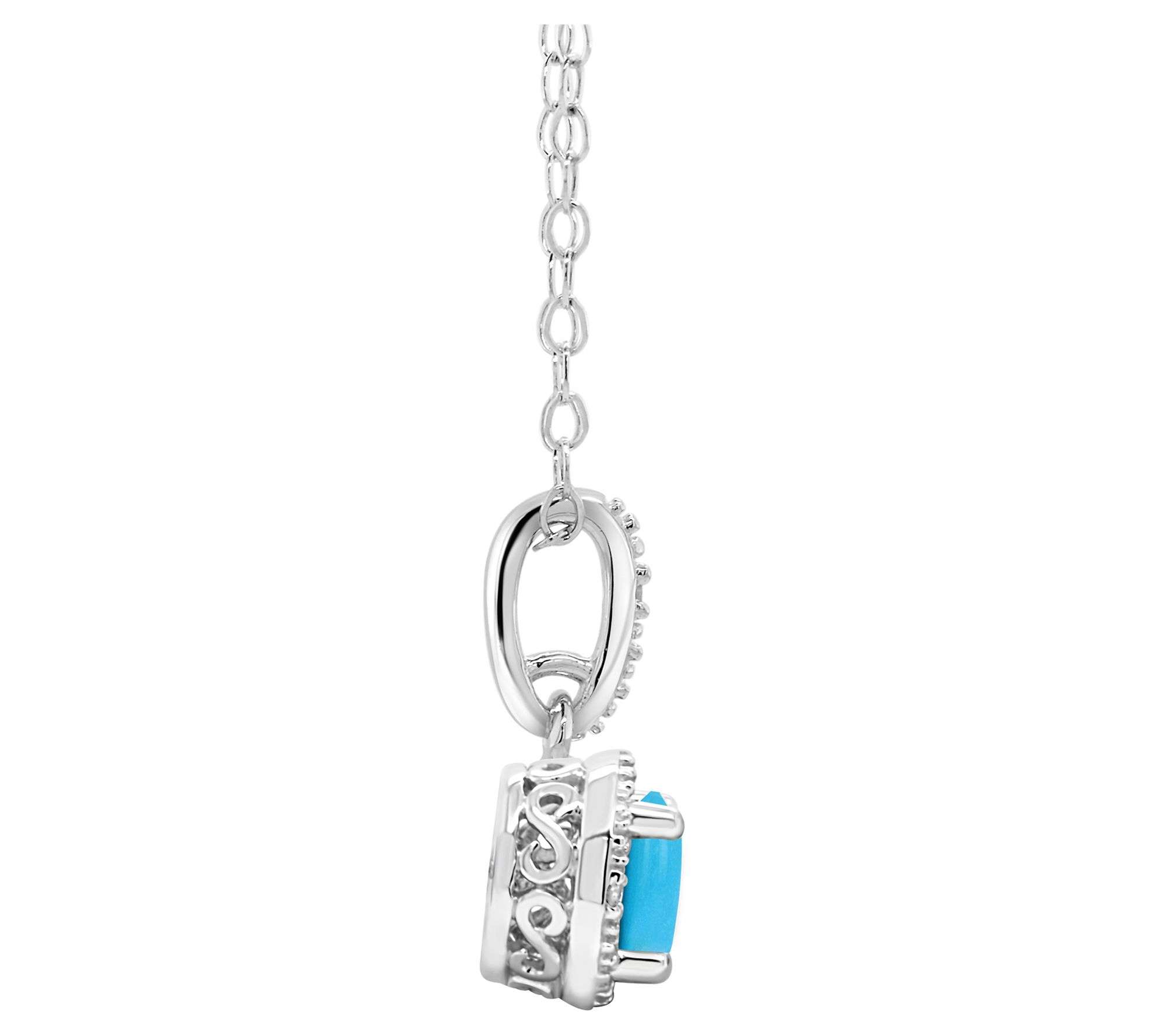 - Round prong-set turquoise pendant with diamond-outlined frame and bail