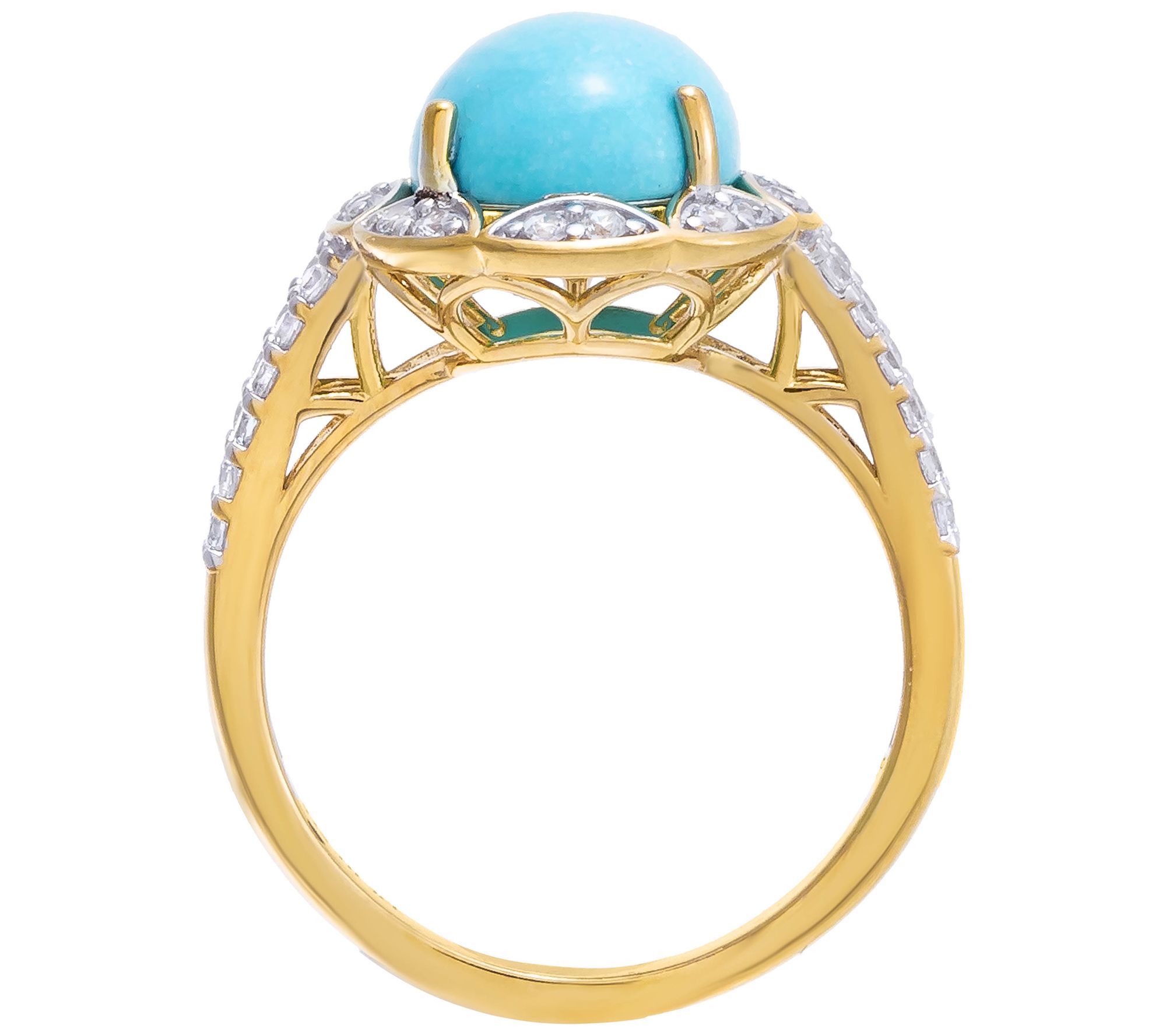 Oval-cut, prong-set Kingman turquoise cabochon center with round-cut, halo-set white zircon gems; split shank outlined in round-cut, prong-set white zircon gemstones