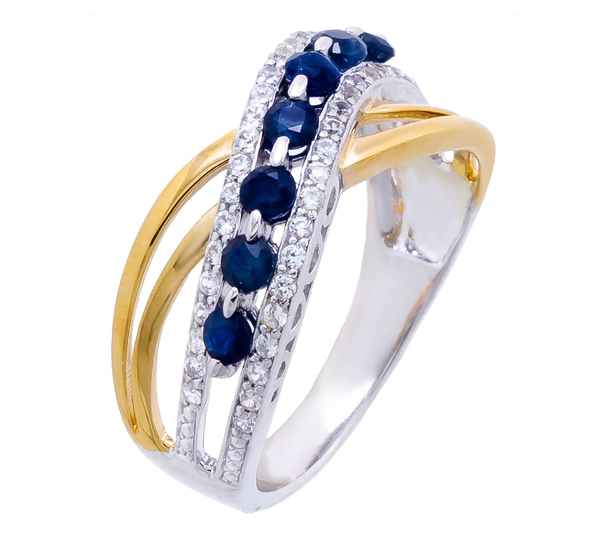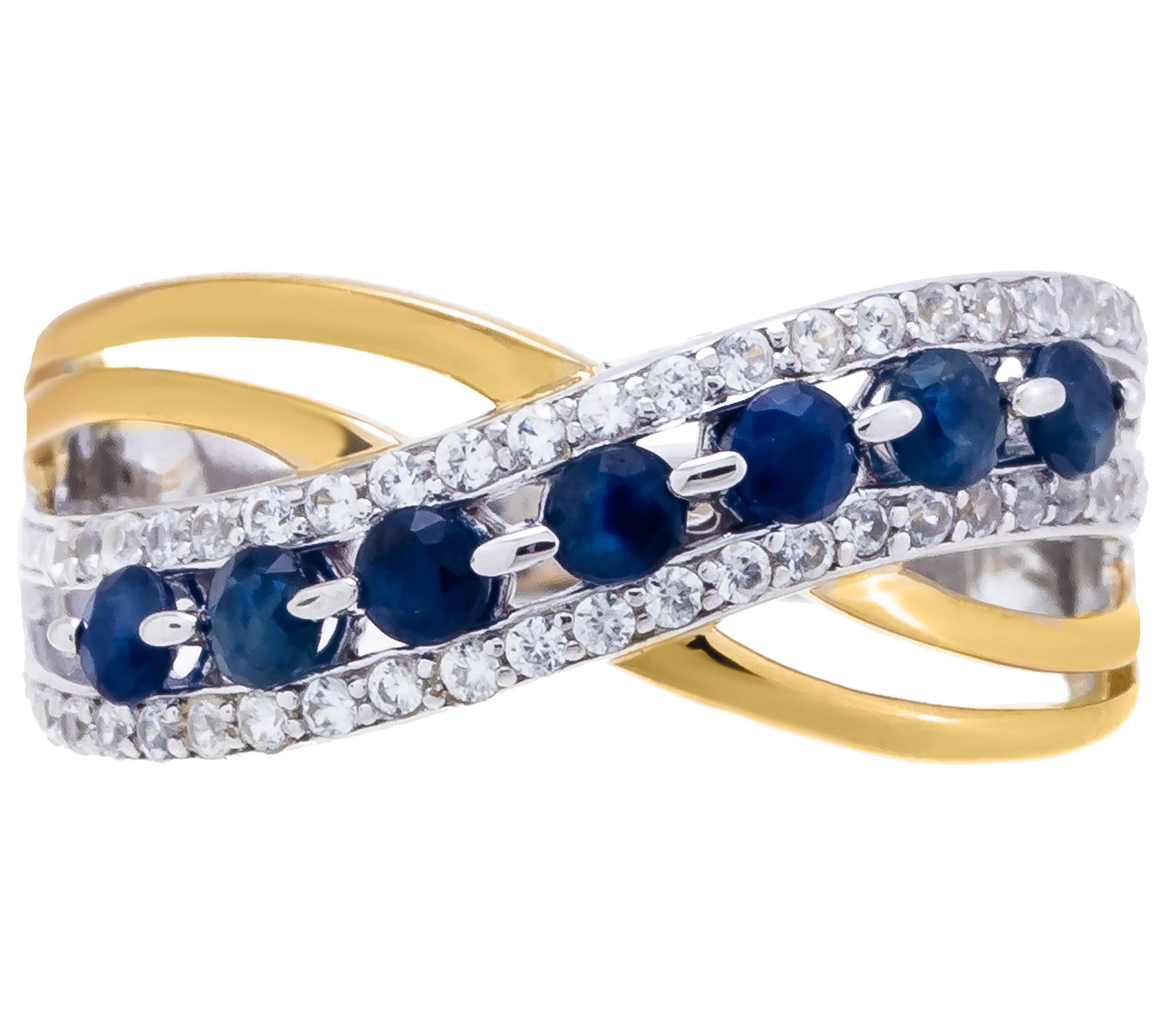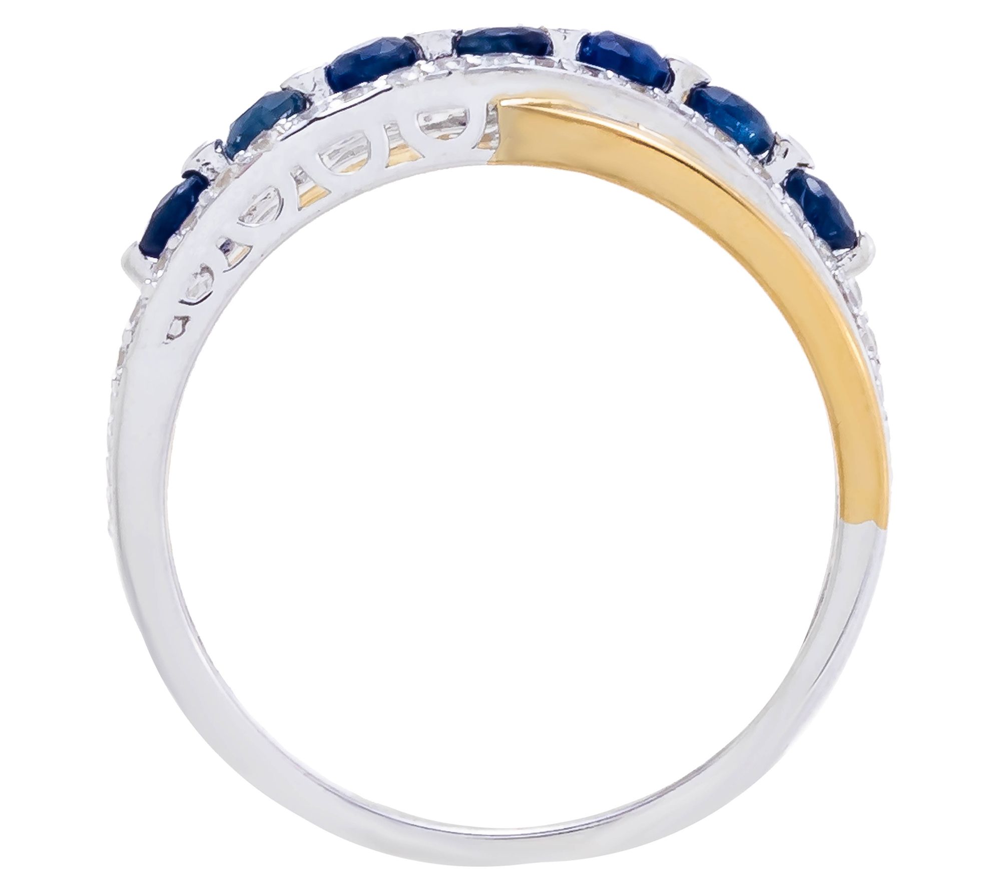 • Two-tone band ring with round-cut, prong-set sapphire center gemstones with round-cut prong-set white zircon stones outlining the top and shank