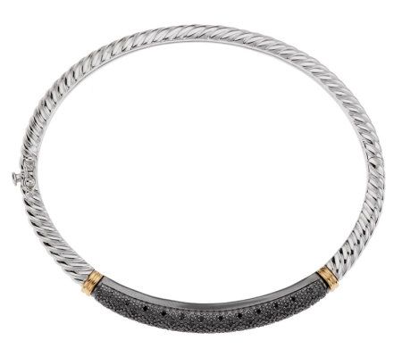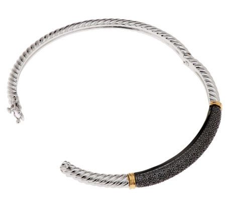 You're a woman with distinctive style. And this sterling silver bangle reinforces that fact. Bead-set, round black diamonds are complemented by 14K yellow gold-clad sterling silver accents. The polished and twisted rope texture is intricate and lovely. From Affinity(R) Diamond Jewelry.