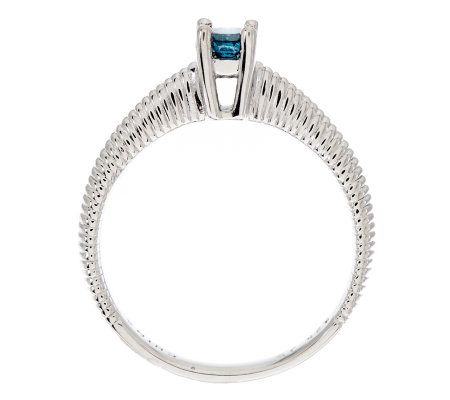 • Round, prong-set colored diamond; knife-edge textured ring design; highly polished back