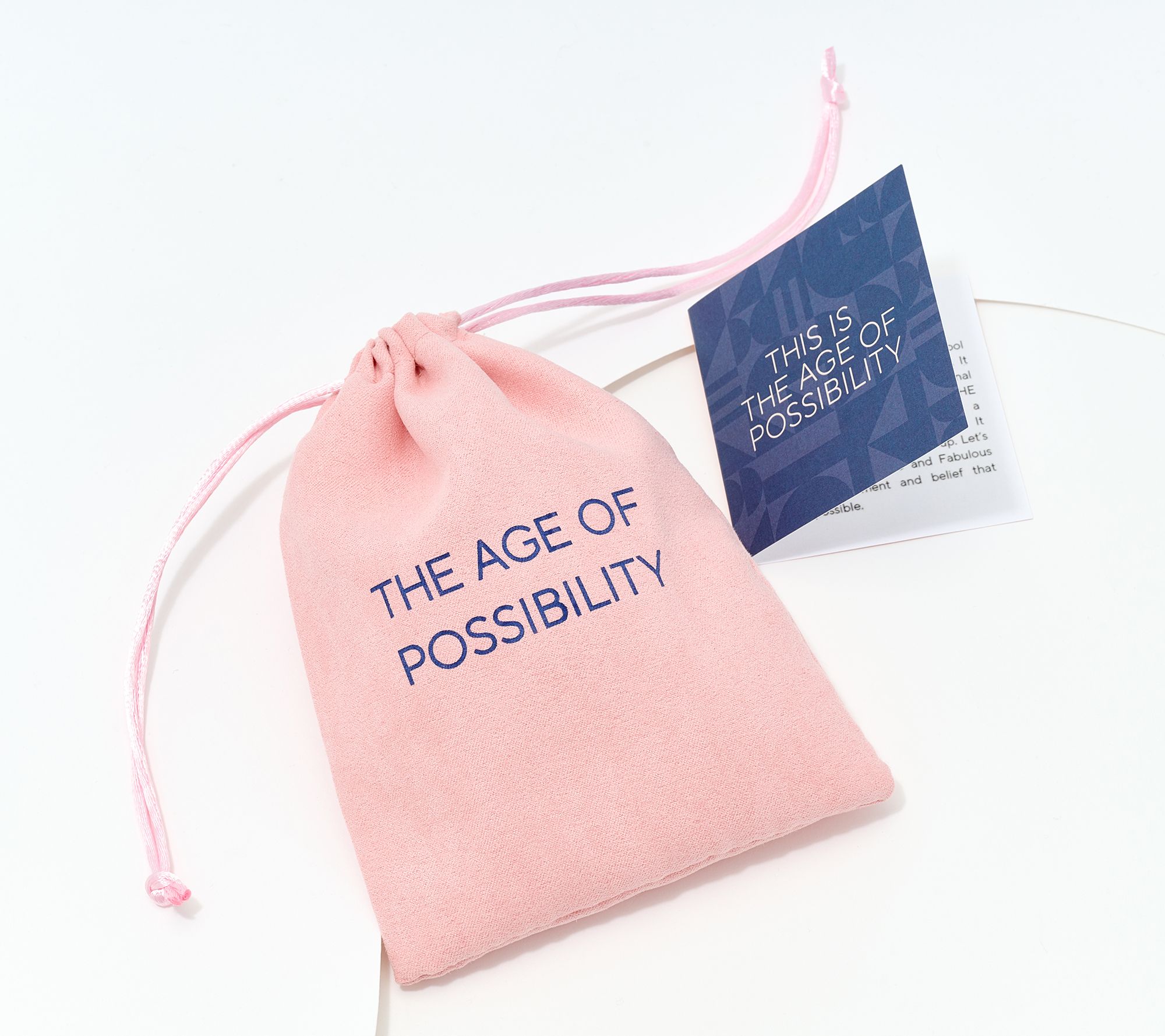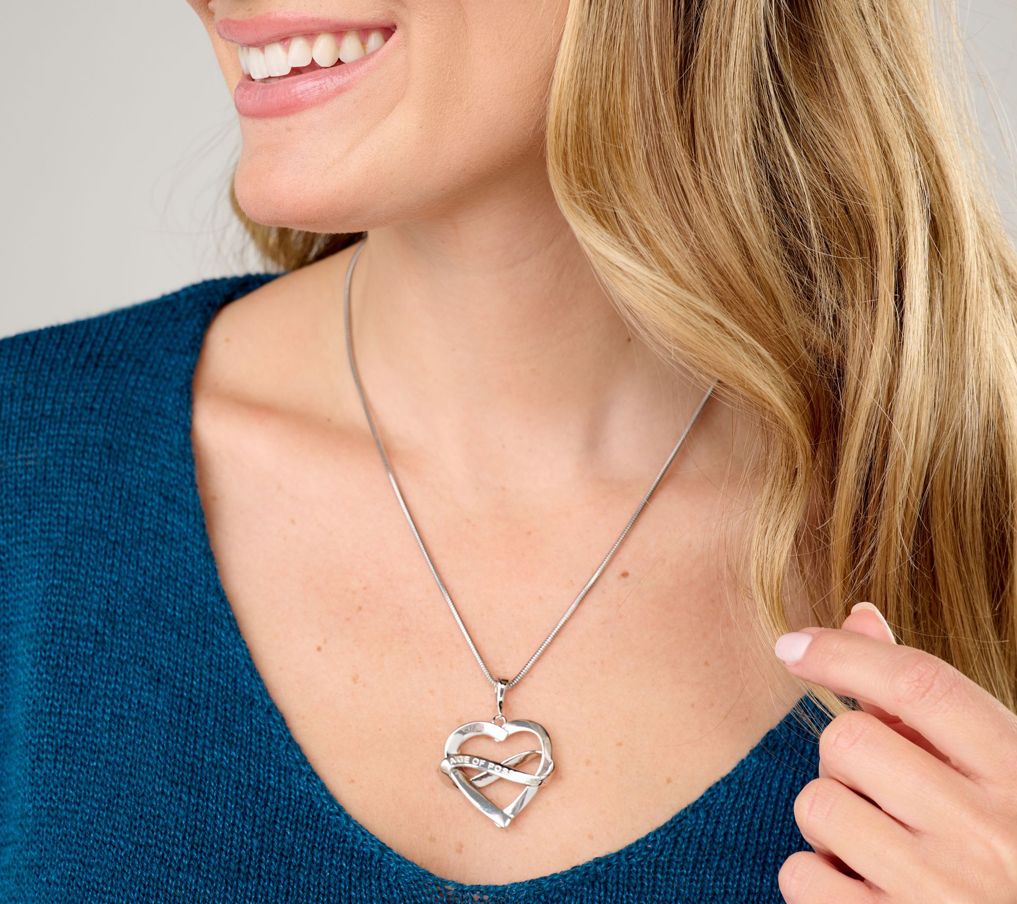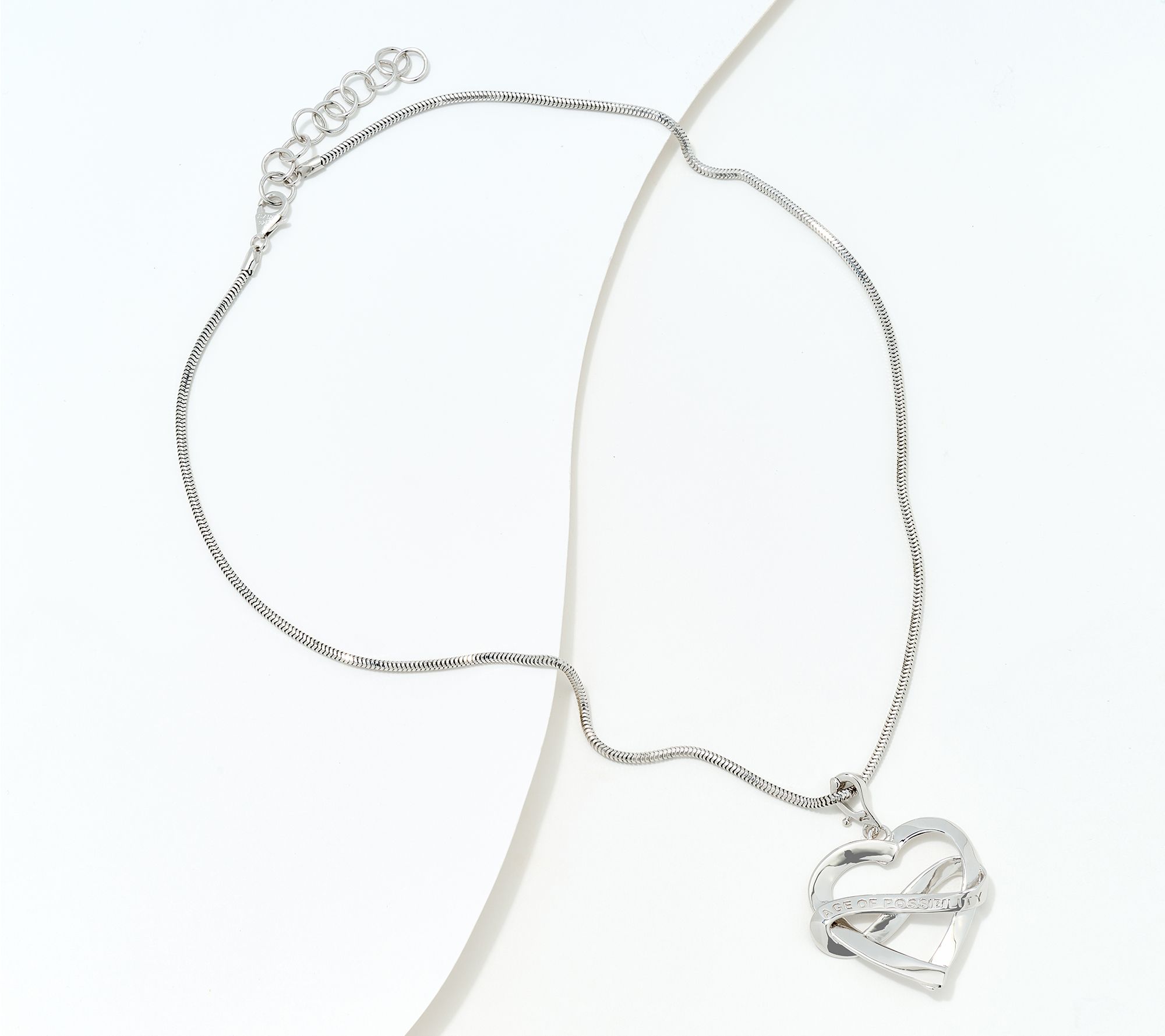 • Heart-shaped pendant; "AGE OF POSSIBILITY" engraving; twisted infinity symbol at center; polished finish; movable bail