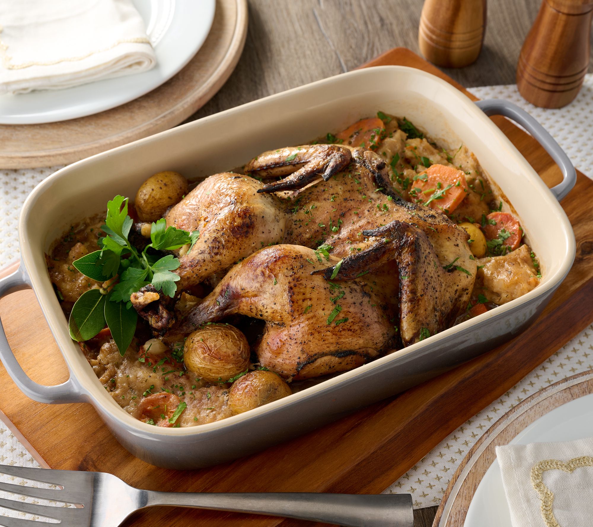 • Includes two 3-lb spatchcock chickens with dumplings, vegetables, potatoes, and gravy