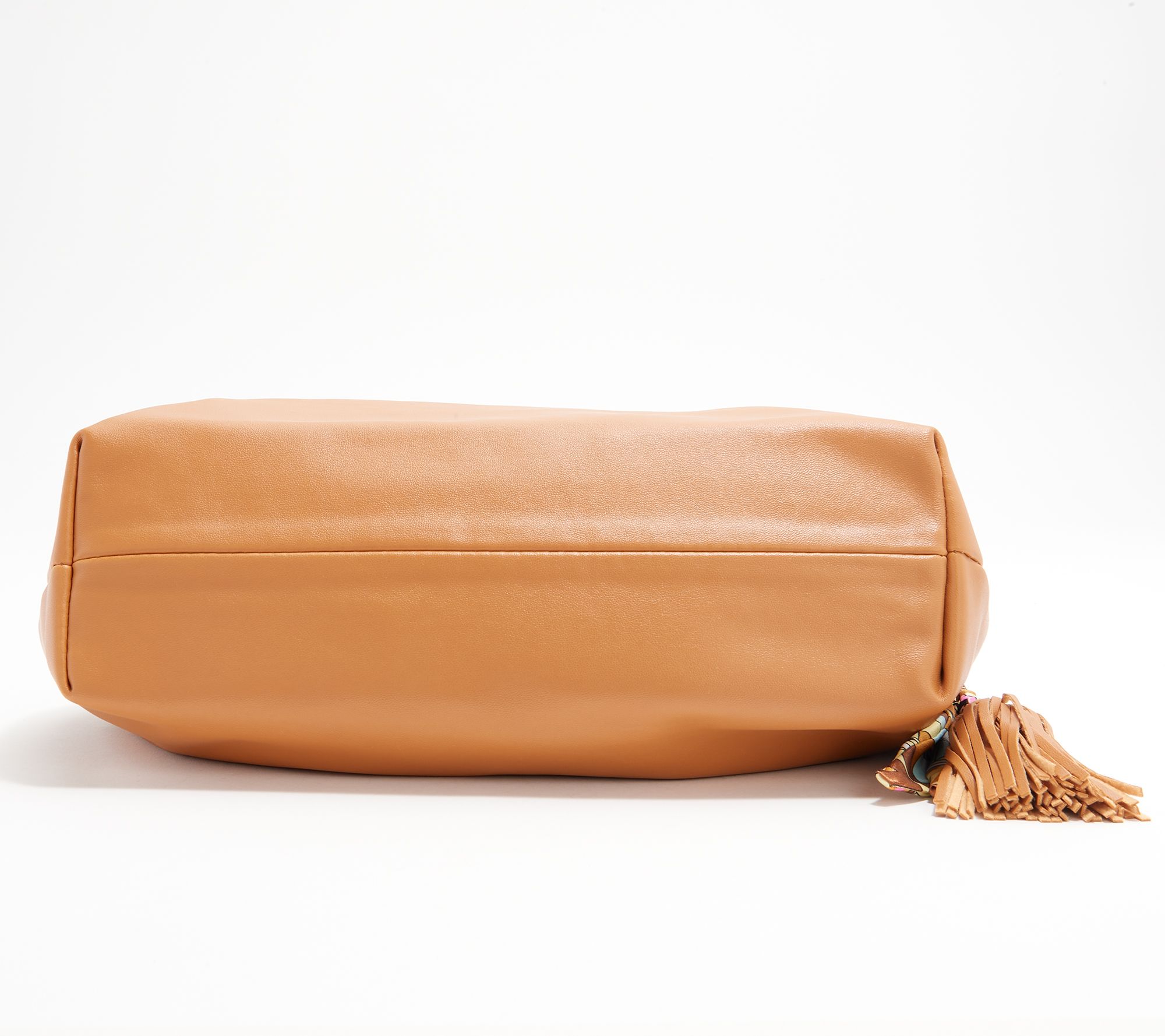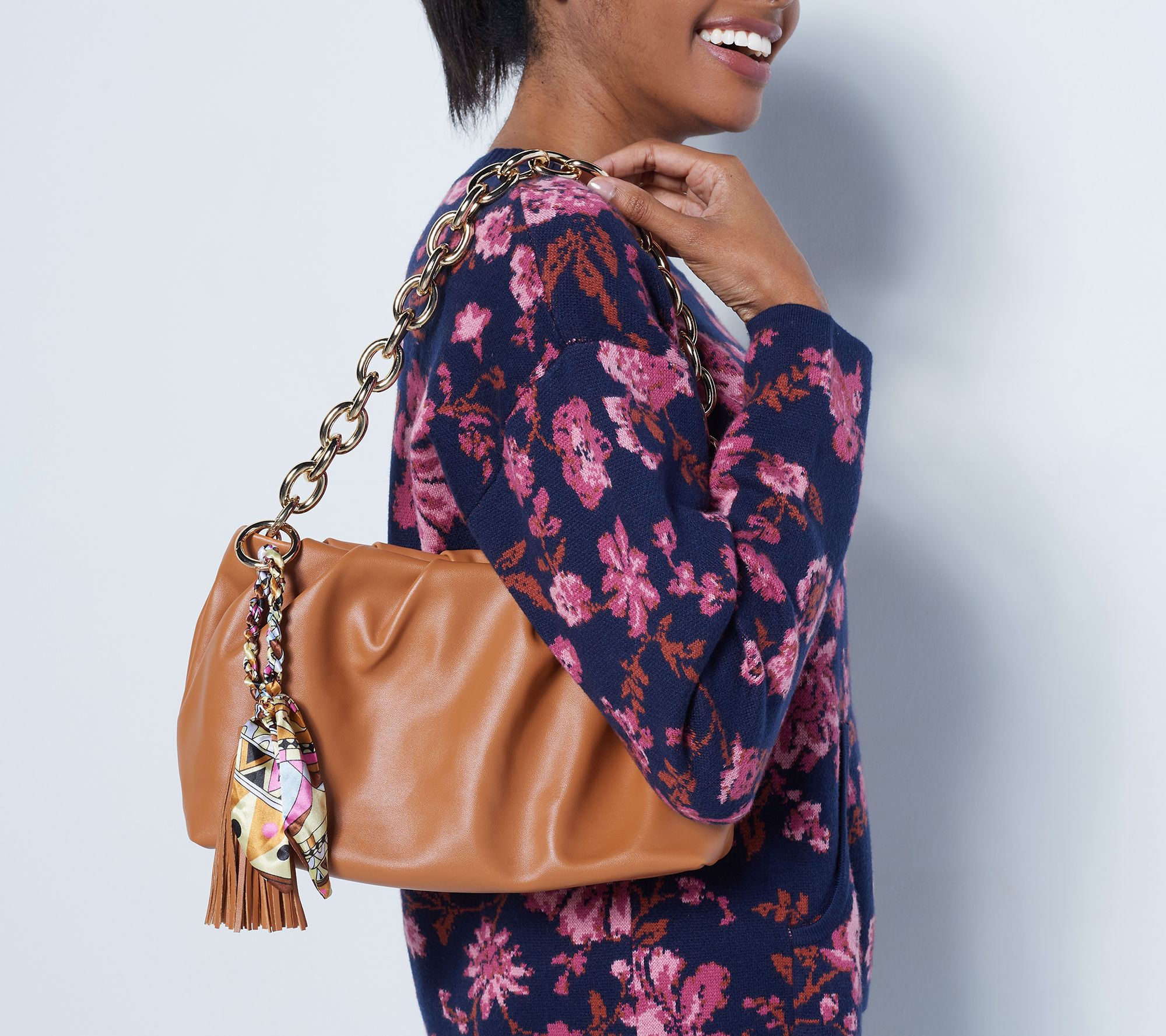 • Faux-leather body, ruched design, zipper closure, metal chain strap, scarf-print tassel