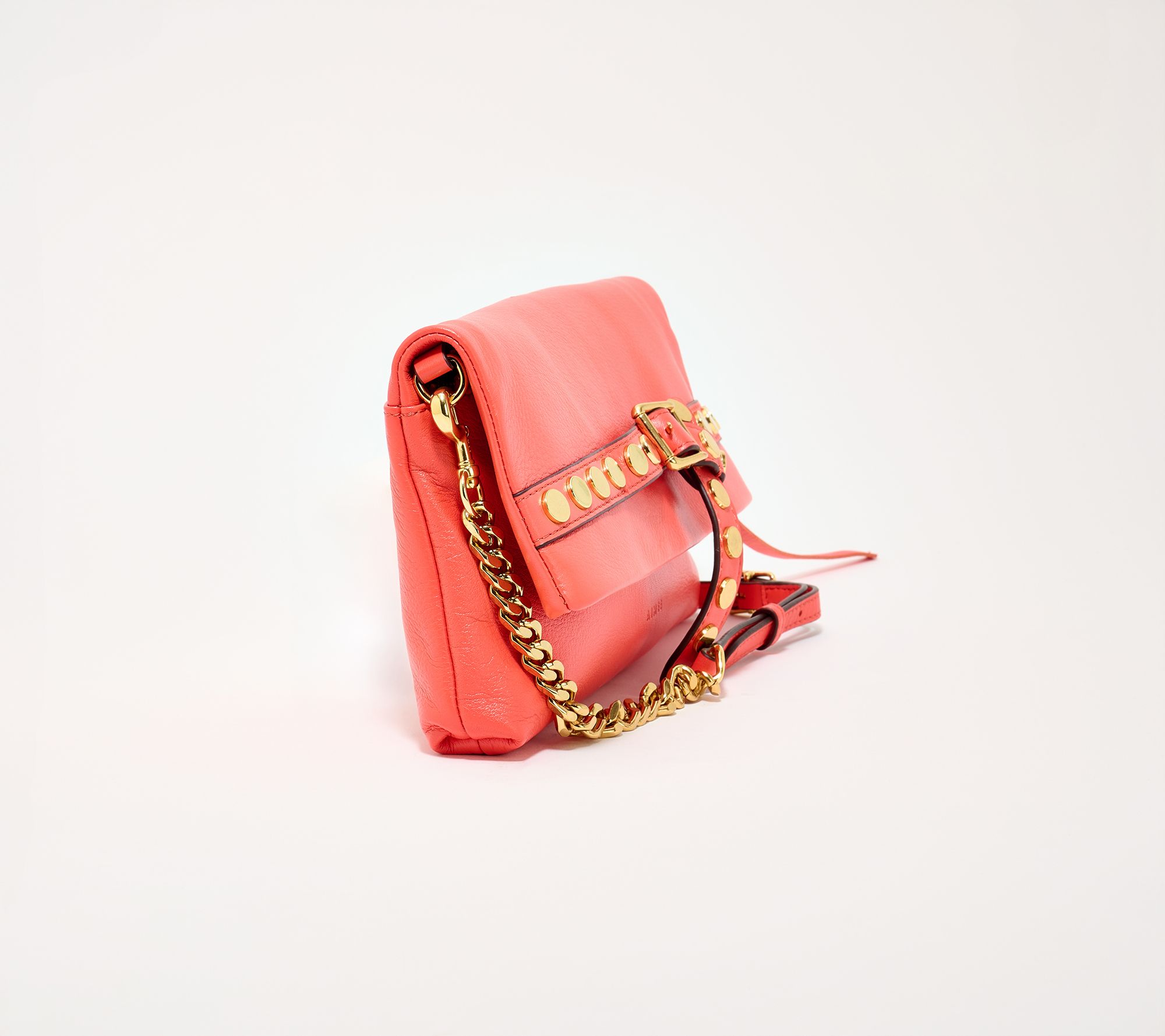 • Removable and adjustable chain and leather crossbody strap, open flap with magnetic snap closure and hidden pocket in flap, zipper at main entry, back slip pocket, studded belt for decorative detail