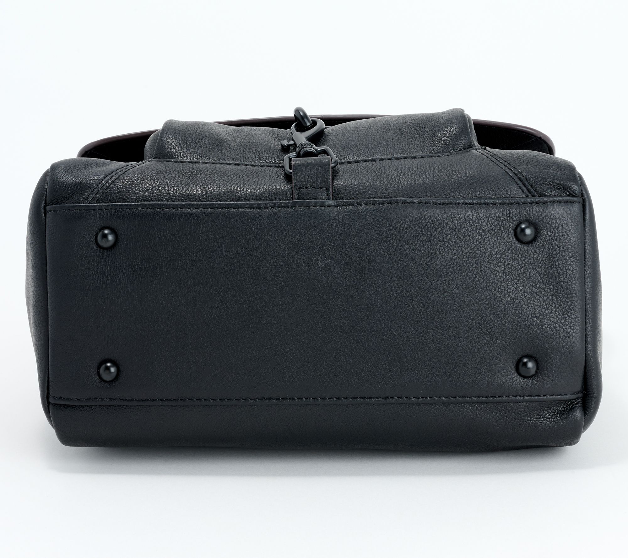 Glove-tanned leather, signature branded hardware, back slip pocket with magnetic snap, slip pocket under front flap, magnetic snap at main entry, dog clip and D-ring
