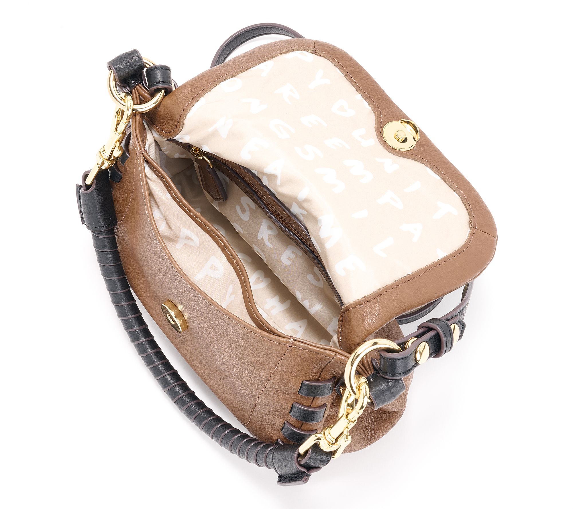 • Whipstitching, magnetic snap at main closure, dome stud feet, back slip pocket with magnetic snap, adjustable and removable crossbody strap, top handle