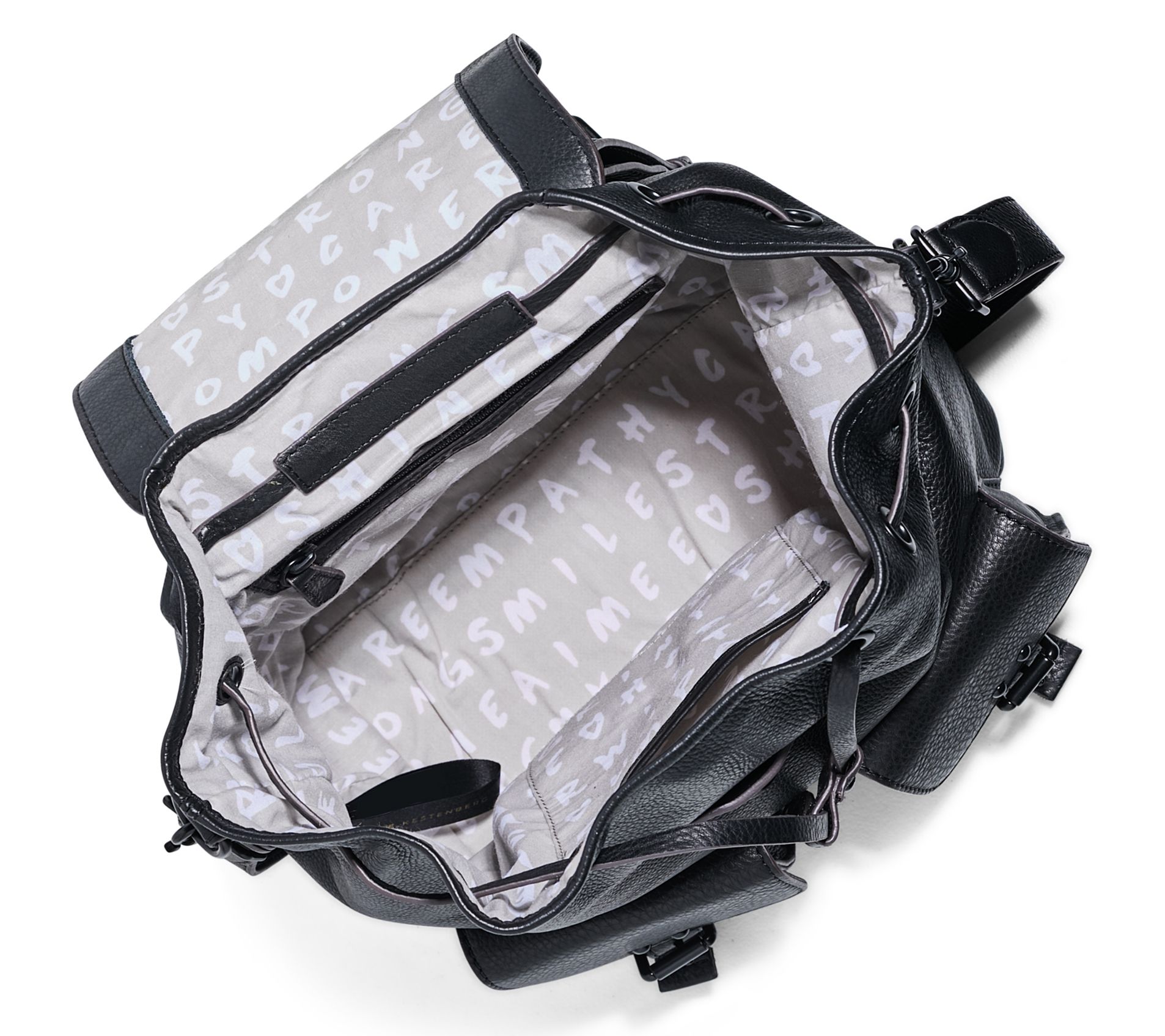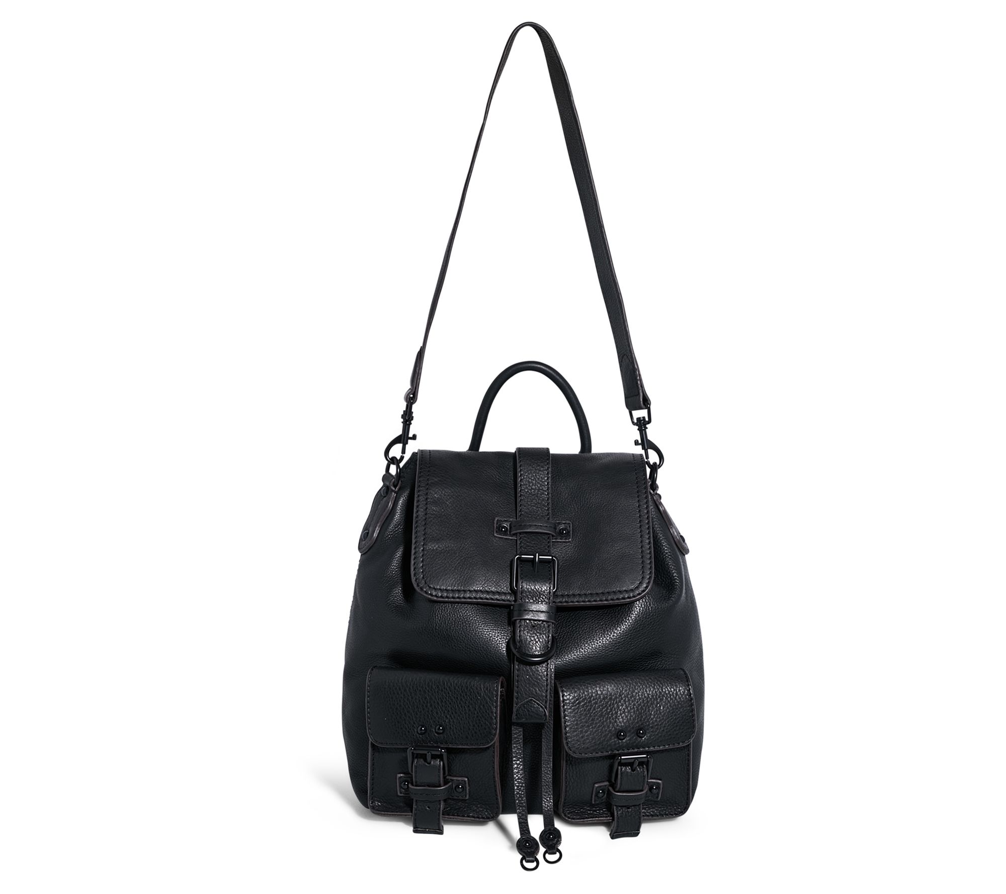 Two front pockets with magnetic snaps and faux buckles, back slip pocket with magnetic snap, removable shoulder strap, top handle, adjustable backpack shoulder straps, magnetic snap with faux buckle and drawstring at main opening, dome stud feet