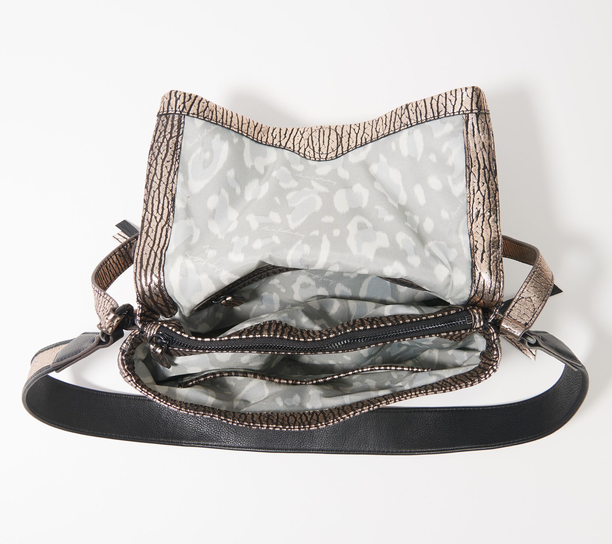 Lined interior, center zip divider, two slip pockets, flap pocket compartment