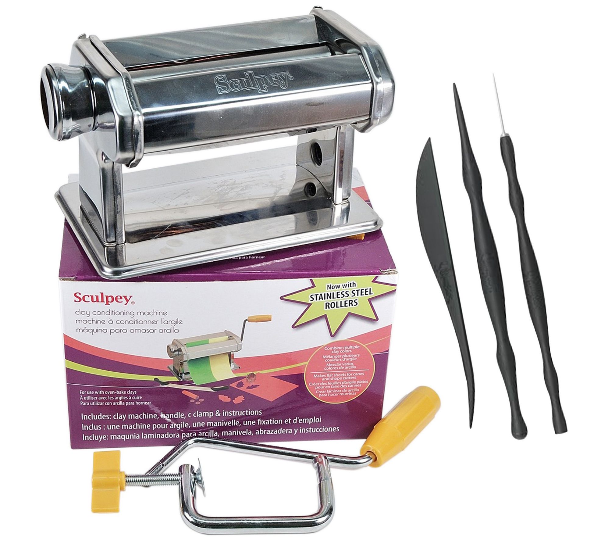 • Clay machine: corrosion-resistant stainless steel rollers, handles, nine different thickness settings, nonskid feet, and C-clamp