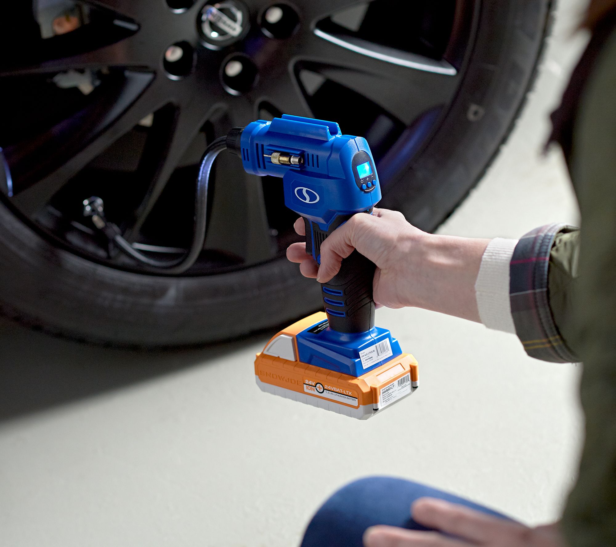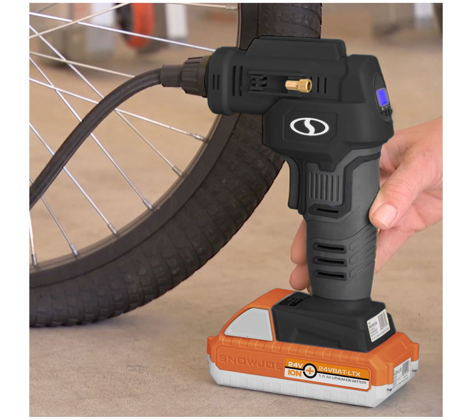 Includes 24v-AJC-LTX air compressor, rechargeable 24V lithium-ion battery, charger, two tapered adapters, two sports ball needles, two Presta valve adapters, and storage bag