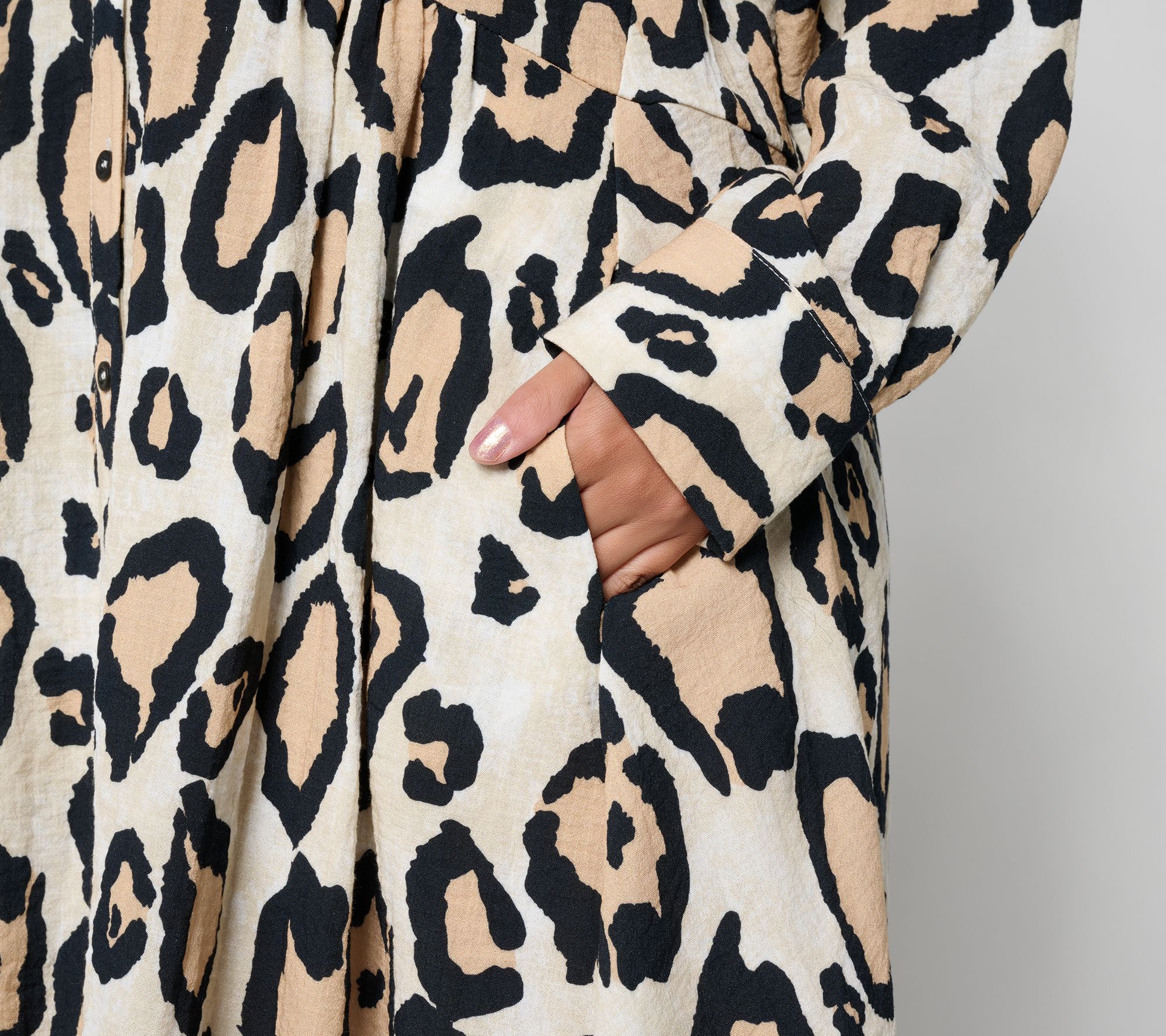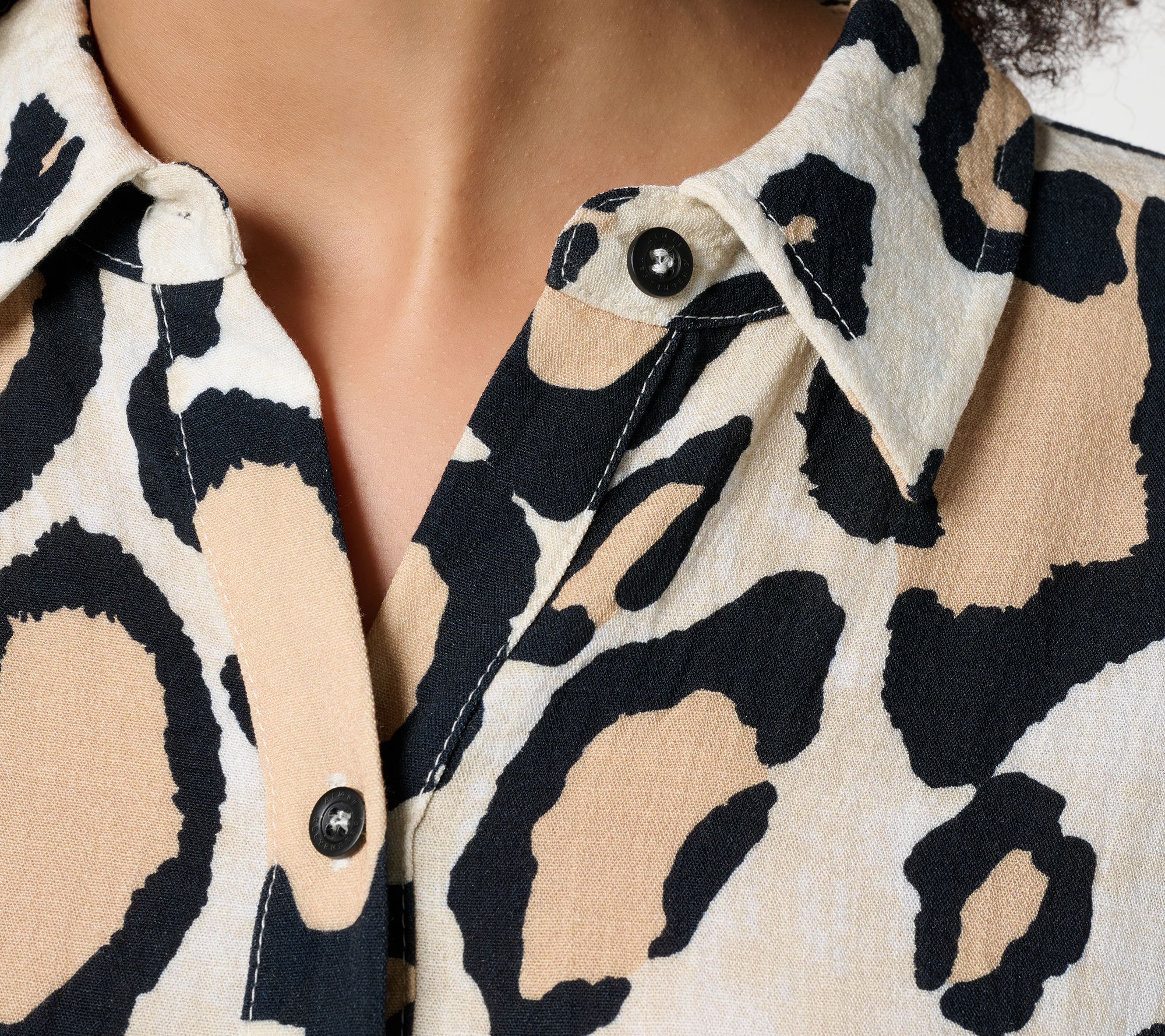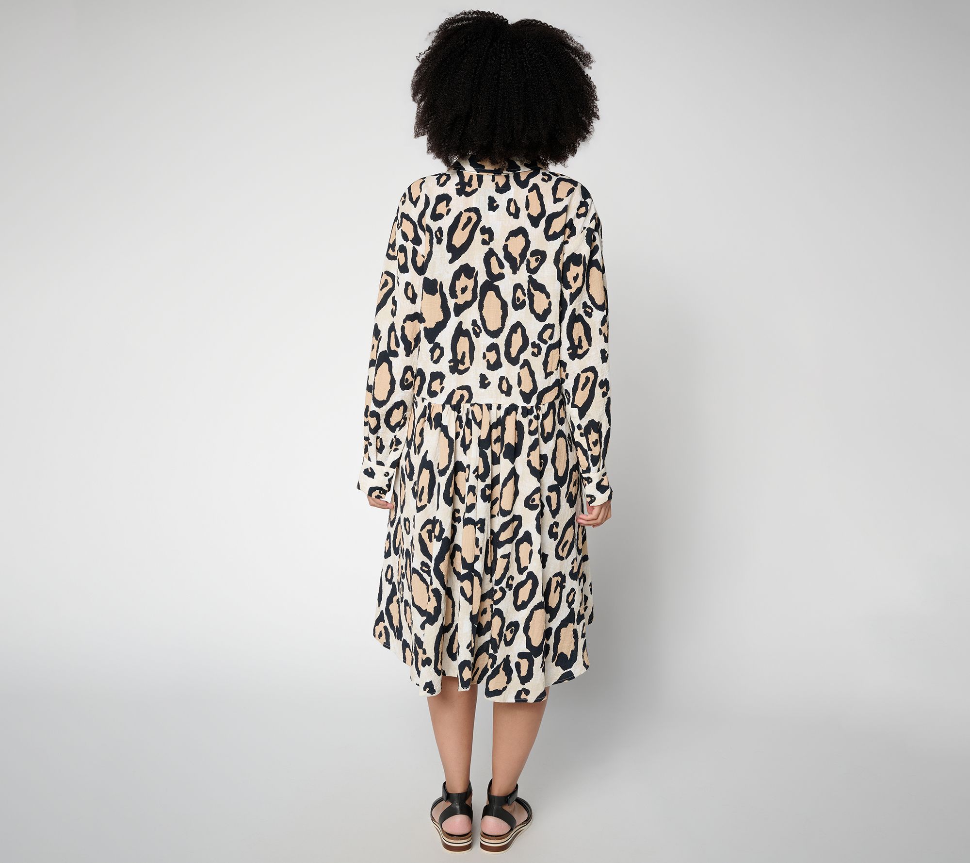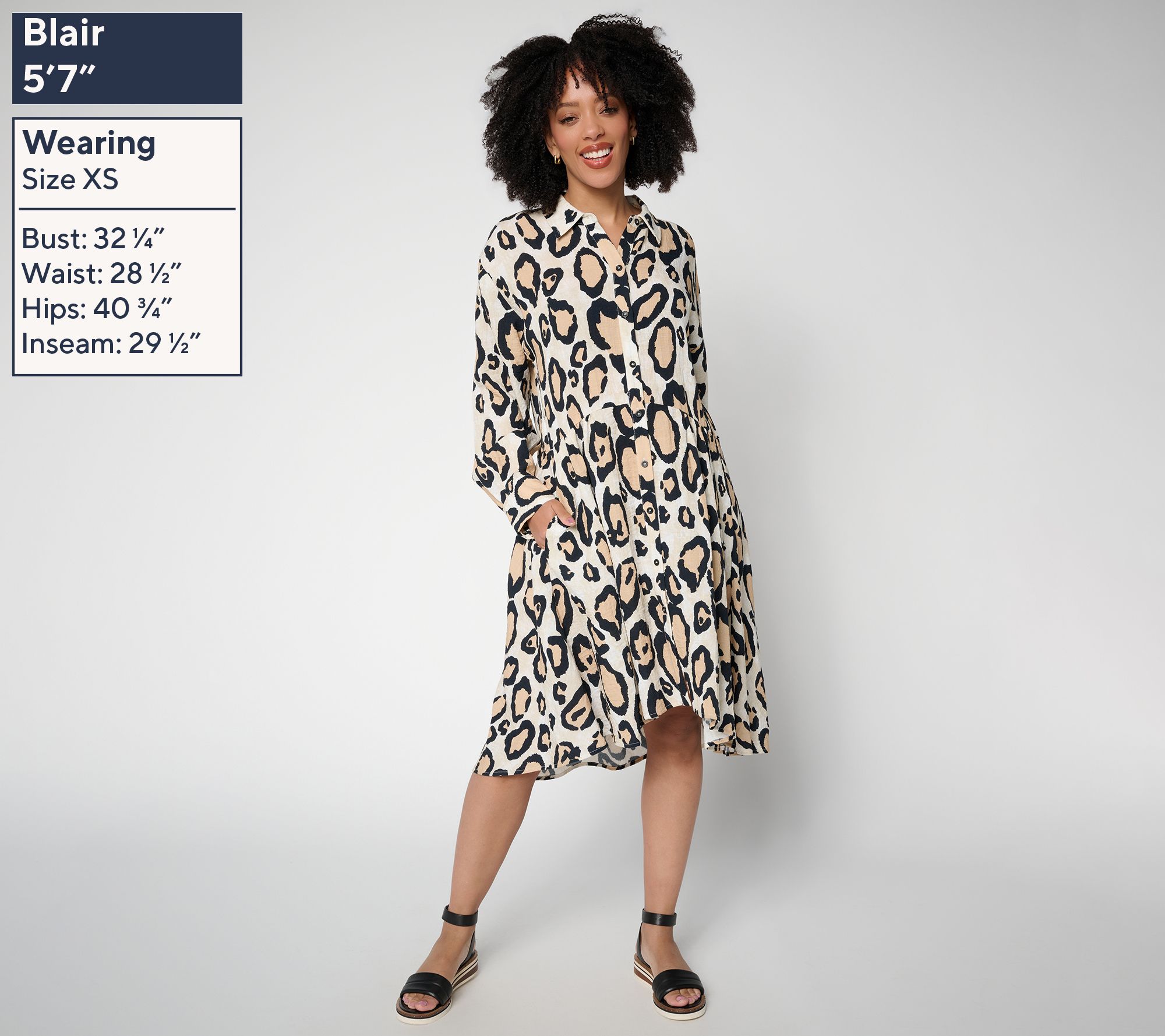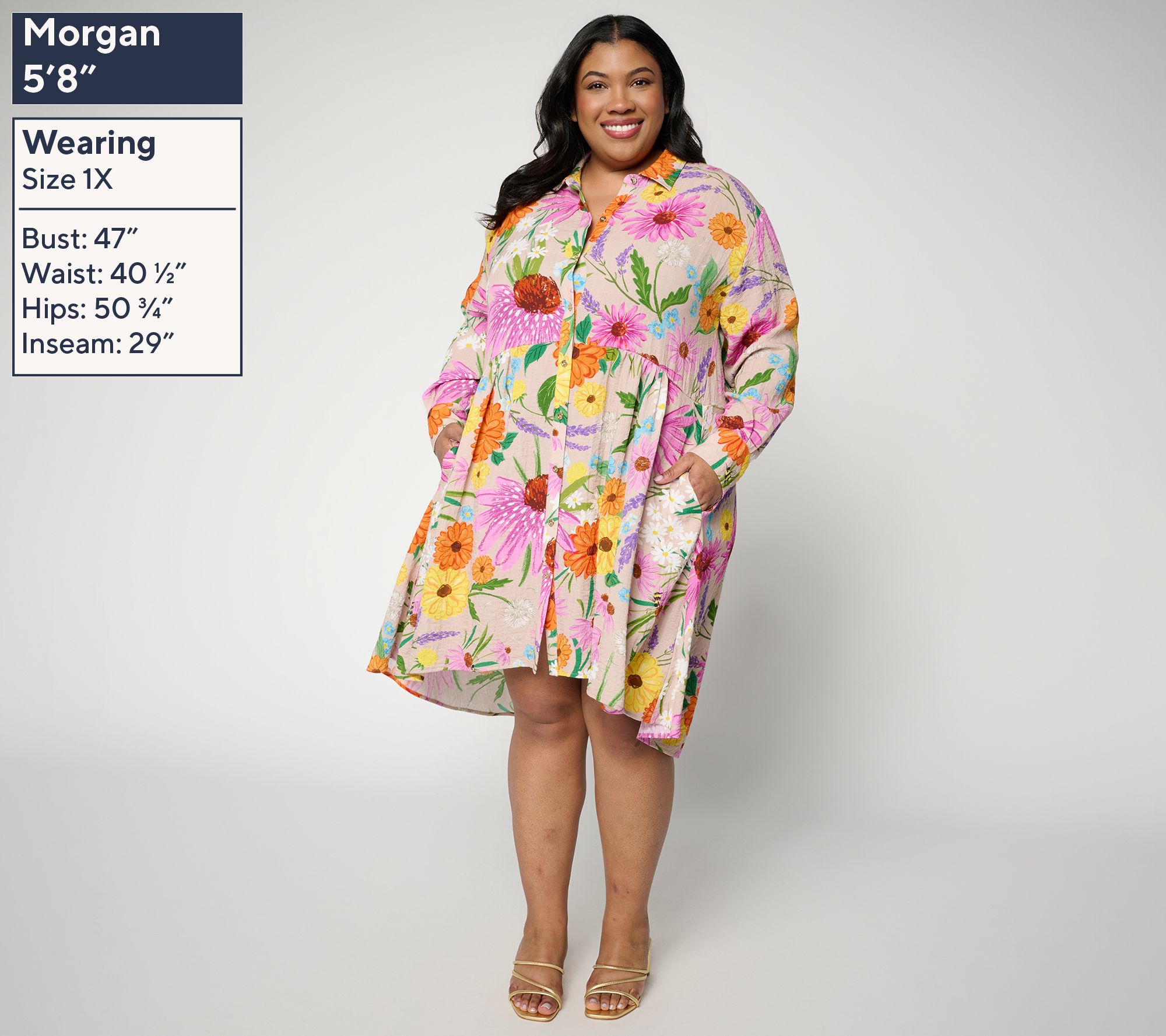 Features: allover print, button-front closure, long full sleeves, drop shoulder, dropped-waist bodice, curved hi-low hem, forward side seam with in-seam pockets, shirring into bodice seam