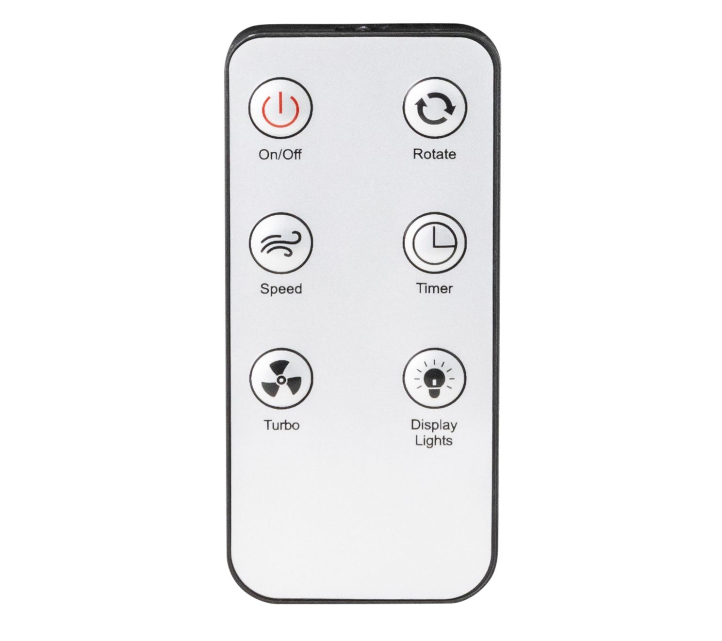 Remote: speed, rotation, timer, light, power controls; on-board storage