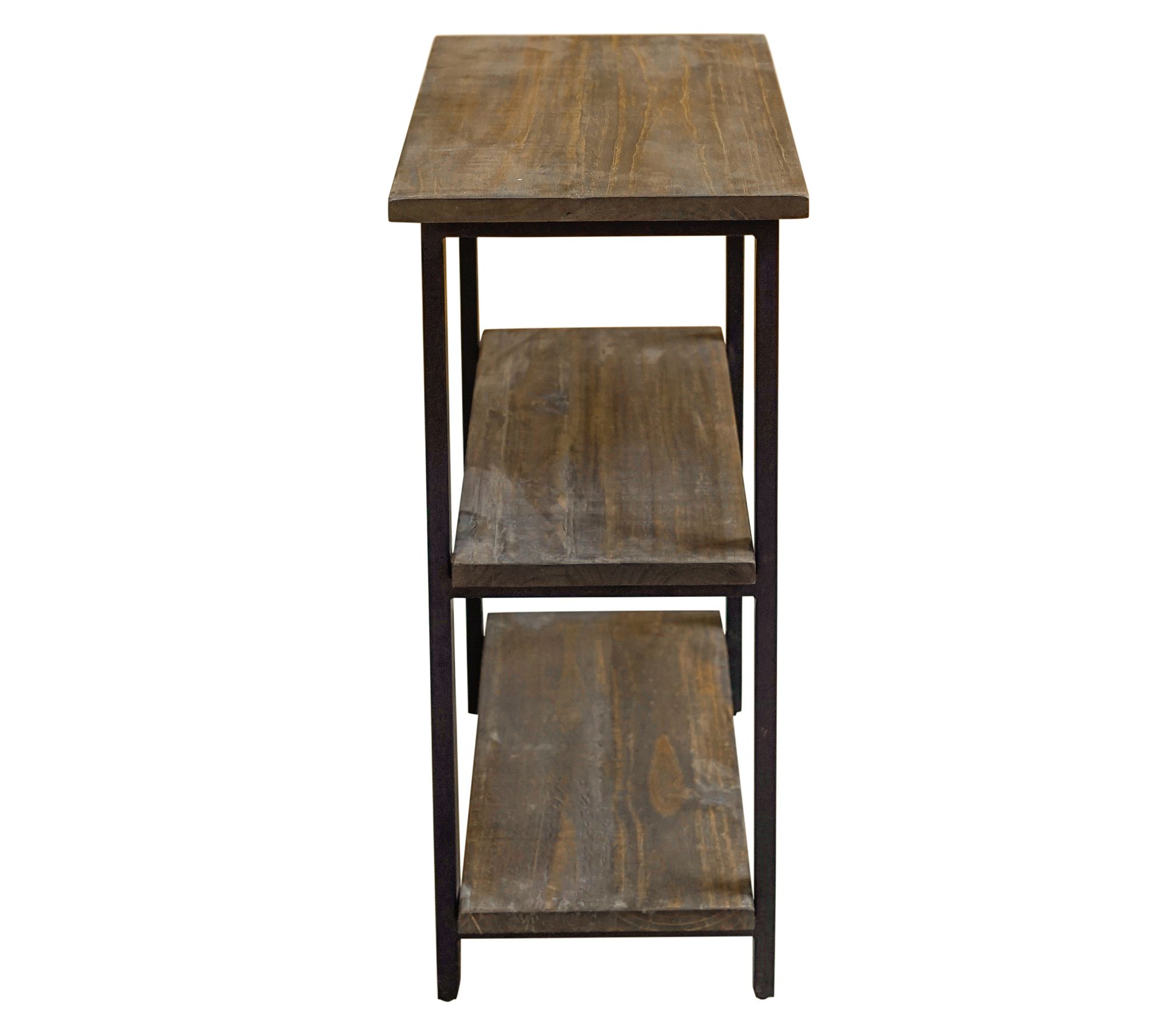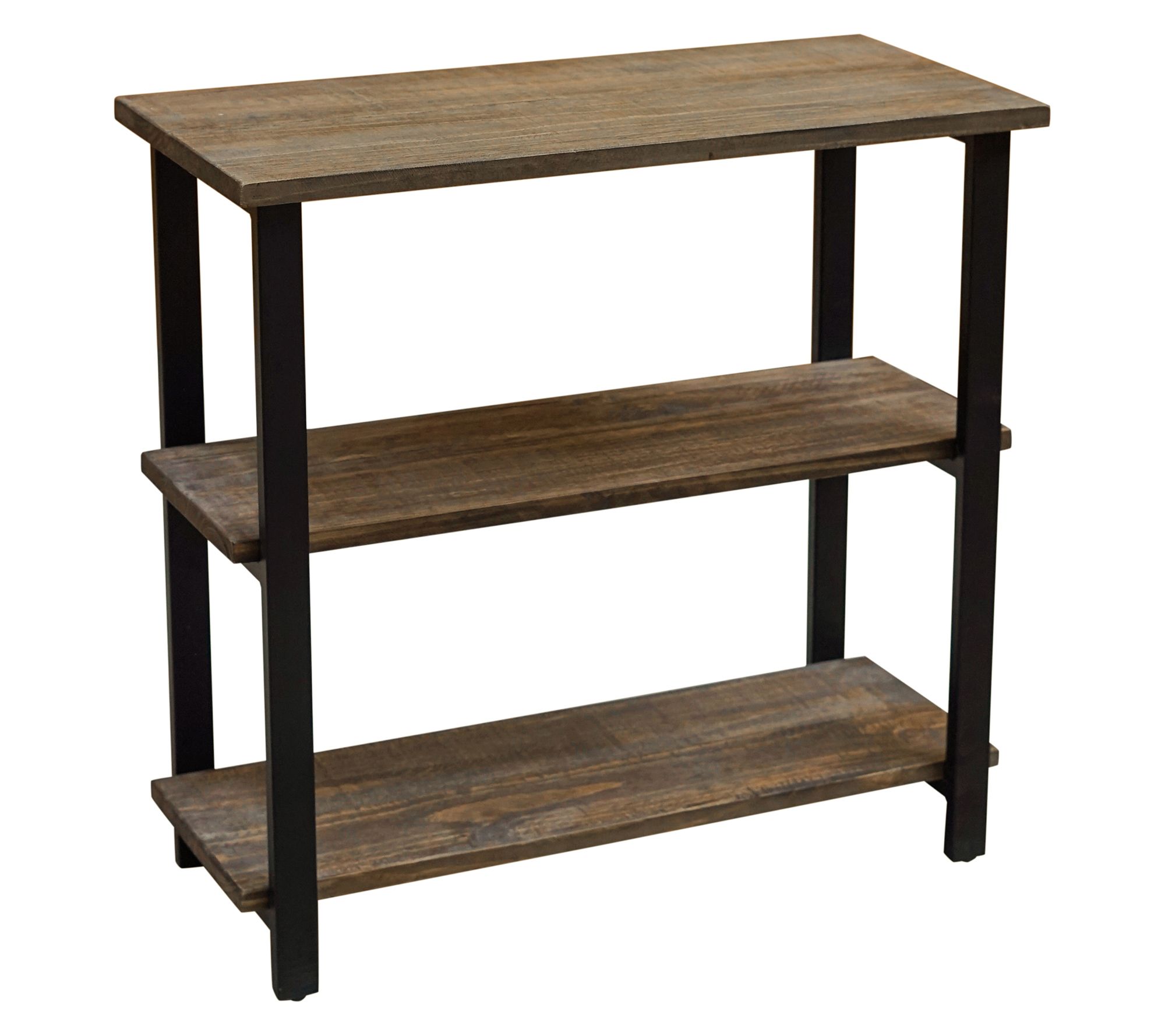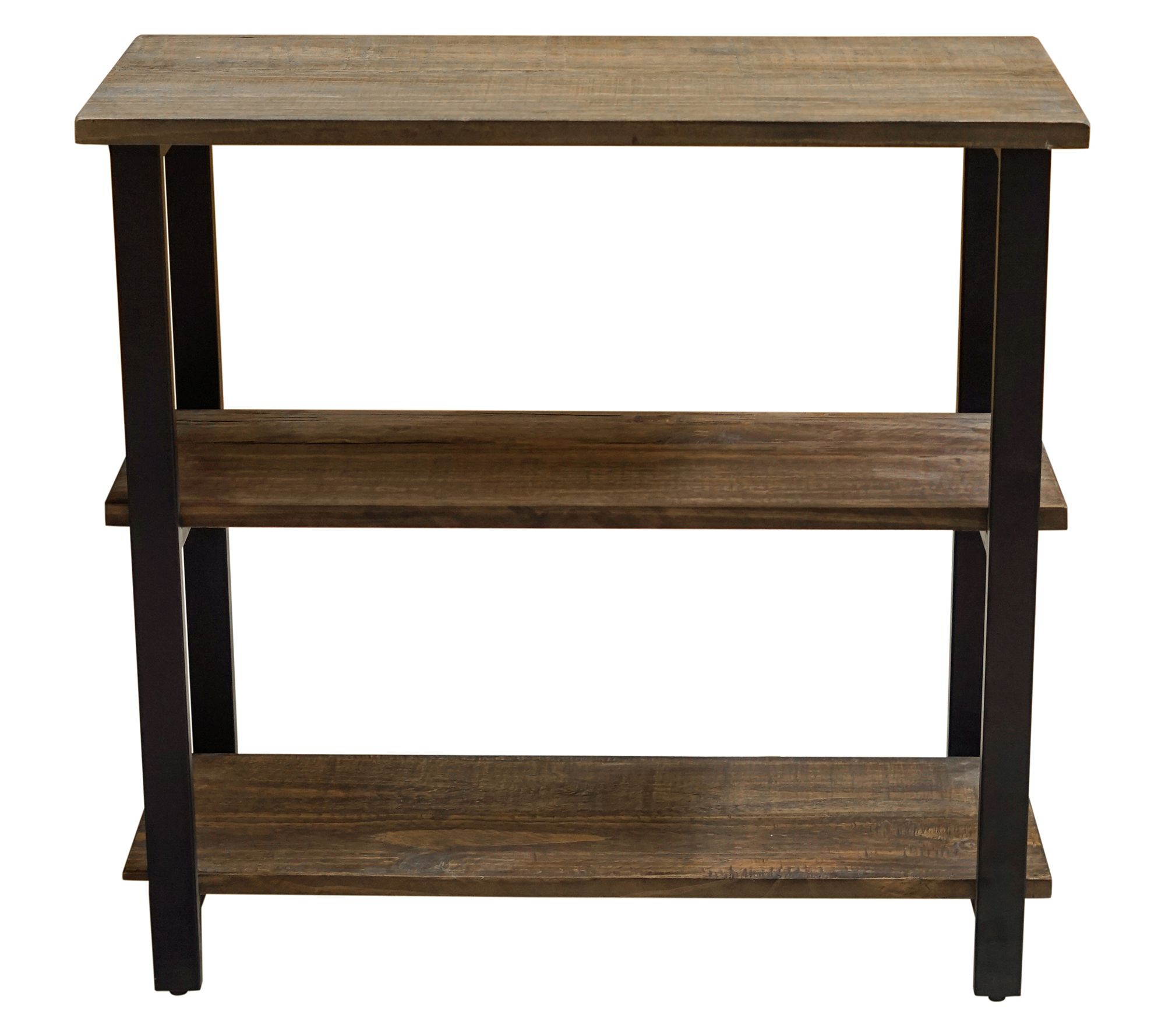 Rustic style meets versatile function with this wood and metal under-window bookcase, seamlessly fitting under your favorite window for a cozy reading nook or storing everyday essentials. The warm lacquered finish highlights beautiful natural wood grain and character, offering a welcoming accent to home offices or bedrooms. Durable construction ensures lasting appeal while displaying books, photos, and treasures. From Alaterre Furniture.
