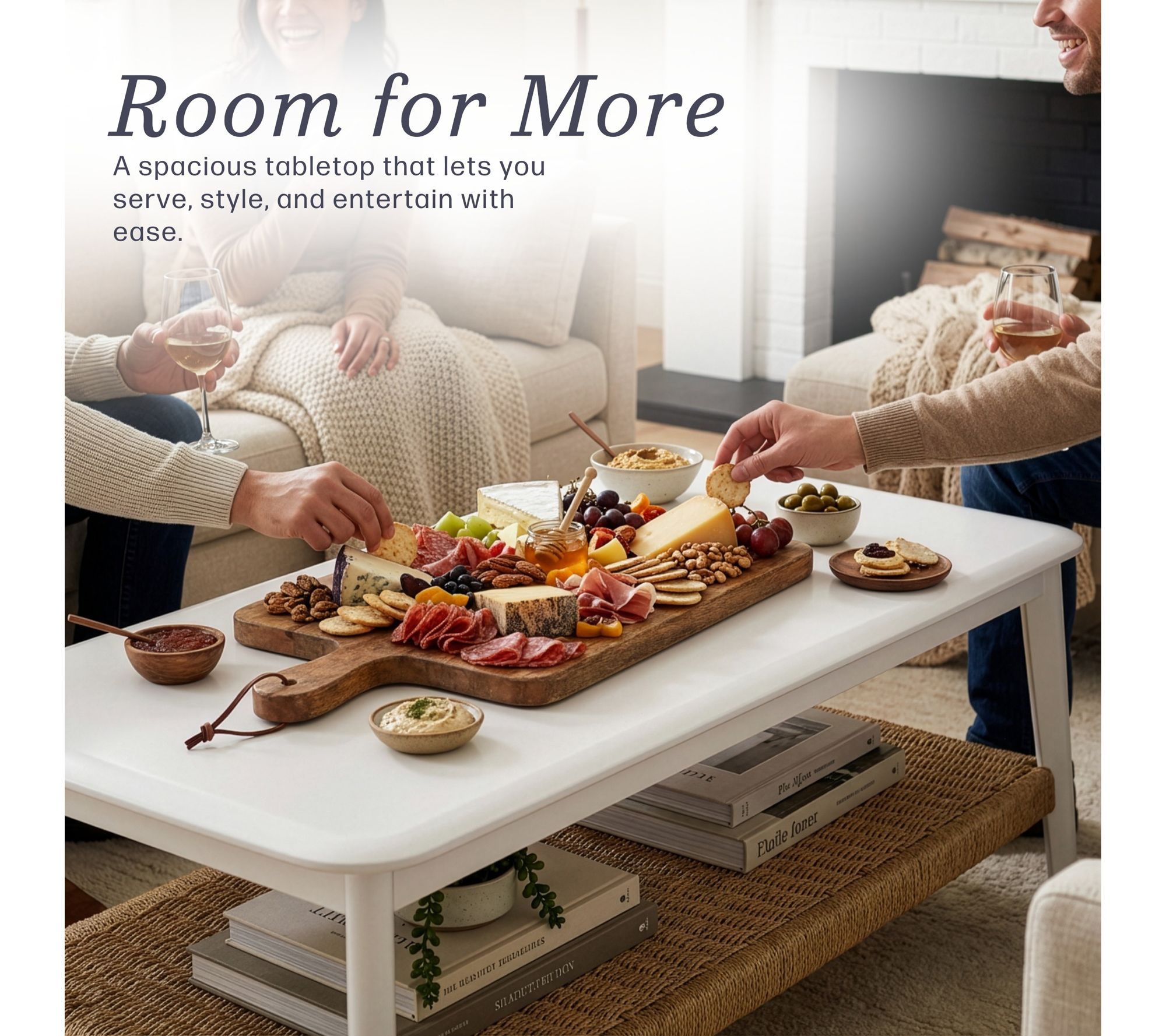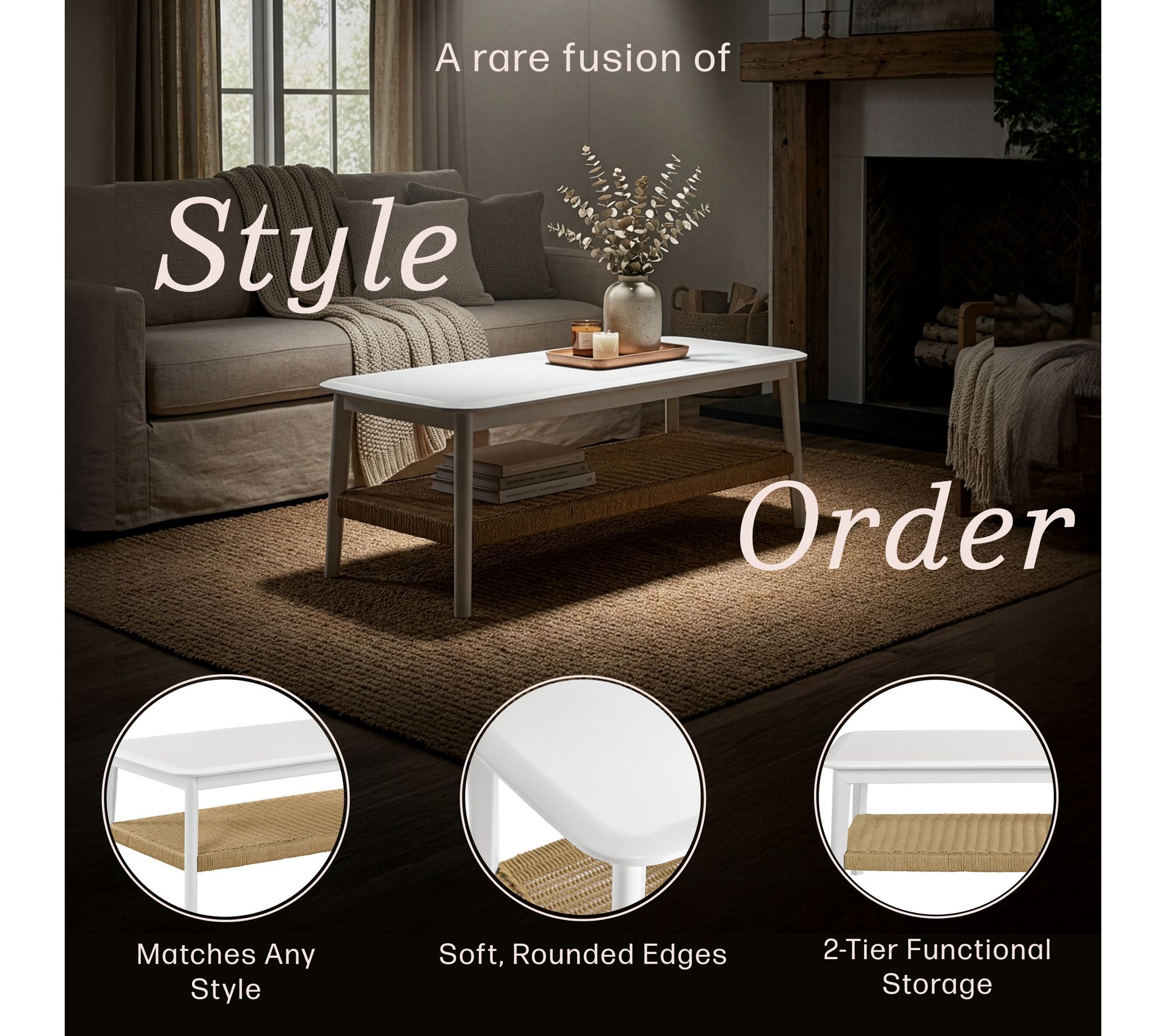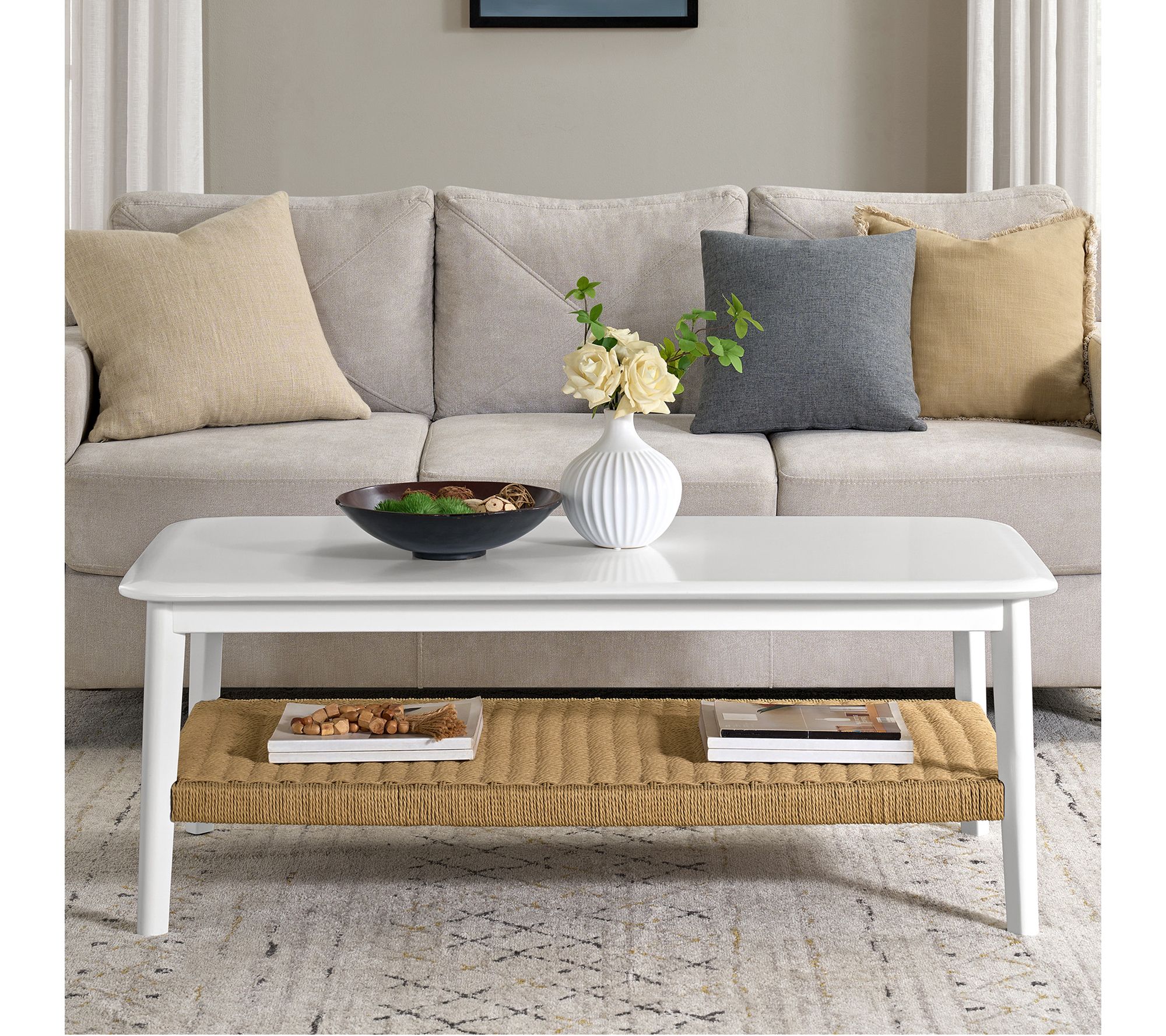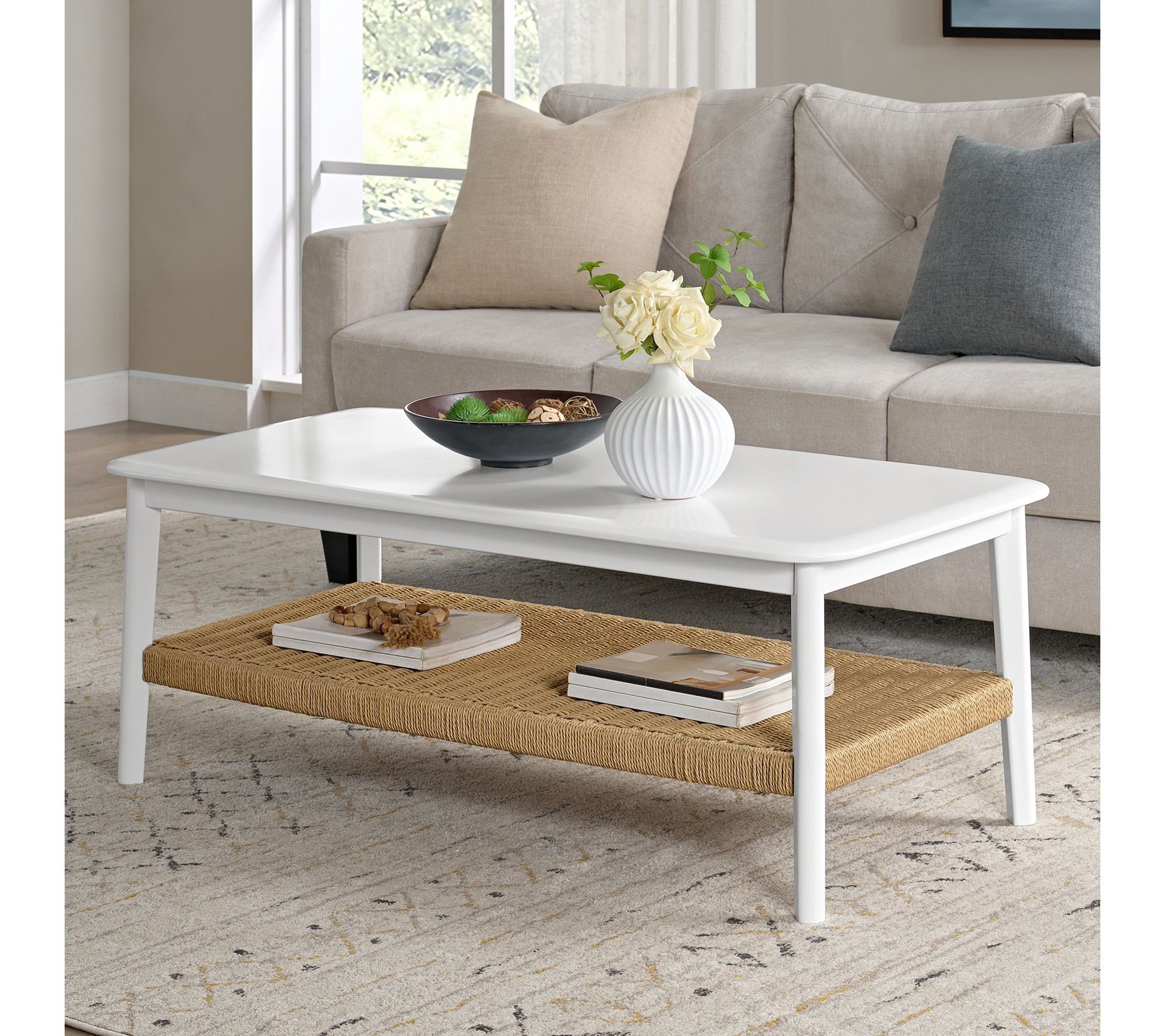 Create a welcoming focal point in your living room with this versatile coffee table, designed to beautifully display your latest decor or host drinks and snacks for movie night. The woven bottom shelf introduces textural charm and extra storage, while the sturdy frame and bright white finish blend effortlessly with coastal, modern, or farmhouse styles. From Alaterre Furniture.