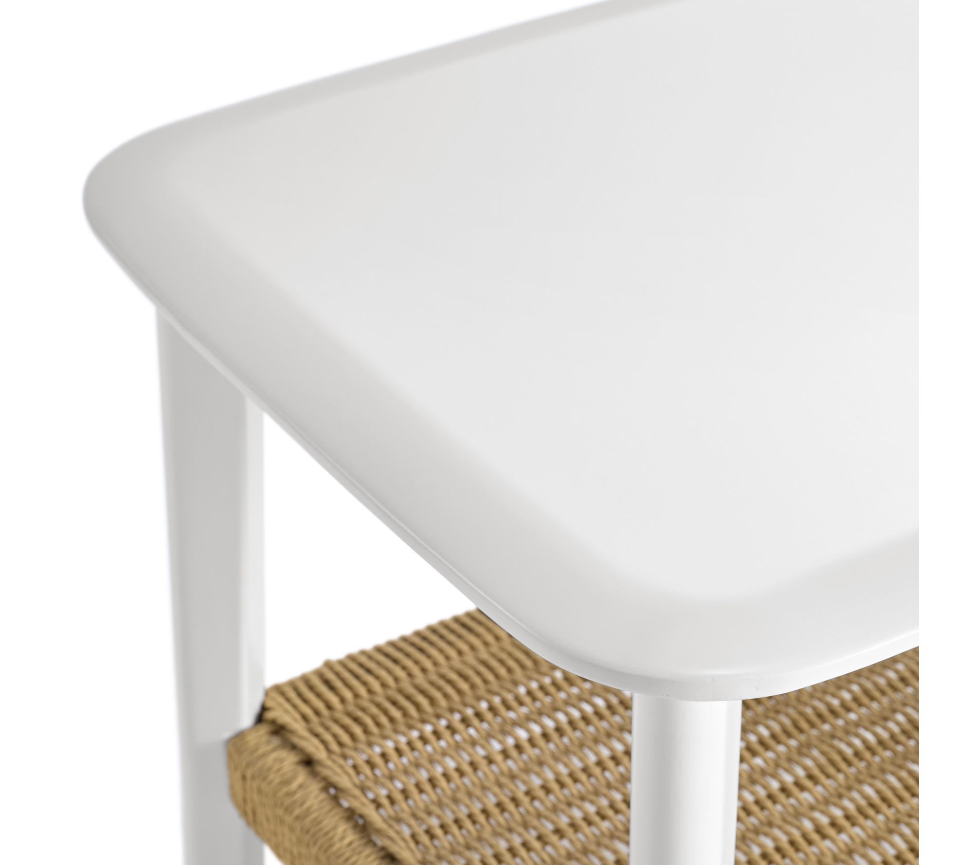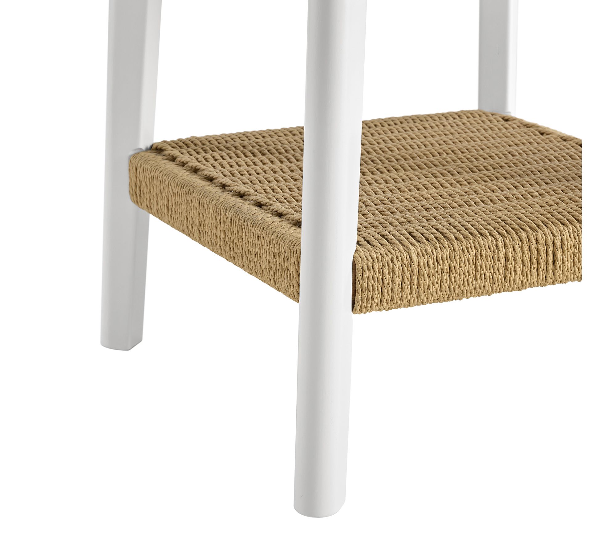 • Features woven bottom shelf; angled legs; clean white finish; 2-tier design