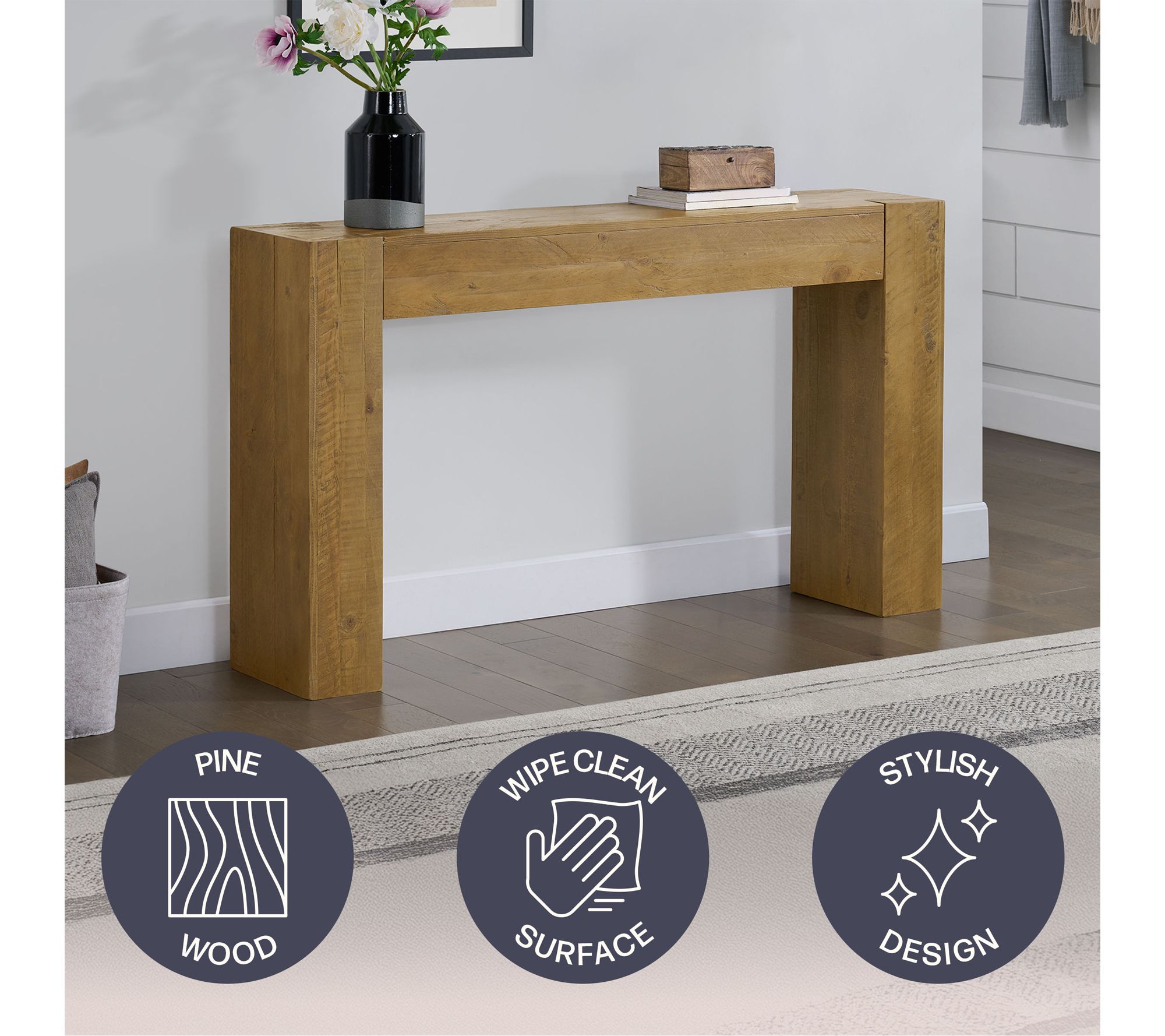 Make the most of your space with this Stockyard console entryway table -- expertly crafted from solid pine wood in sleek finishes to complement everything from rustic to modern decor. Perfect for corralling keys and essentials in the foyer, displaying plants under a window, or placing behind the sofa, its narrow profile brings flexible style and sturdy support wherever you need it. From Alaterre Furniture.