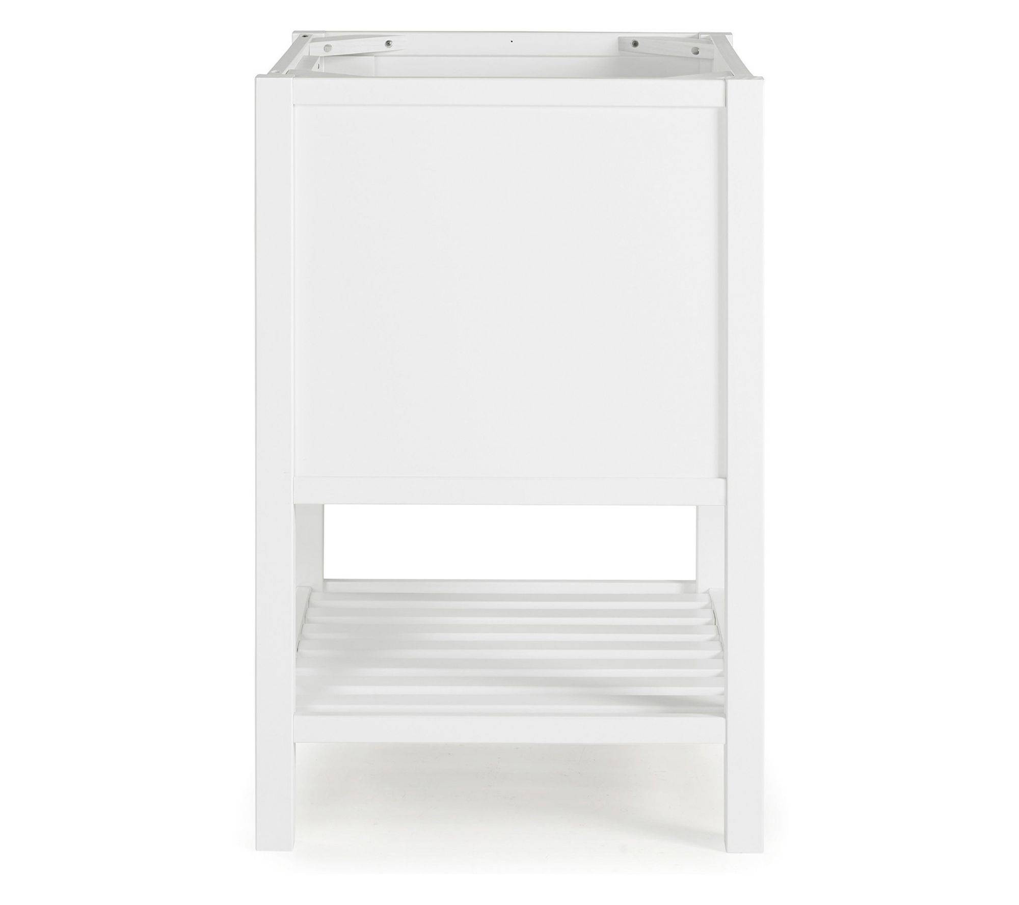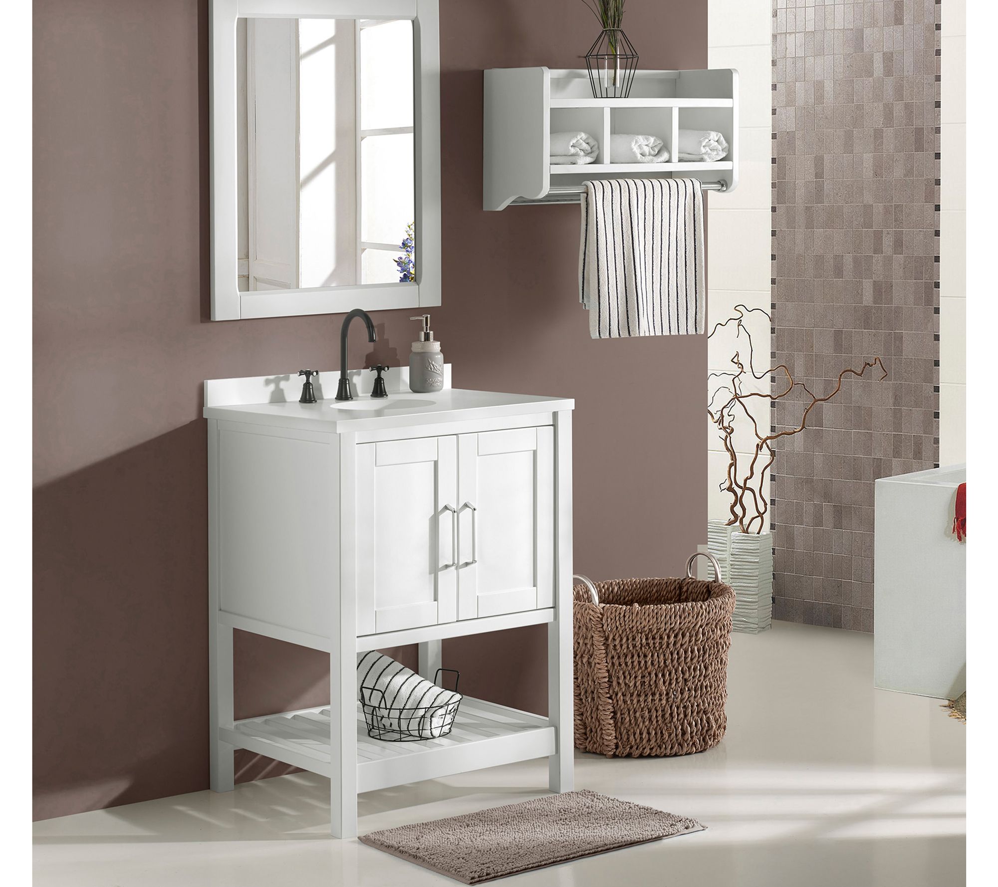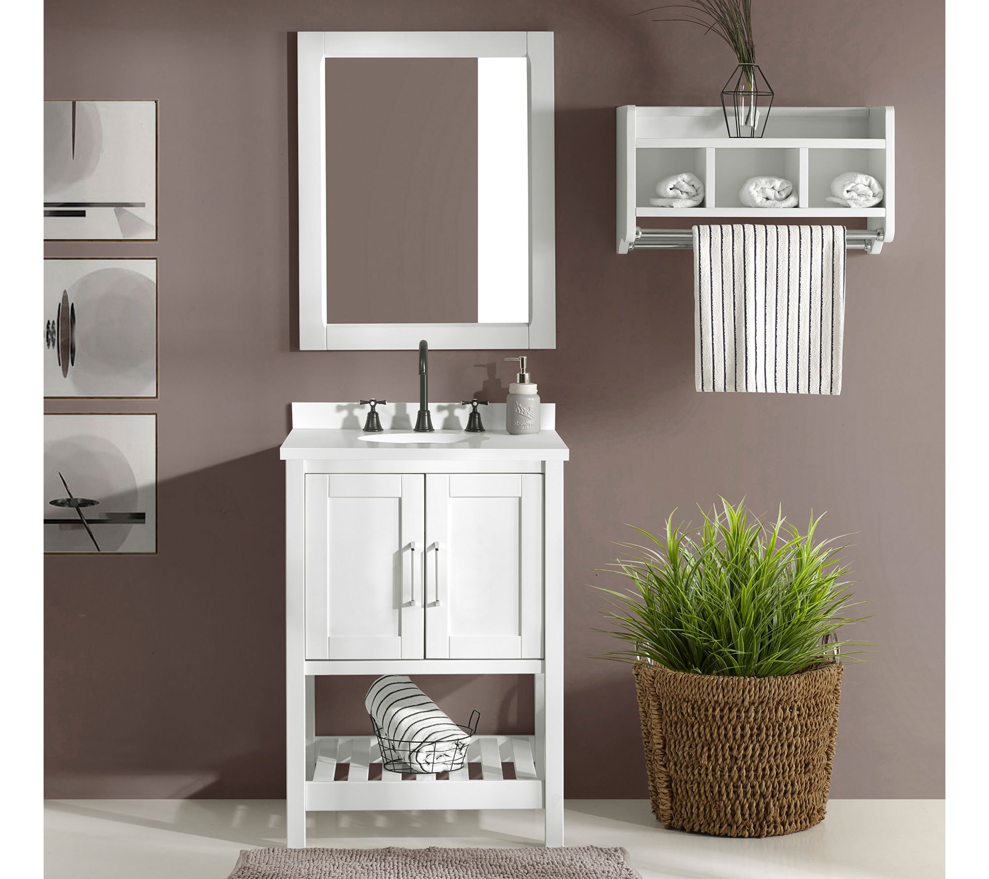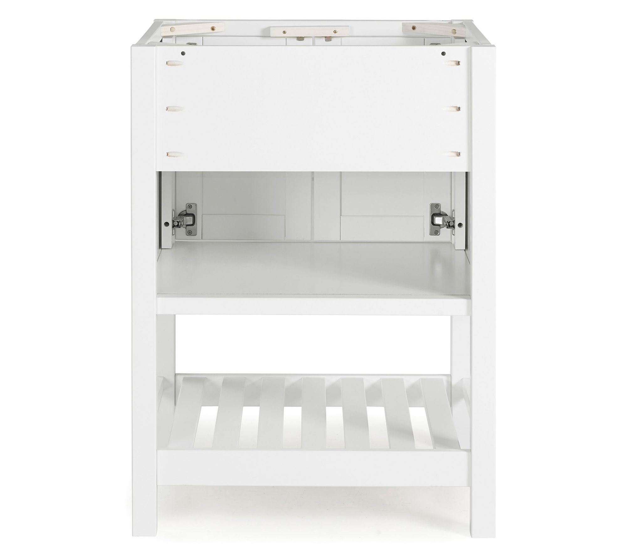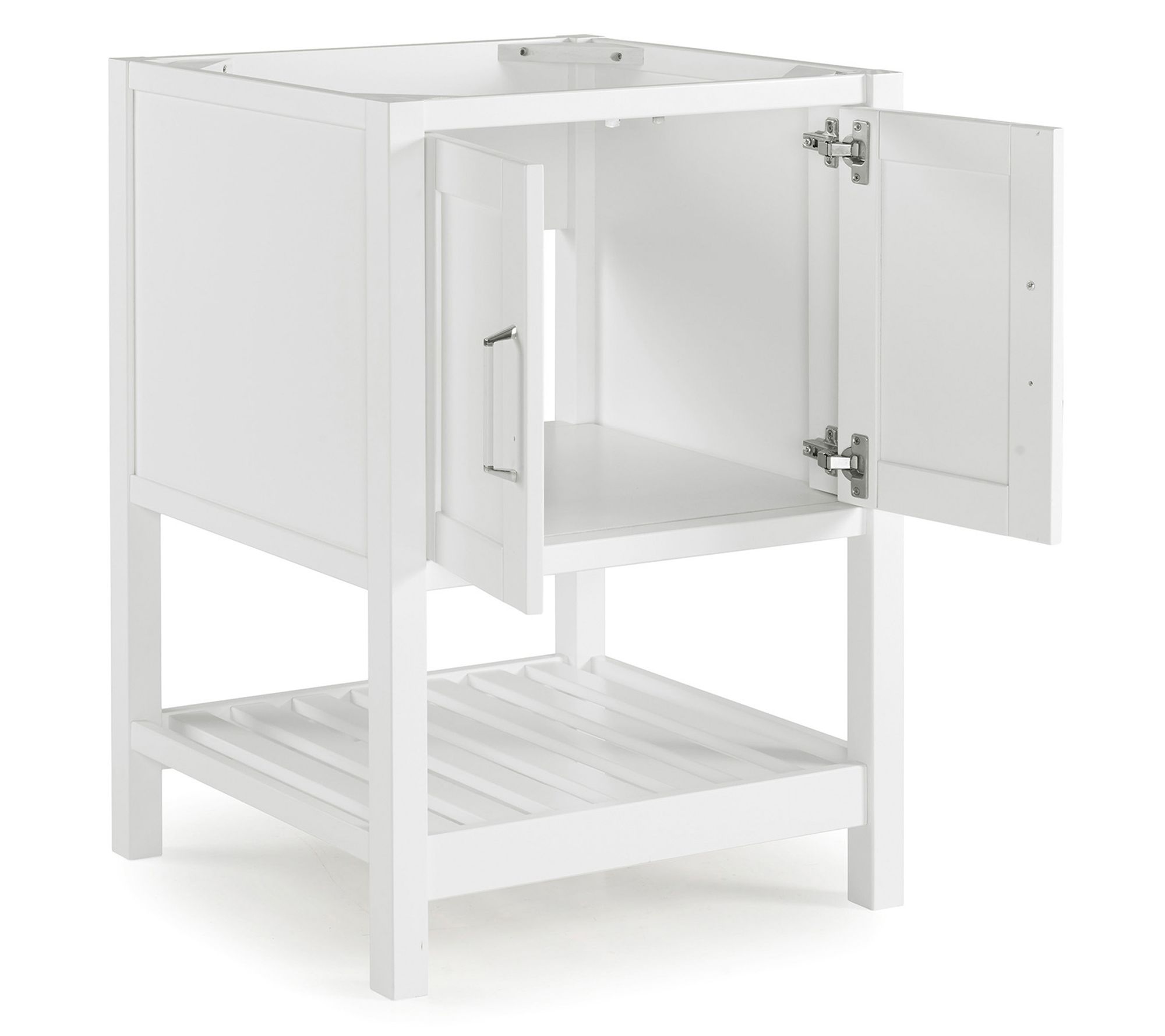 A tranquil bathroom upgrade awaits with this 24" vanity cabinet, designed to blend seamlessly into your space while maximizing storage. Soft-close Shaker doors, nickel hardware, and an open slatted shelf offer modern touches and easy organization for towels and toiletries. Choose the sink top that suits your style and enjoy the clean, fresh finish. From Alaterre Furniture.