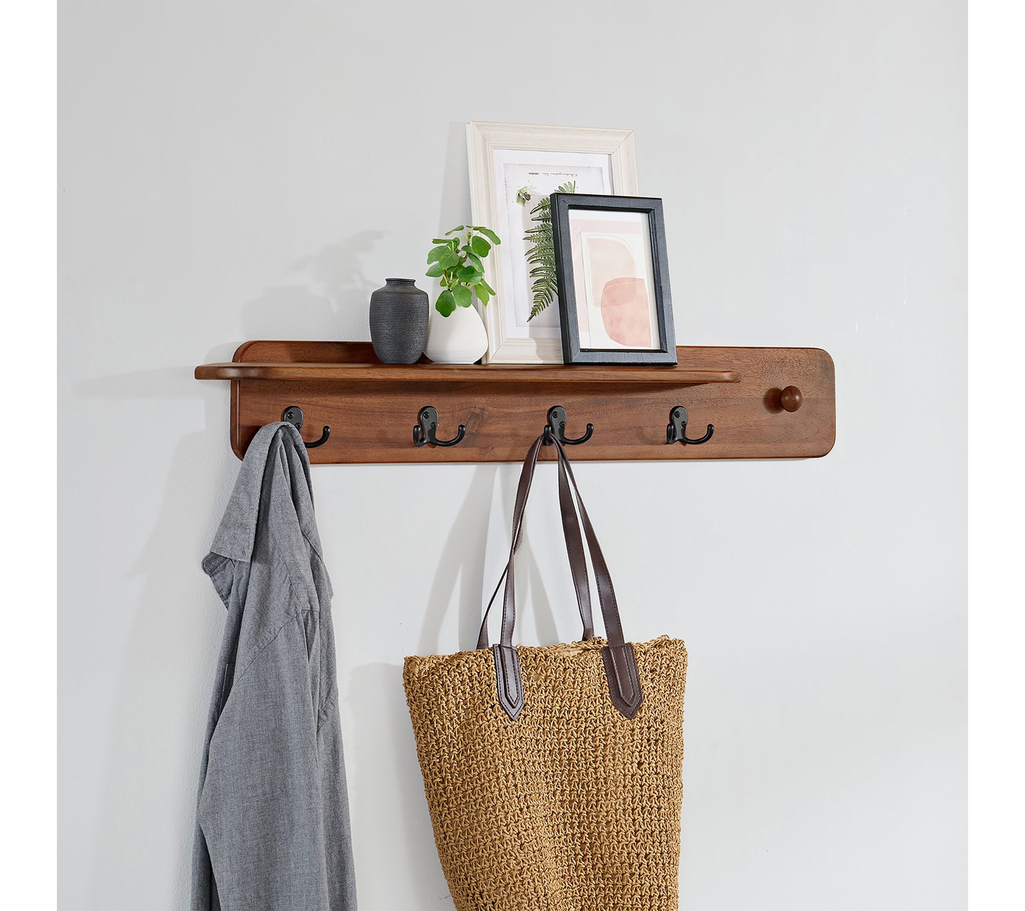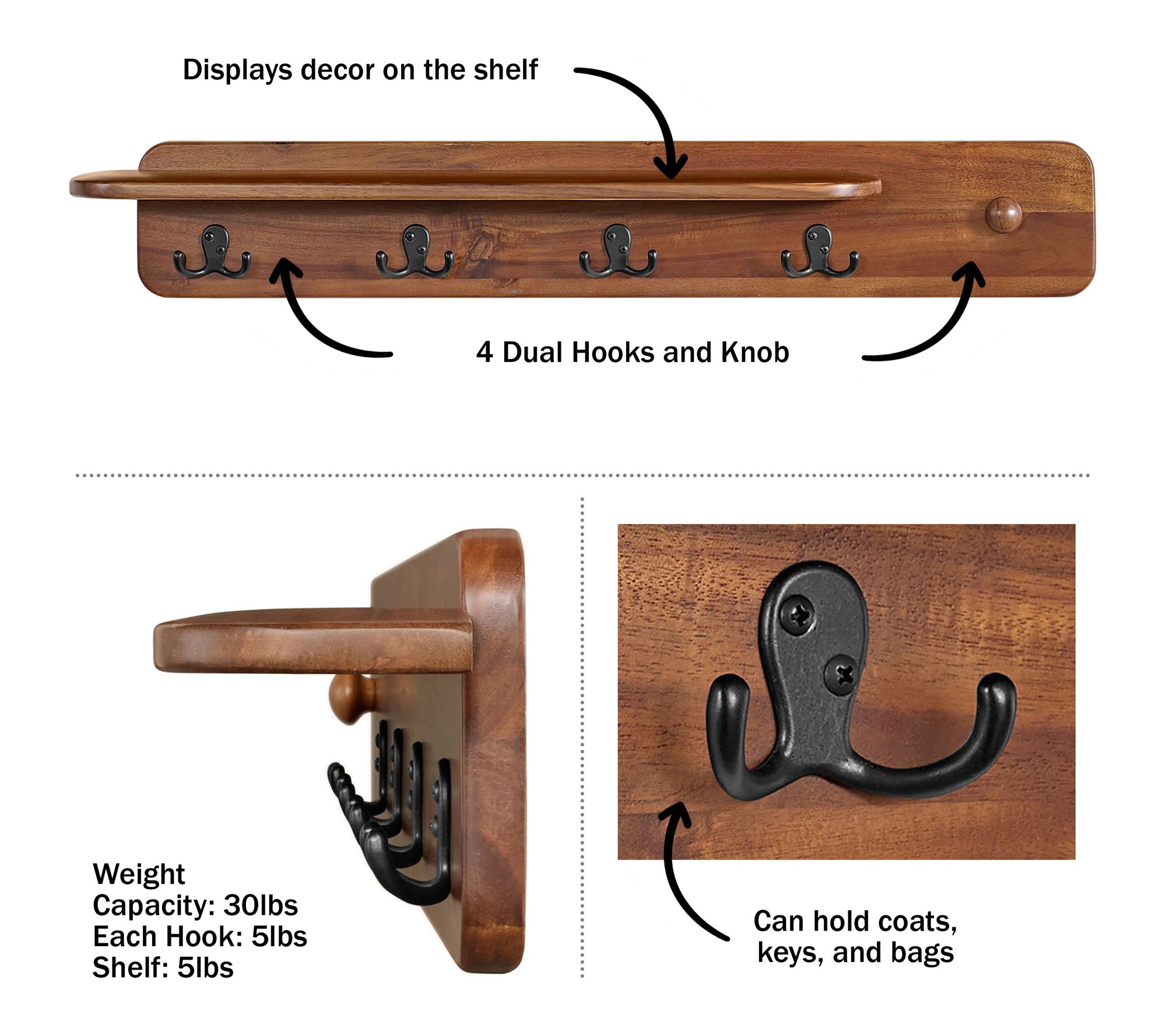 • Four dual hooks for coats, purses, keys, hats, or leashes; top shelf for display