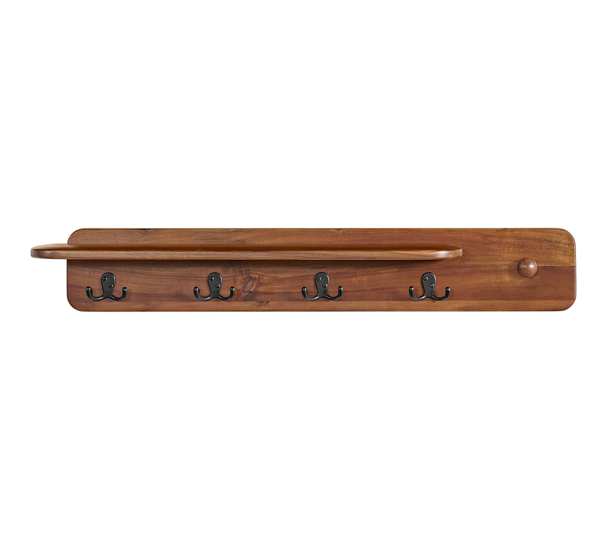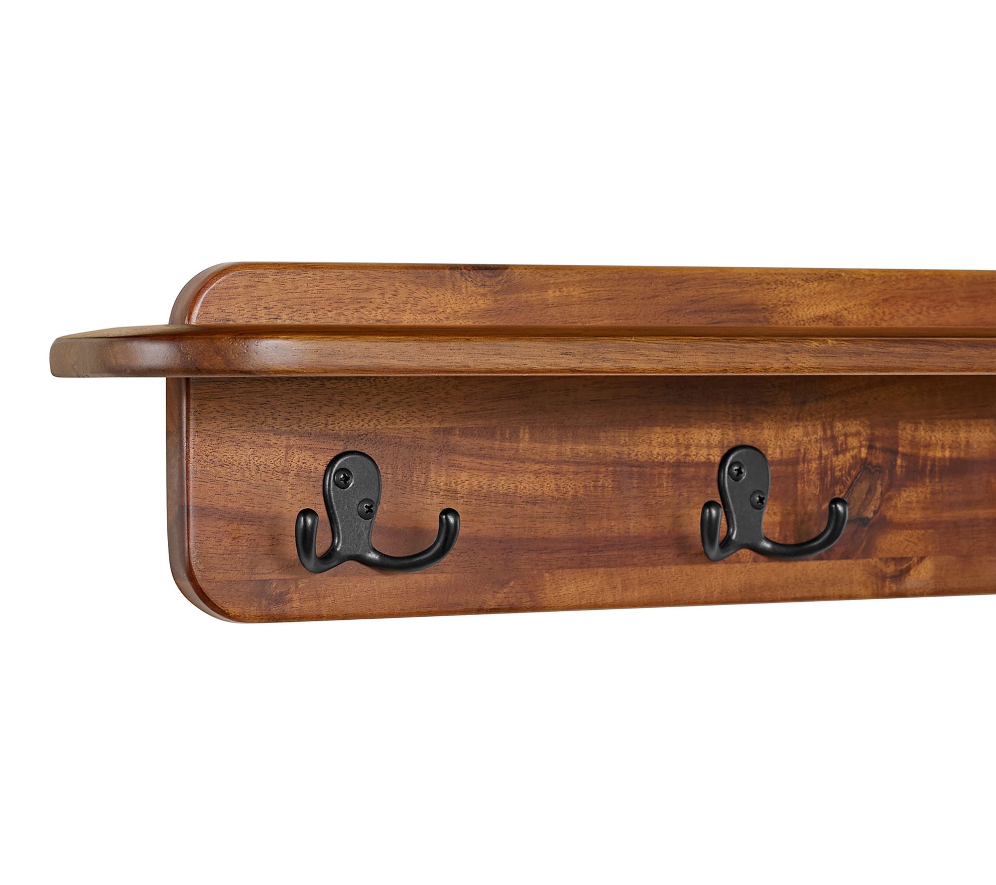 Tidy up your entryway or hallway with this stylish coat rack and wall-mount shelf -- a blend of function and design that brings a warm chestnut finish and sleek metal hooks to your space. Display favorite accents on the top shelf while keeping coats, hats, keys, and bags organized and easily accessible thanks to four dual hooks and a sturdy wooden construction. From Alaterre Furniture.