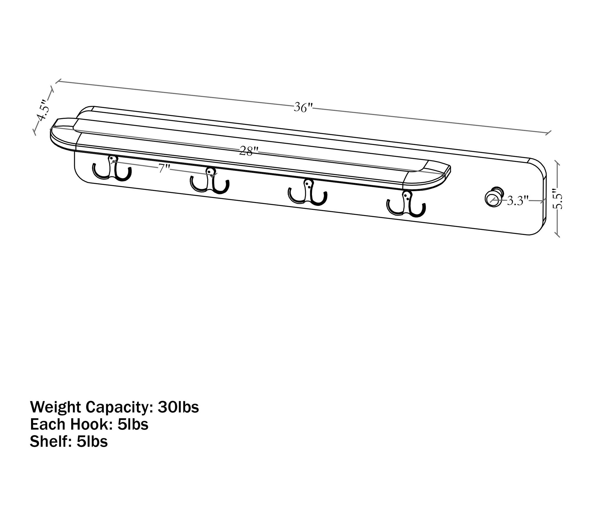• Measures 36" x 4.5" x 5.5"; weighs 4.6 lbs; supports up to 30 lbs (5 lbs per hook or shelf)
