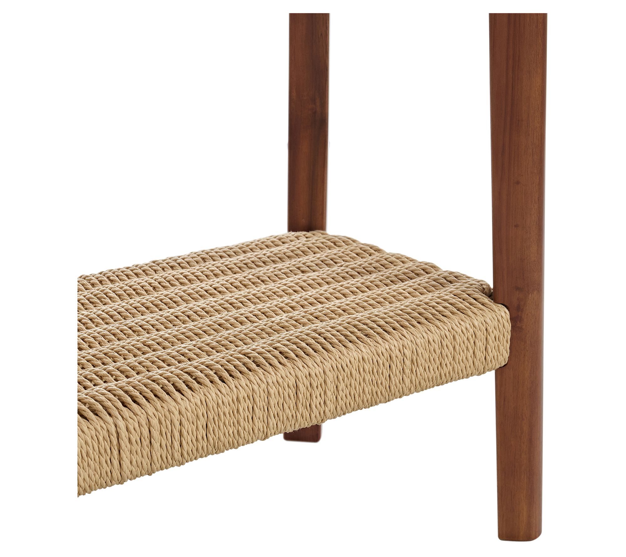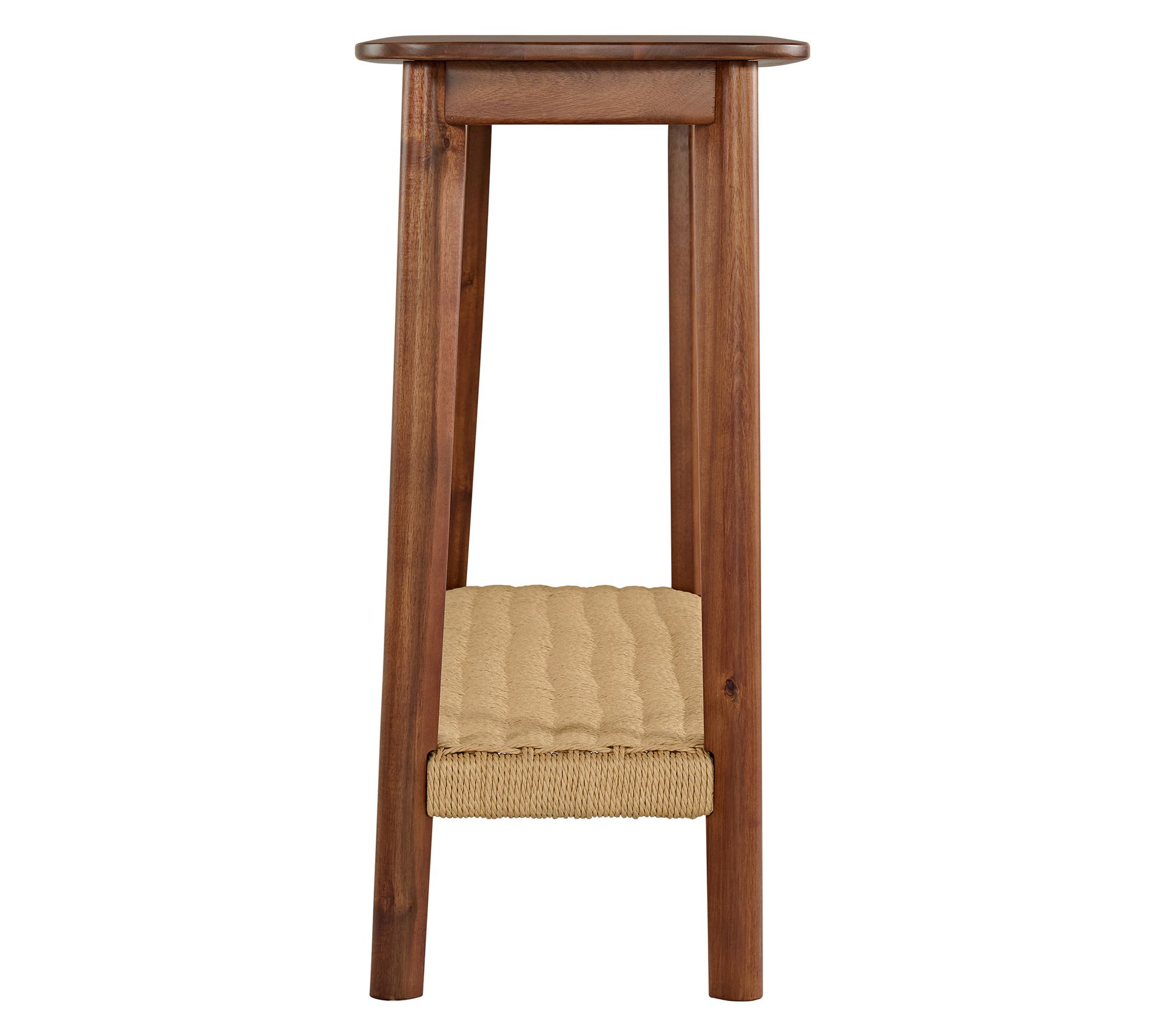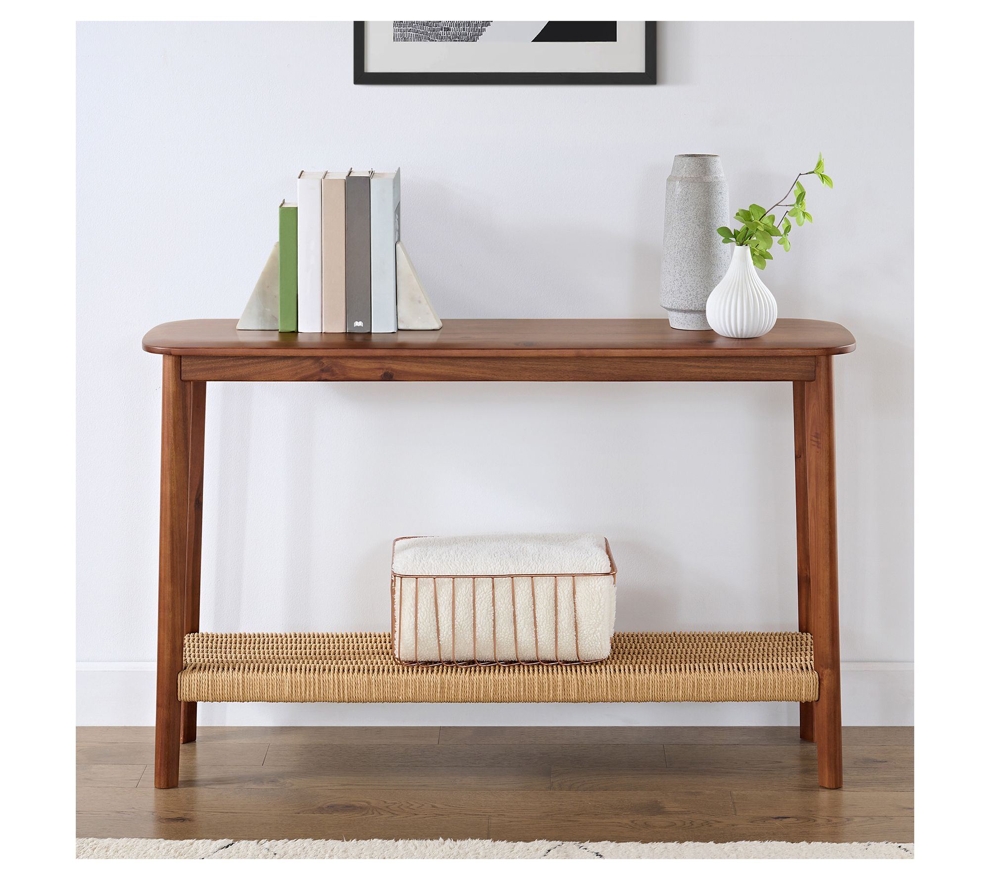 Add an inviting touch to your entryway or living room with this Calais console table, blending warm acacia wood and a woven shelf for both style and function. Its spacious tabletop provides a spot for photos, vases, or daily essentials, while the lower shelf keeps shoes or baskets neatly organized. From Alaterre Furniture.