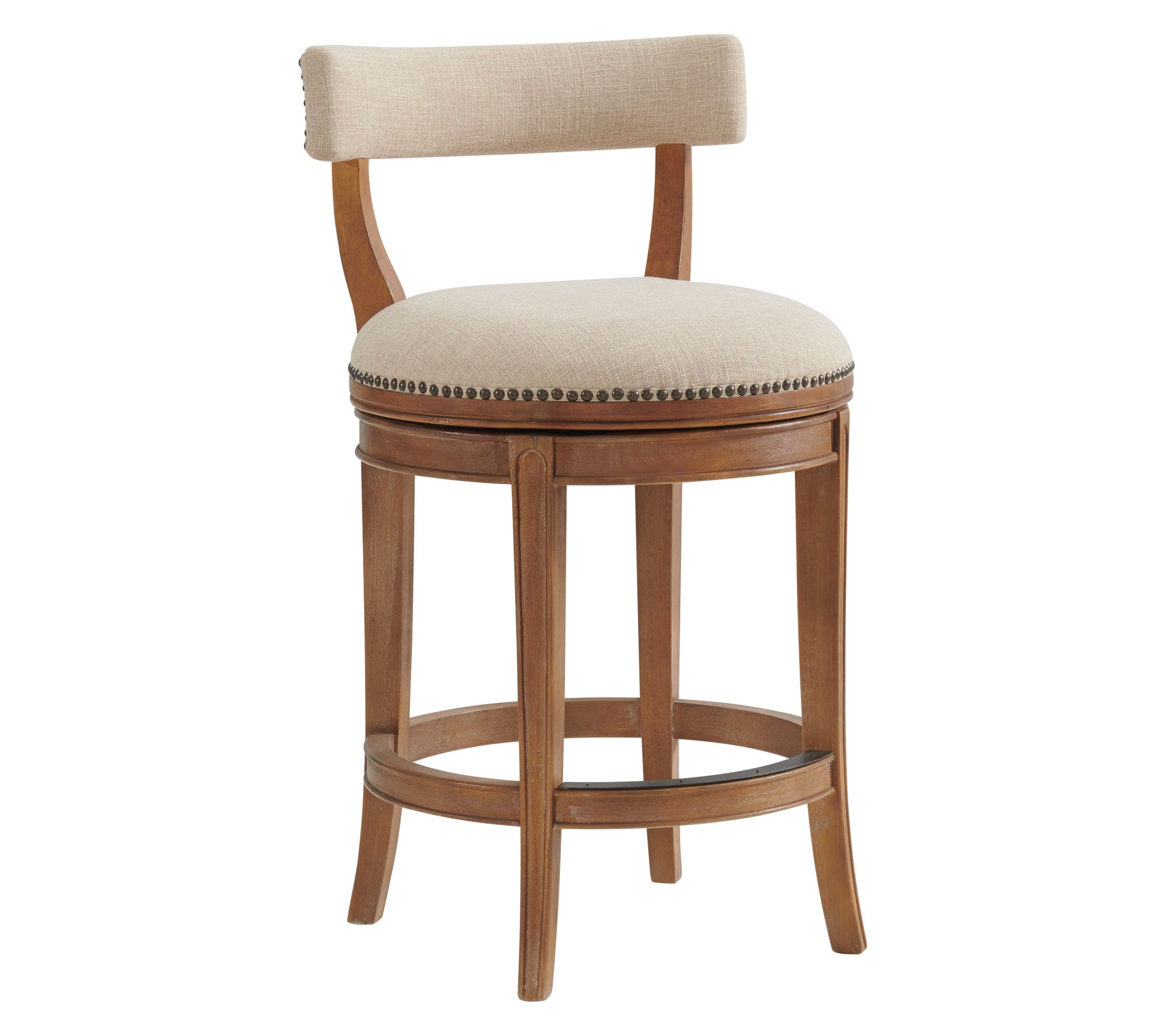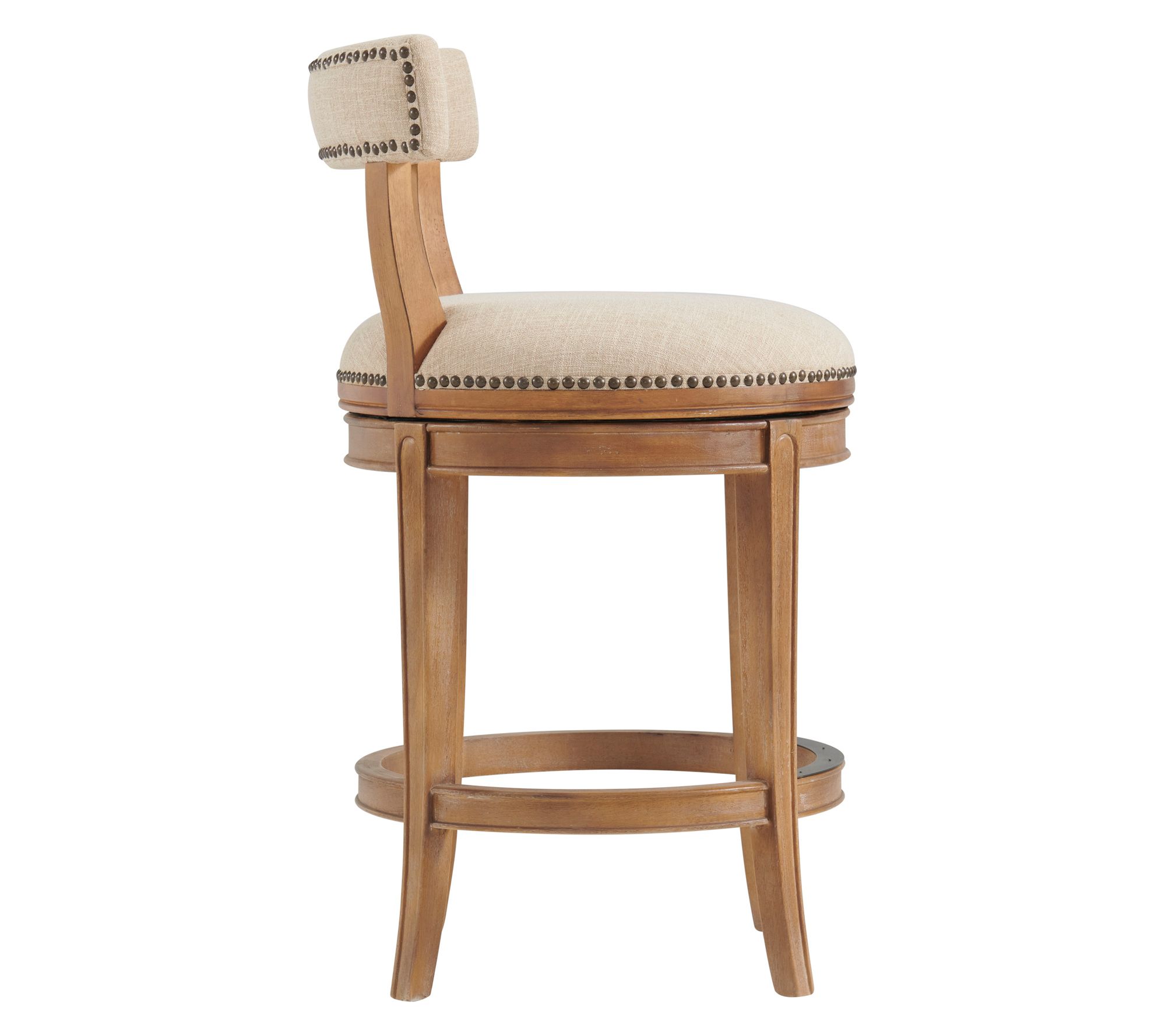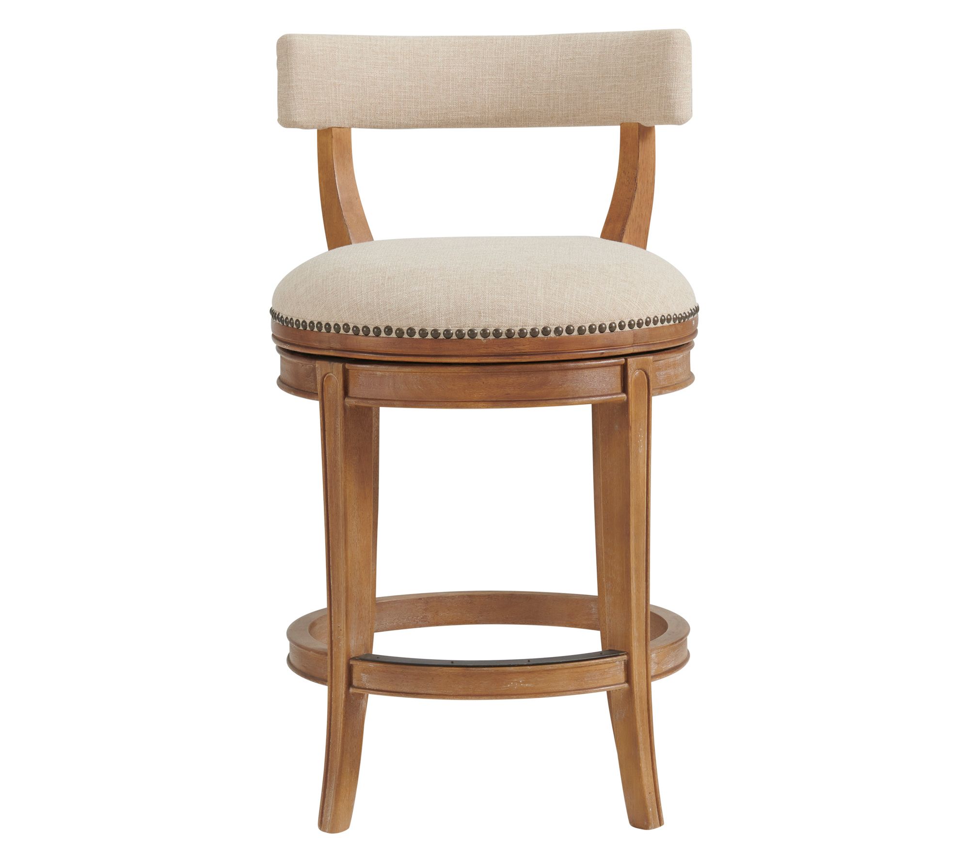 Share cozy conversations or enjoy a leisurely breakfast atop these counter height stools, where plush faux leather seats and nailhead trim bring elevated style to any kitchen or bar area. Built on sturdy rubberwood frames with smooth swivel action and integrated footrests, this pair creates a comfortable spot for family meals or entertaining friends. From Alaterre Furniture.