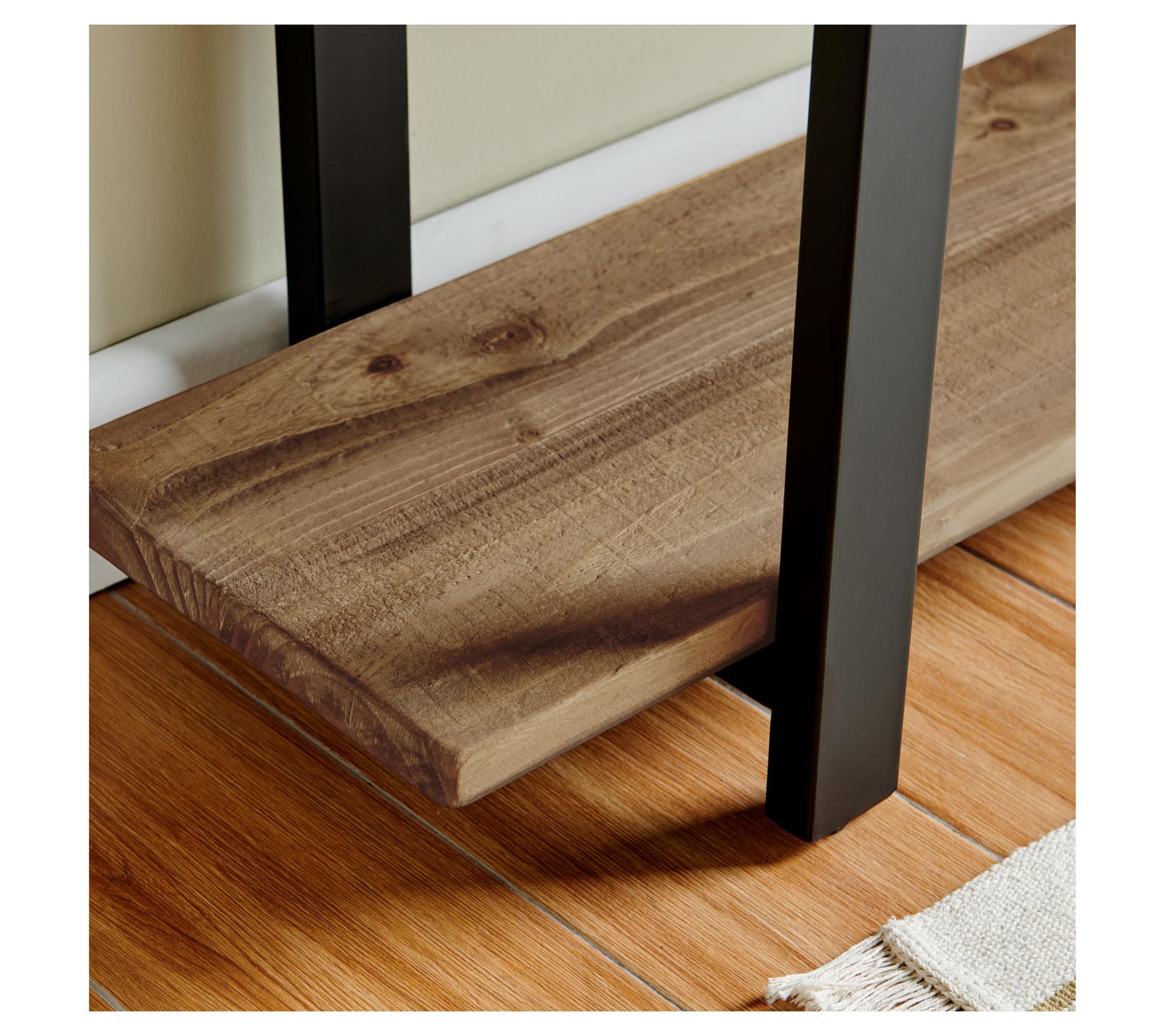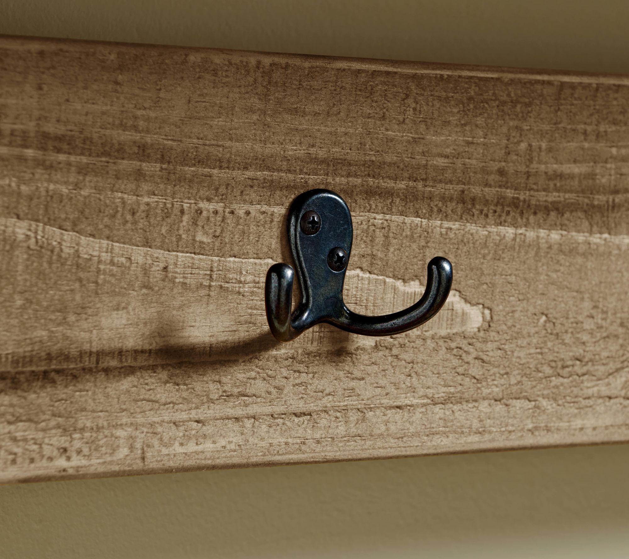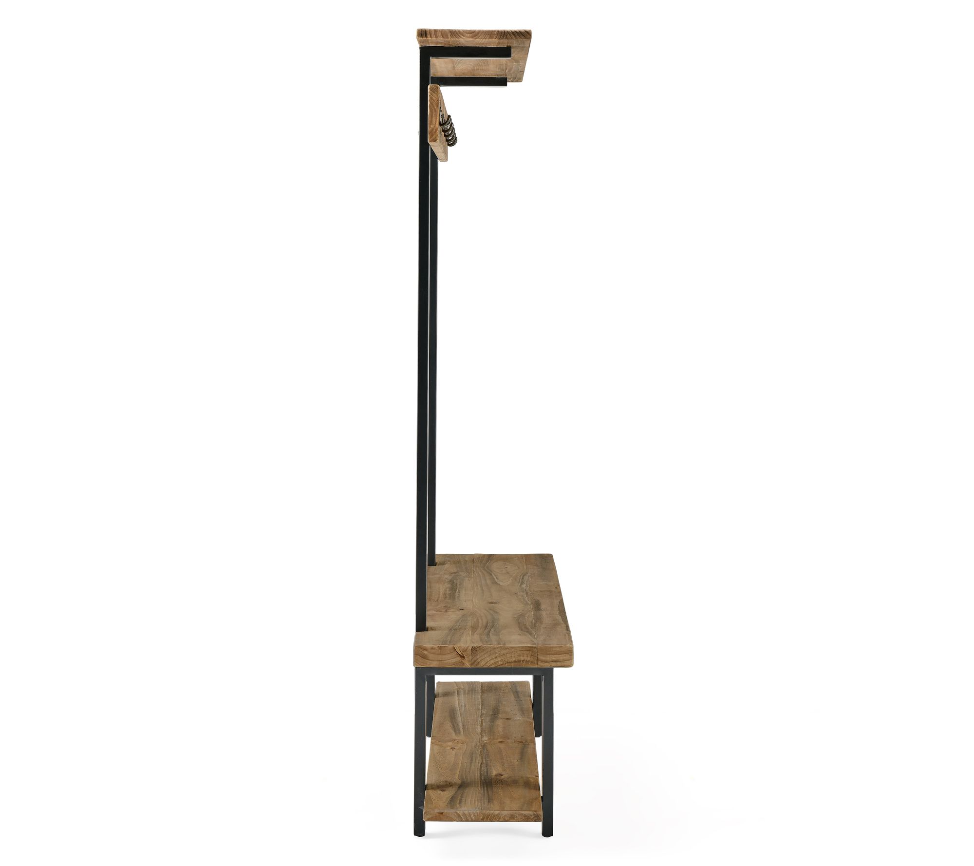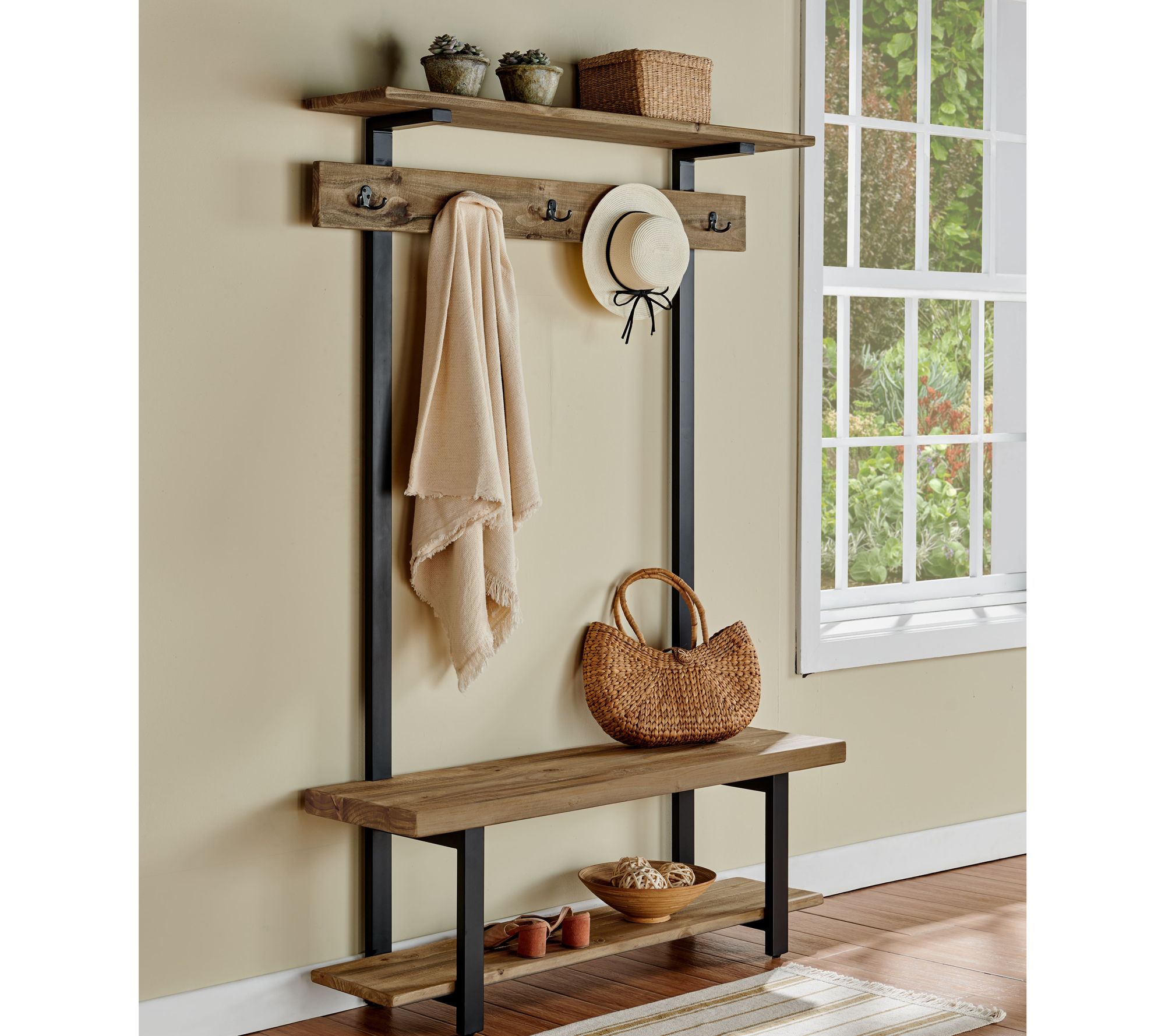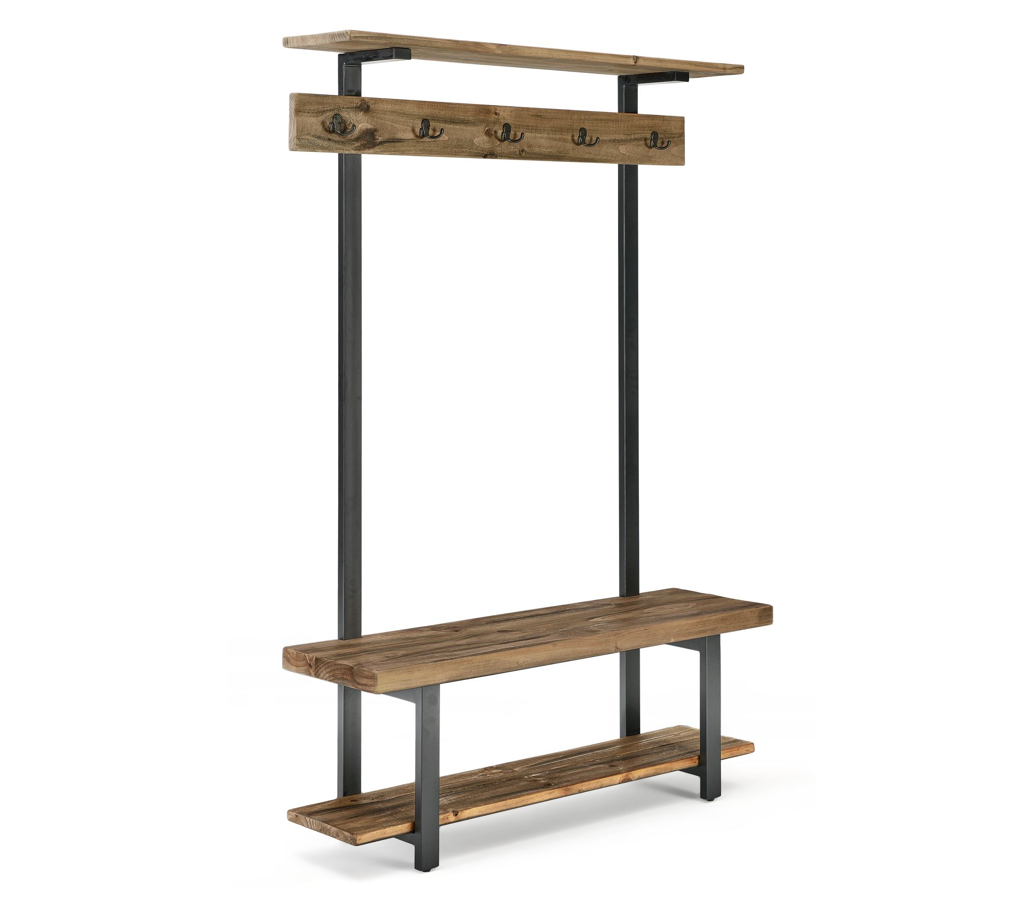 Welcome guests to a beautifully organized entryway with this hall tree and bench, designed to blend rustic, industrial style with smart storage. Five metal coat hooks stow jackets or backpacks, while the solid pine bench is ready for lacing up shoes. Tidy shoes, bags, and more with added shelves -- ideal for entryways, laundry areas, or guest rooms. From Alaterre Furniture.