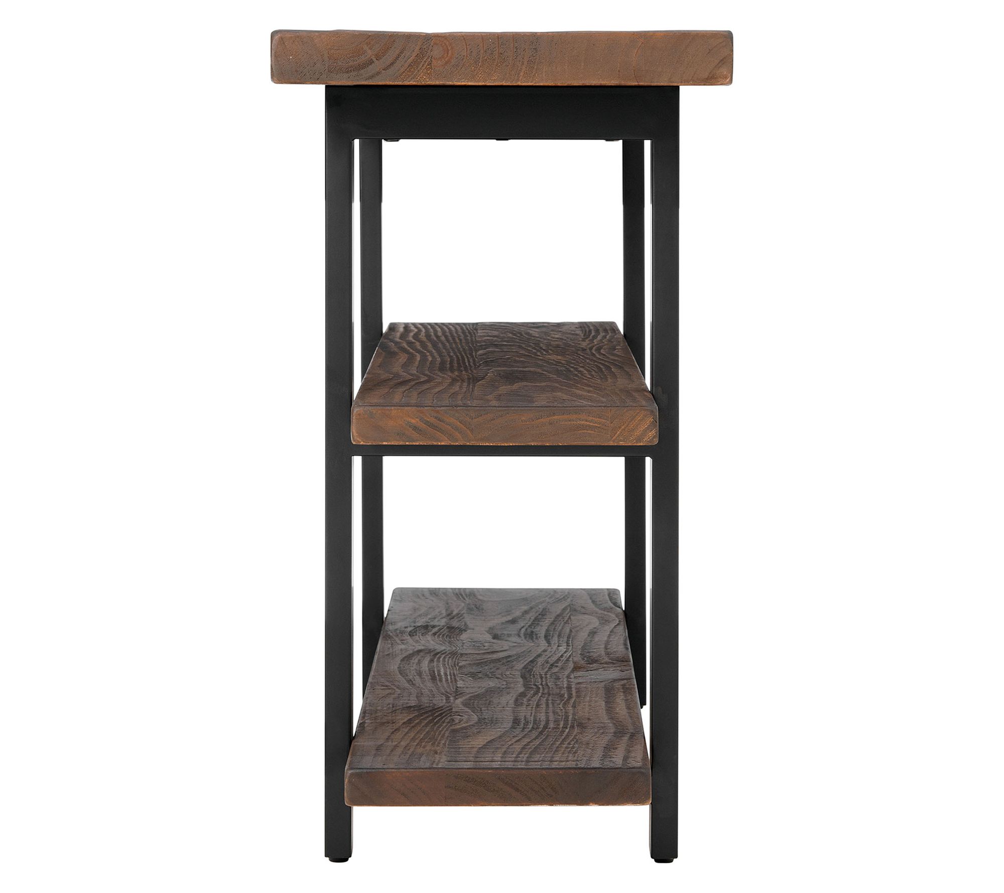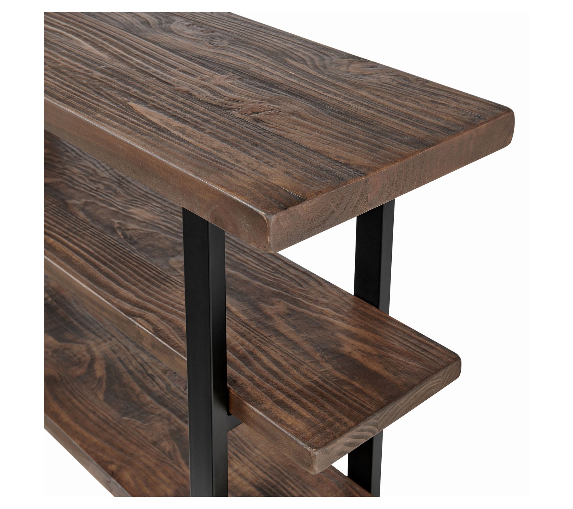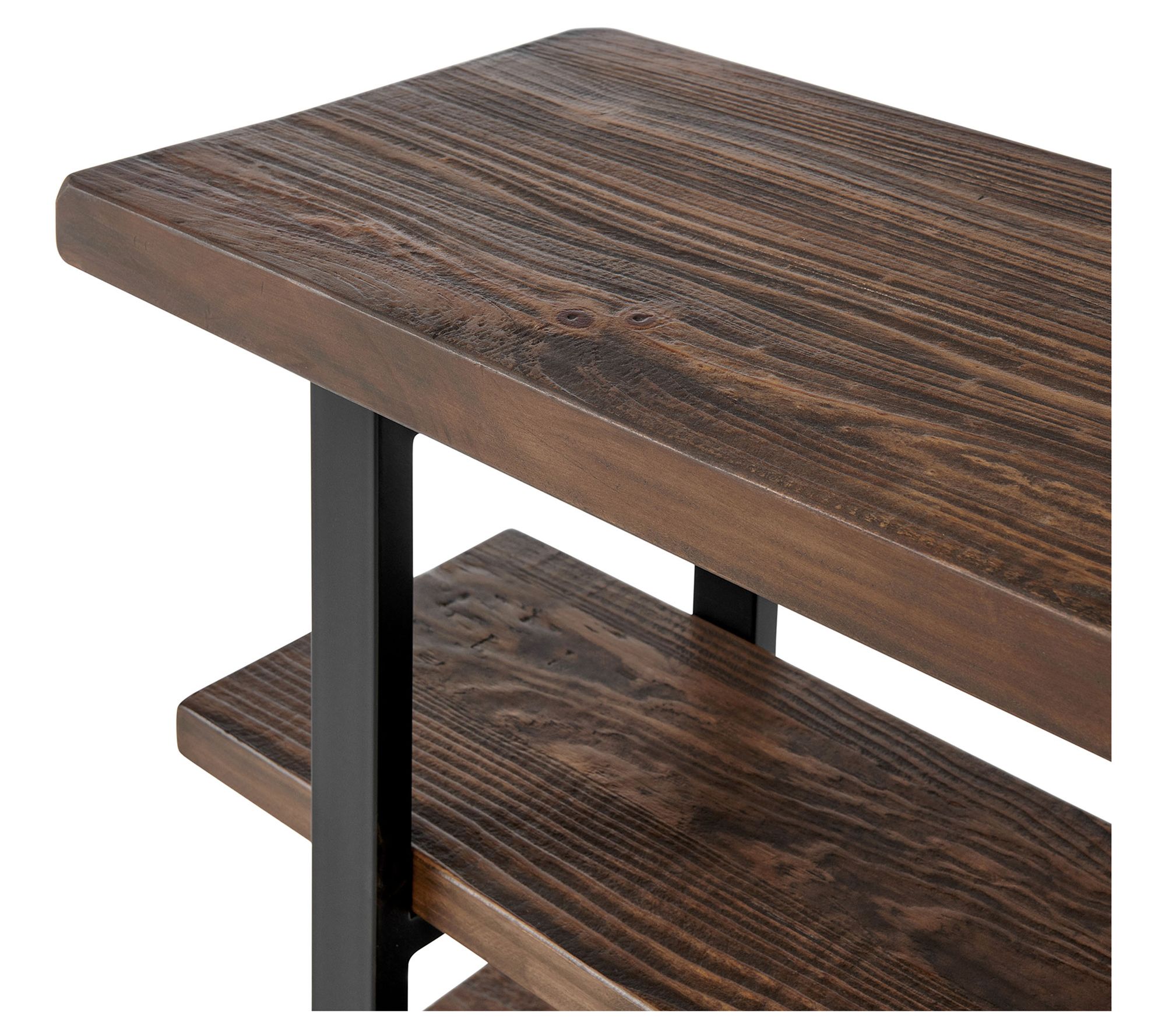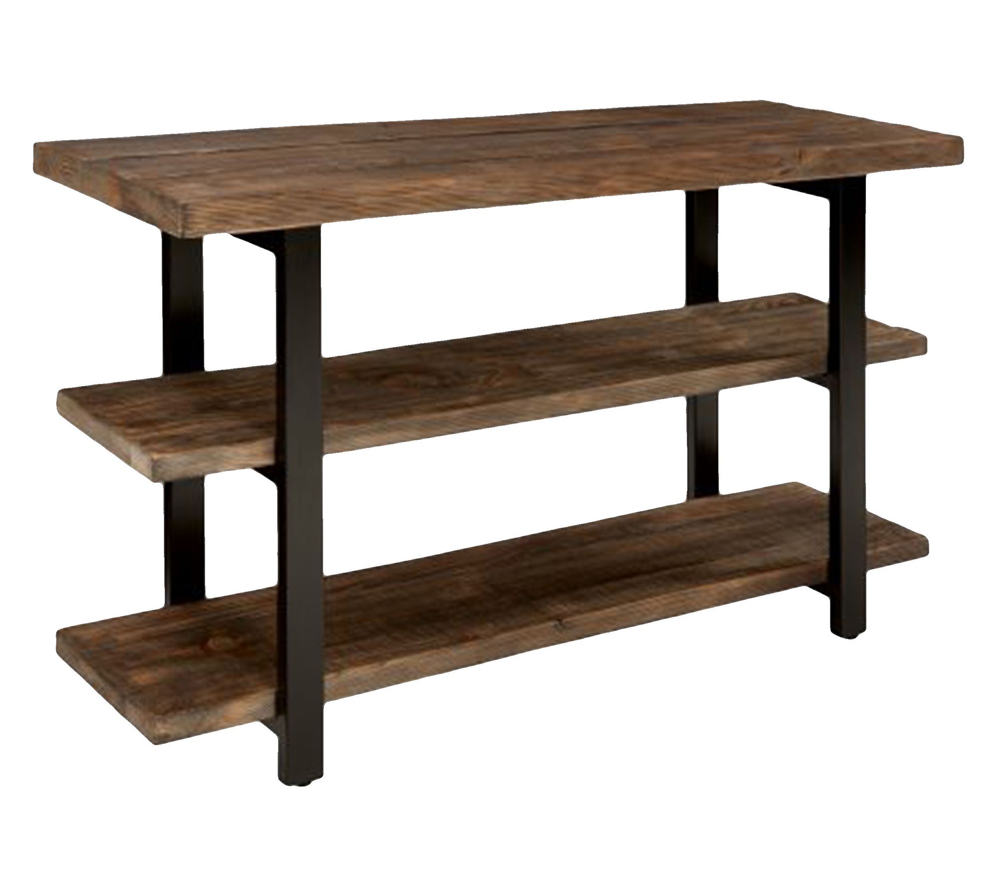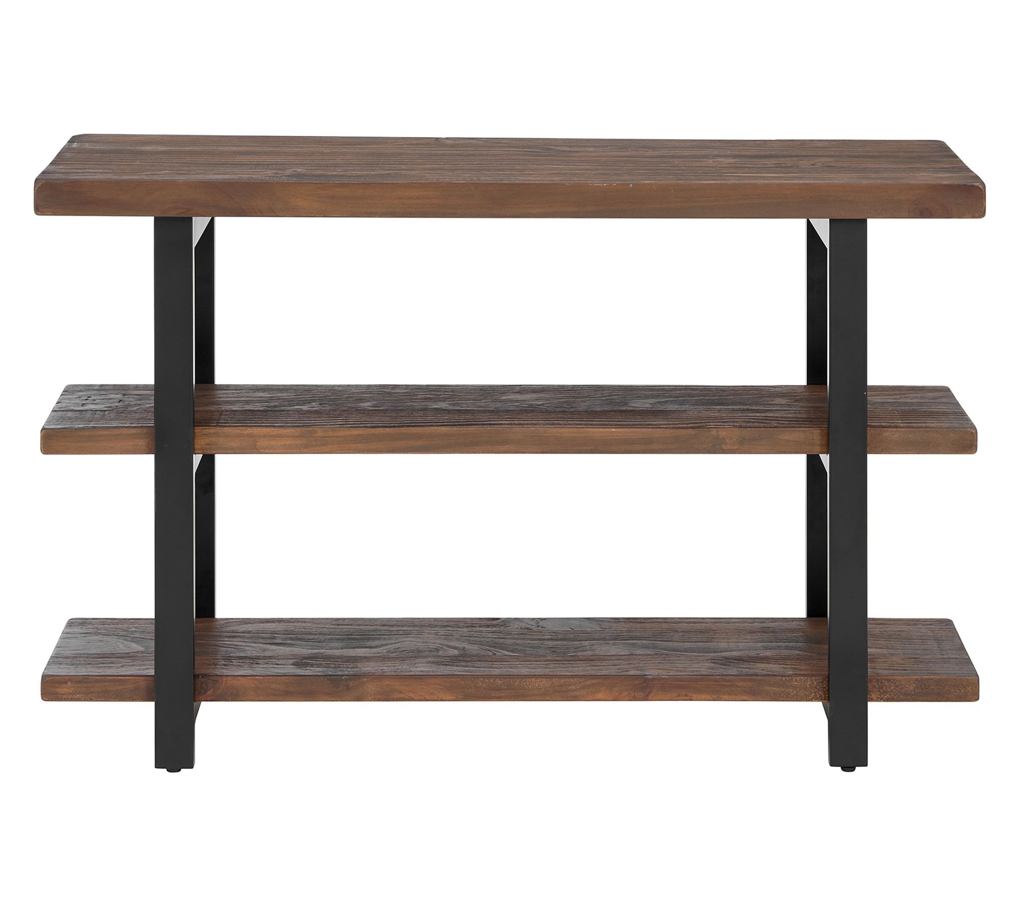 Turn movie nights into an inviting experience with this media console table that blends rustic-industrial charm with everyday functionality. Crafted from solid pine wood, it creates a cozy spot for your television while showing off photos or favorite decor on its two spacious shelves. Metal legs provide modern flair and stability for a look that stands out in any space. From Alaterre Furniture.