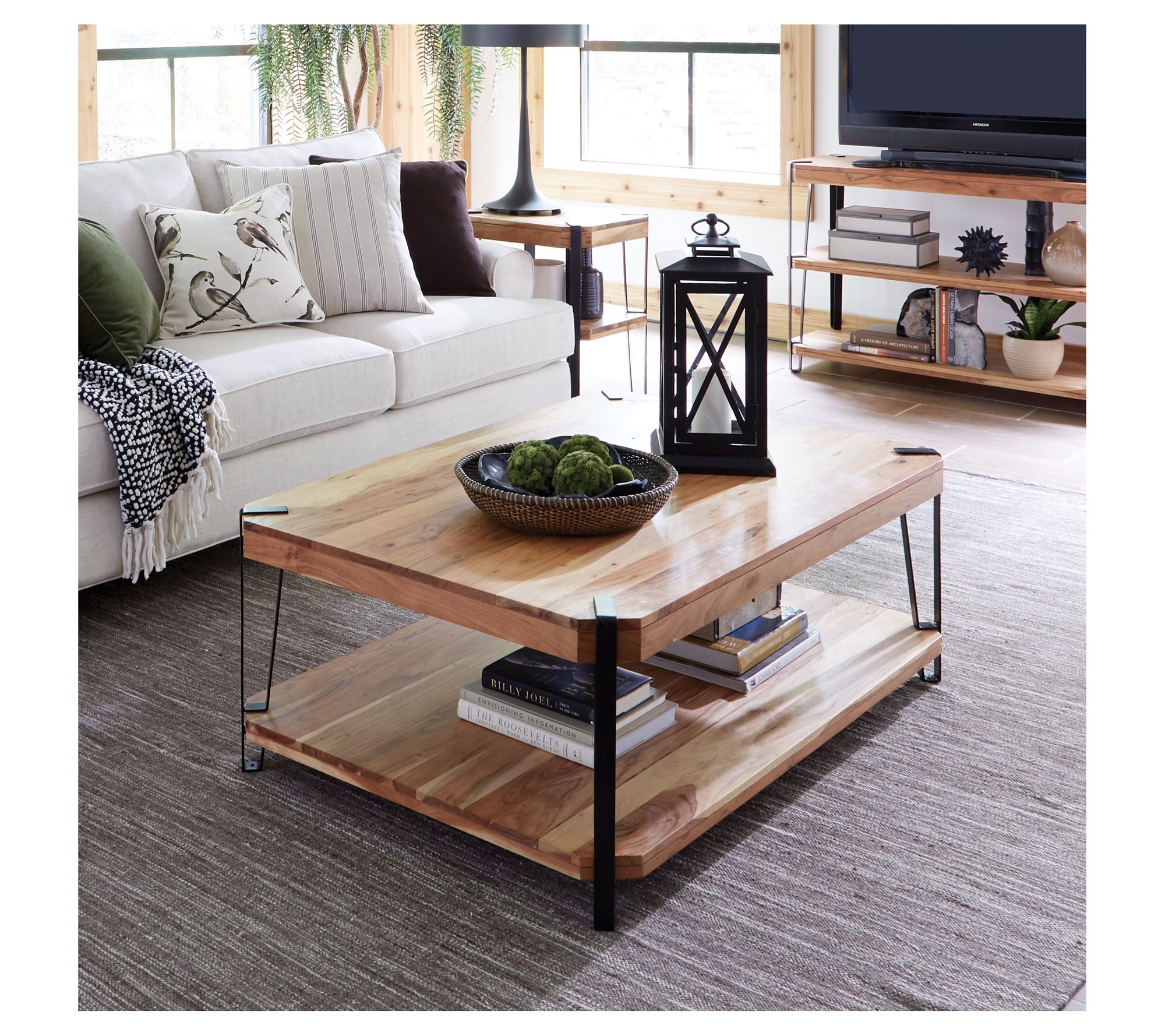 Whether you're hosting game night or enjoying a quiet coffee on a Sunday morning, this large coffee table draws everyone in with its natural beauty and modern industrial edge. The spacious live-edge tabletop and open lower shelf invite you to display decor or stash your favorite reads, while the sturdy acacia wood and metal frame promise years of lasting style. From Alaterre Furniture.