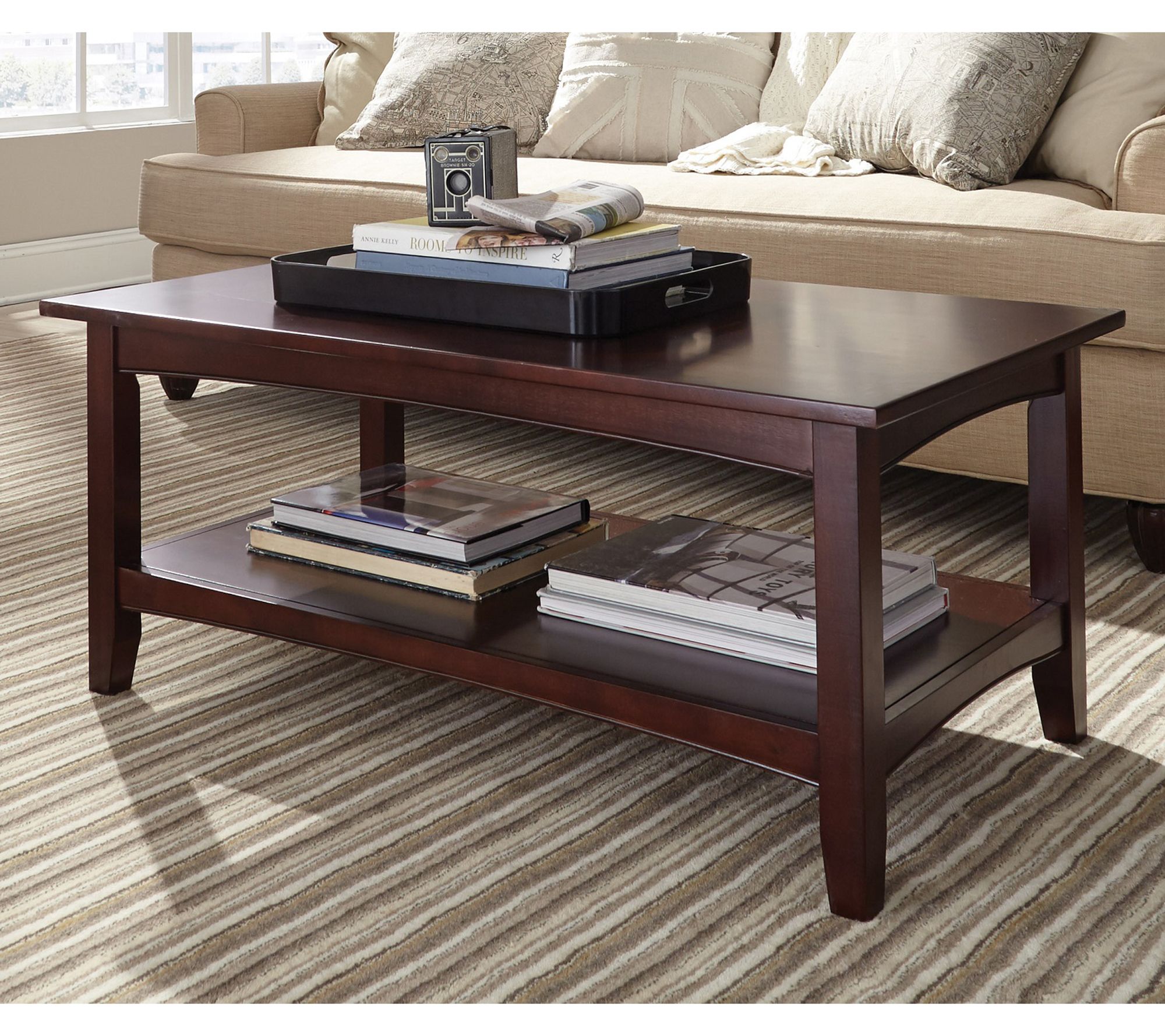 Your living room feels instantly inviting with this Shaker Cottage coffee table -- the spacious top welcomes drinks and decor, while the open lower shelf keeps books and remotes close by. Classic lines and a cherry finish blend smoothly with casual or formal settings, making it easy to style your space just the way you like. From Alaterre Furniture.