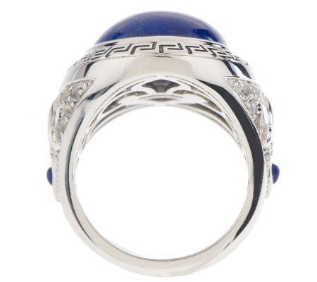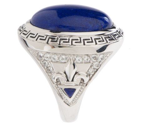 • Oval, blue lapis gemstone; Greek key design on frame; fleur-de-lis motif, round, bead-set white topaz gemstones, triangular, blue lapis gemstones, and beaded details on shoulders; tapered shank