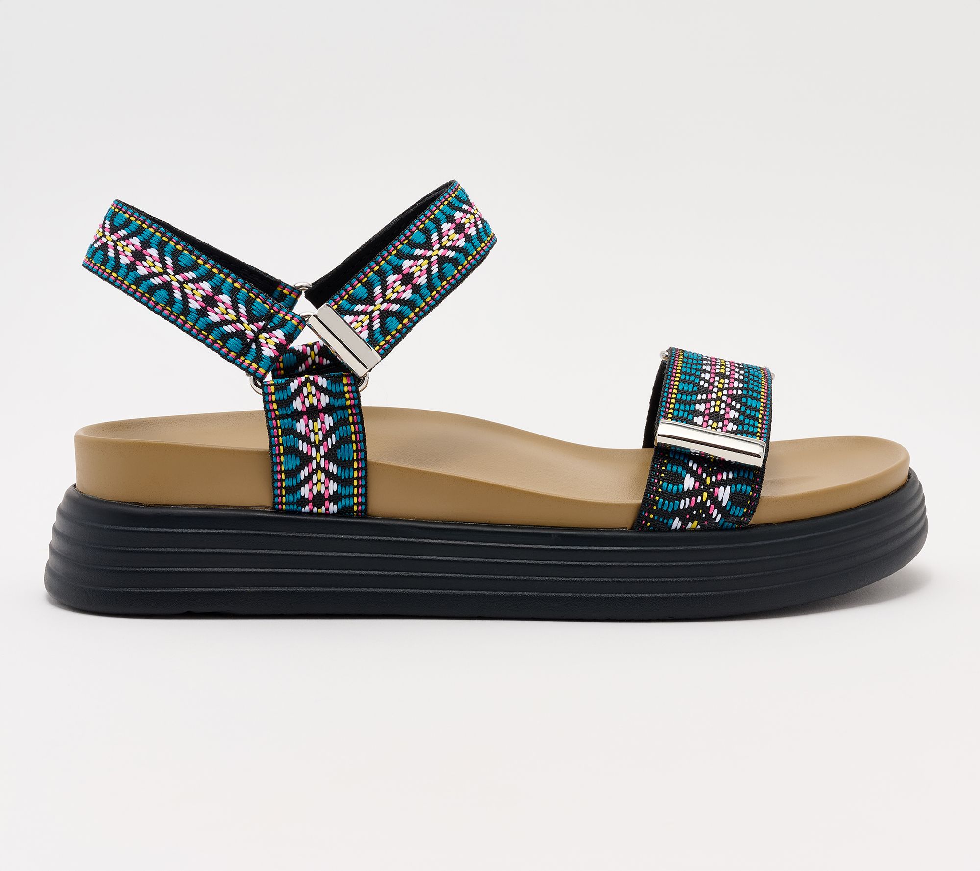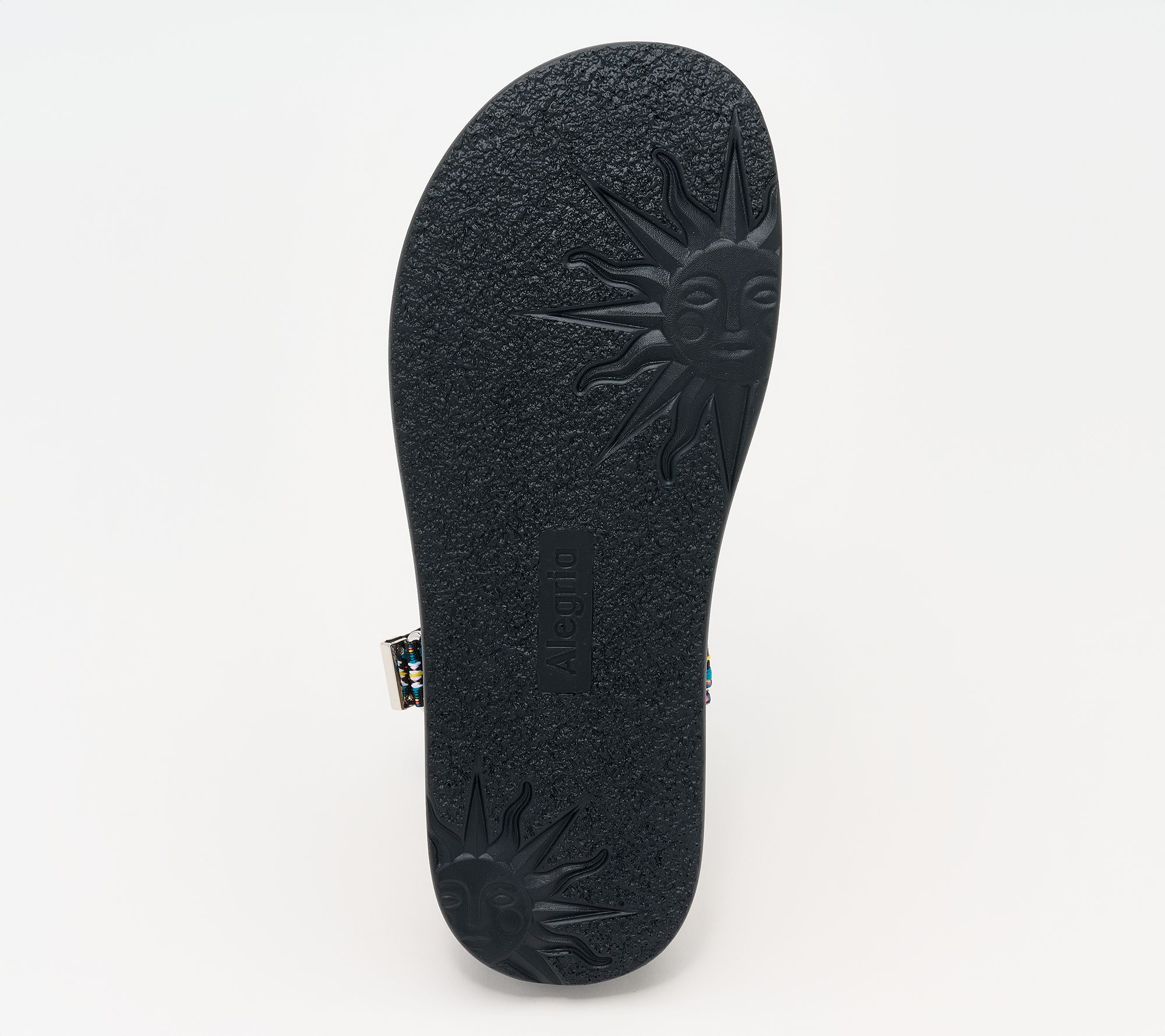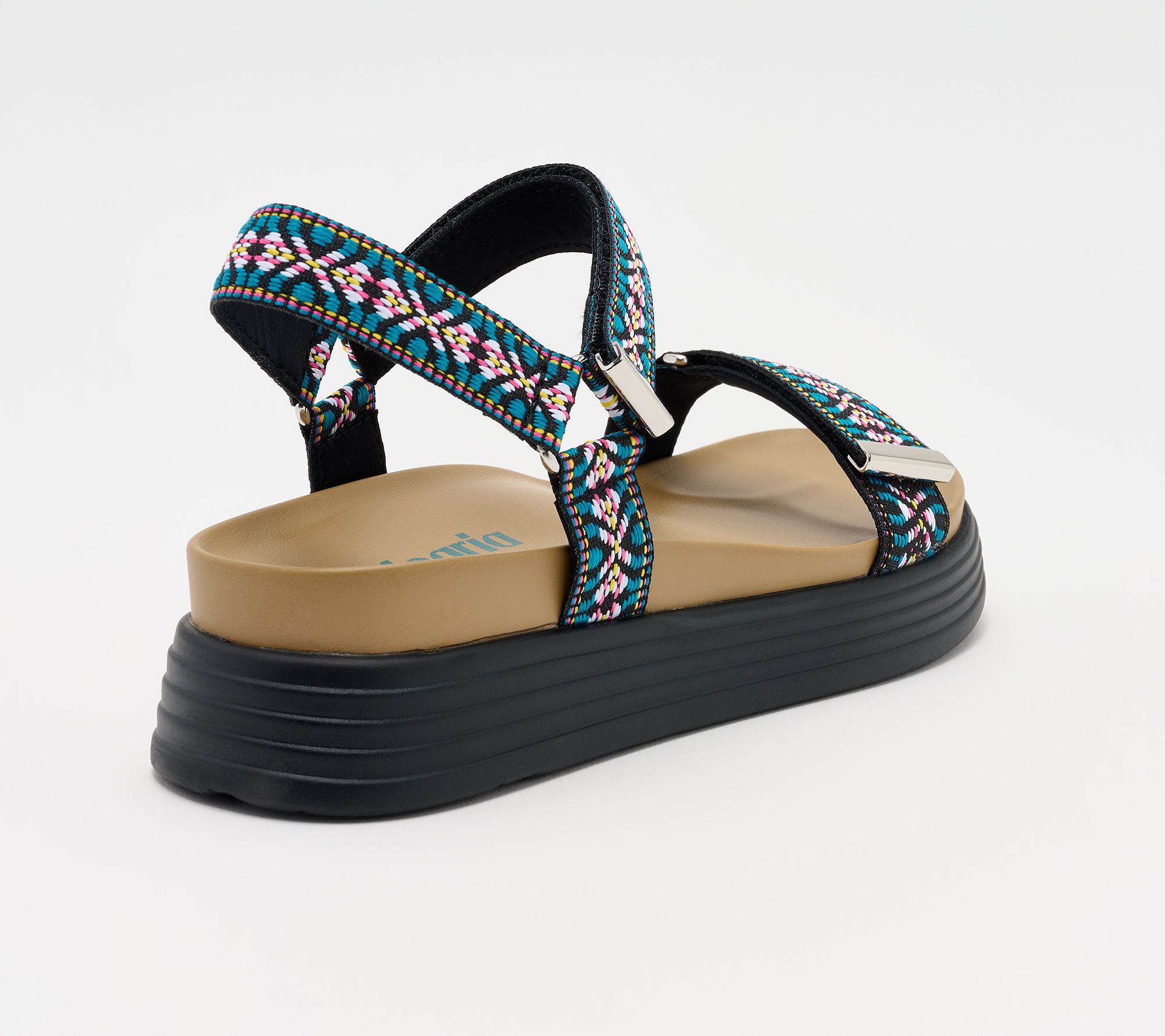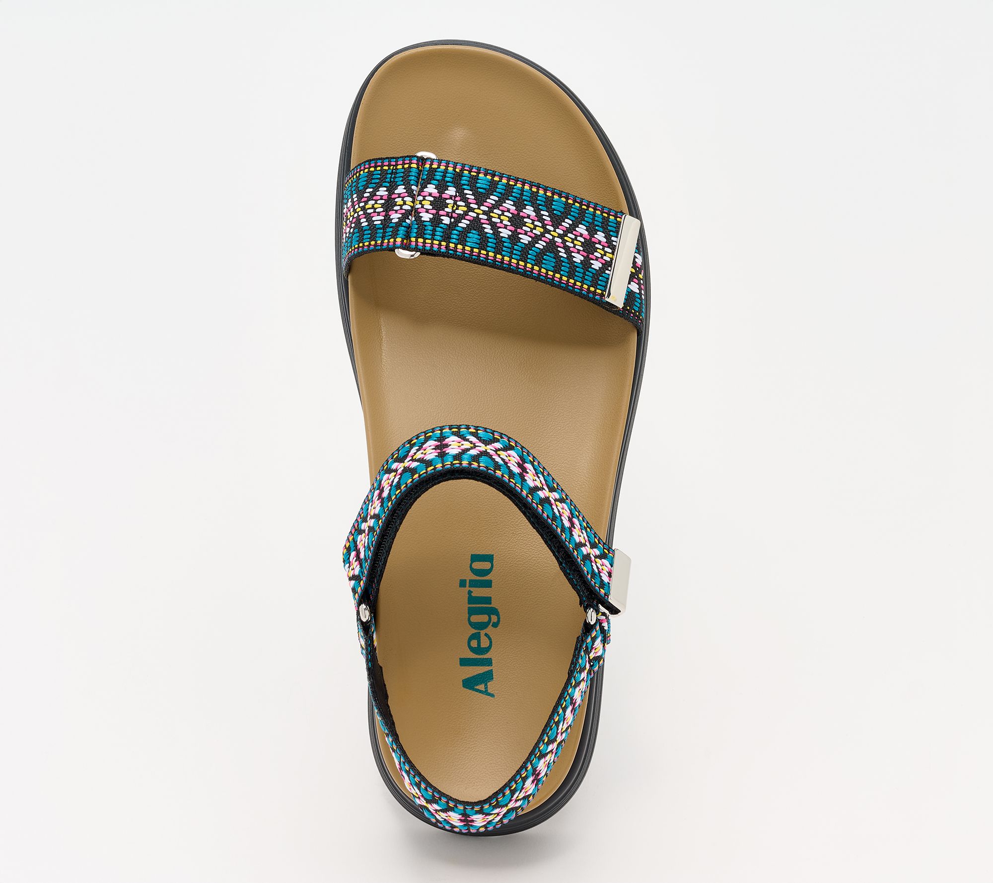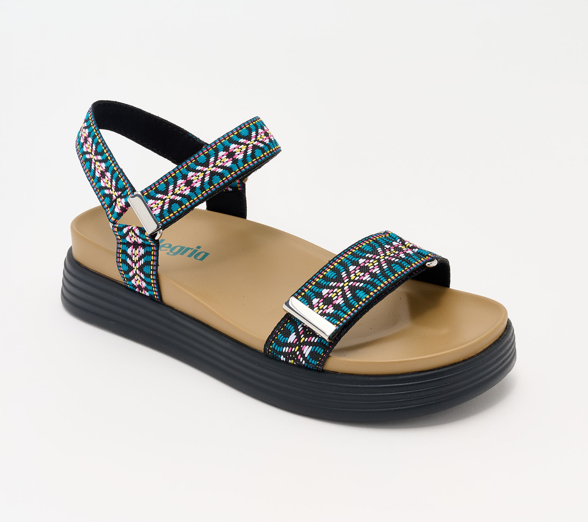 Alegria-Allyson , Strappy textile ankle strap sandal Textile upper, two adjustable hook-and-loop closures with metallic hardware, Dual-density construction Soft molded polyurethane insole with arch support Lightweight non flexing polyurethane outsole, water friendly Manmade upper, Balance manmade 1 1/2 inch heel height
