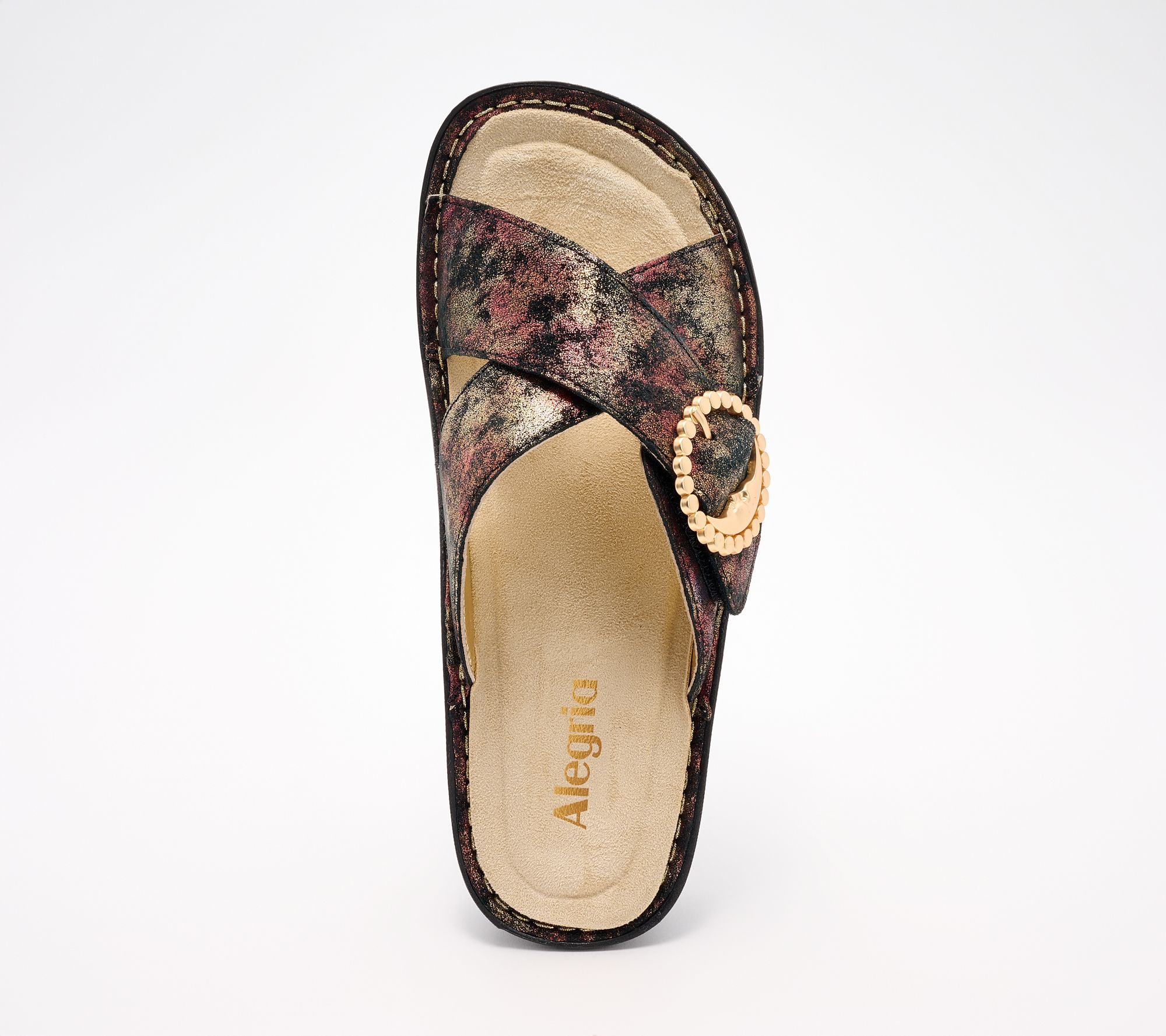 Enjoy easygoing comfort and a touch of charm with these adjustable slide sandals, featuring a leather cross-strap upper and decorative buckle detail. A soft microsuede footbed provides a gentle feel underfoot, making these sandals ideal for transitioning from weekend markets to cozy afternoon walks. From Alegria.
