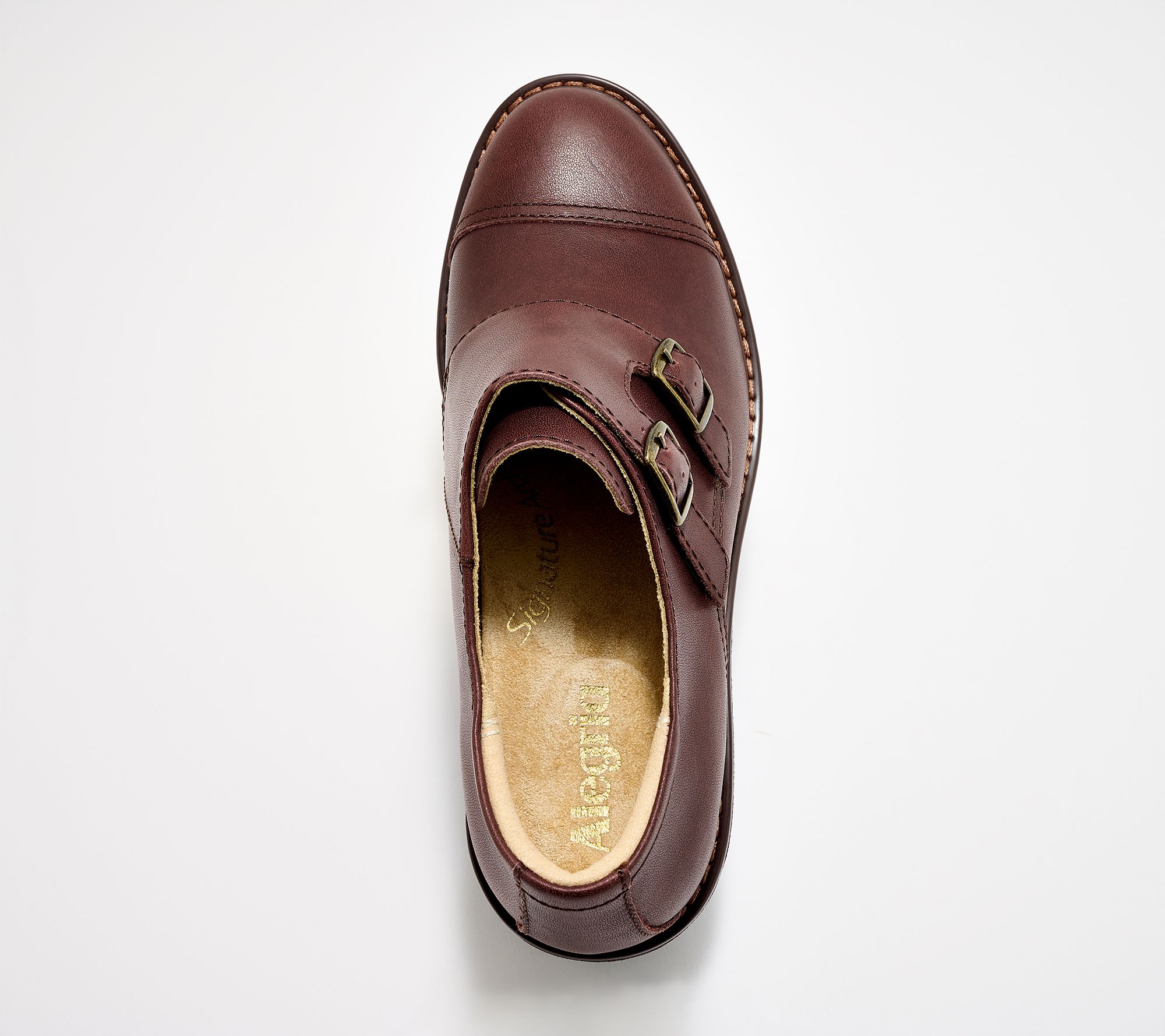 Going from desk to dinner just got easier with these leather shooties that deliver all-day style and support. Double monk straps with an adjustable hook-and-loop closure give a polished look and customizable comfort, while the dual-density footbed pampers your feet on the move. From Alegria.
