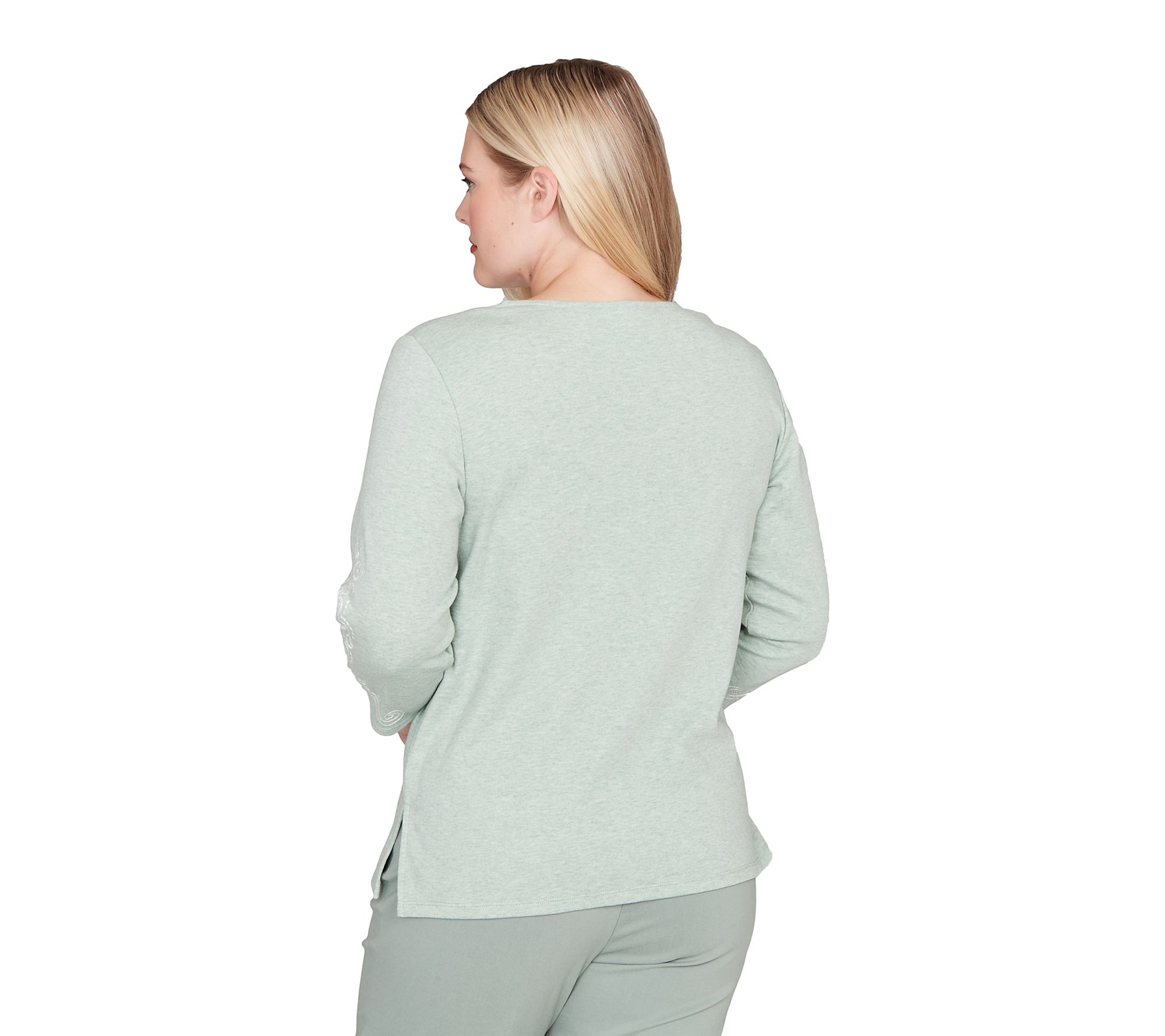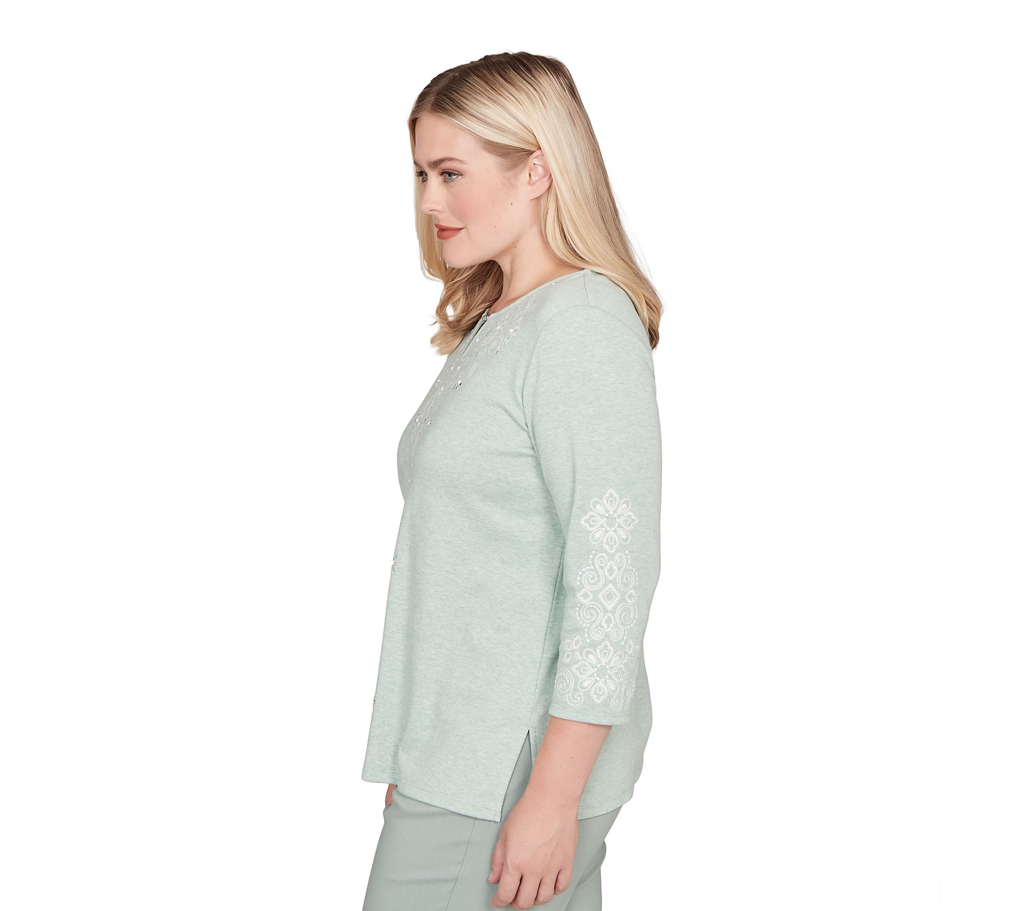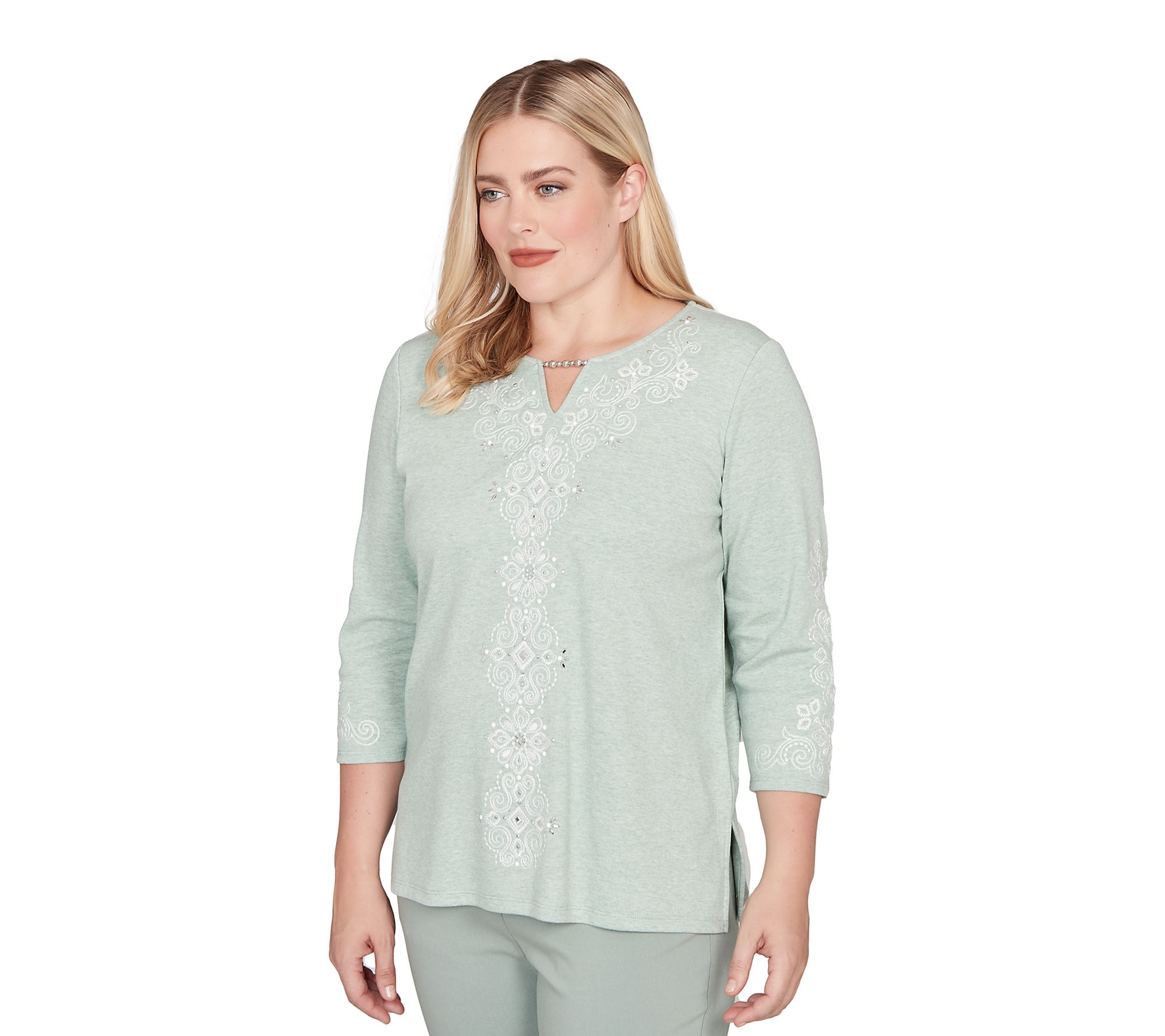 A soft knit top with a touch of timeless charm brings effortless elegance to everything from casual afternoons to dinner with friends. Intricate metallic embroidery at the center draws the eye, while the keyhole neckline and 3/4-length sleeves add feminine flair -- ideal for layering or wearing solo. From Alfred Dunner.