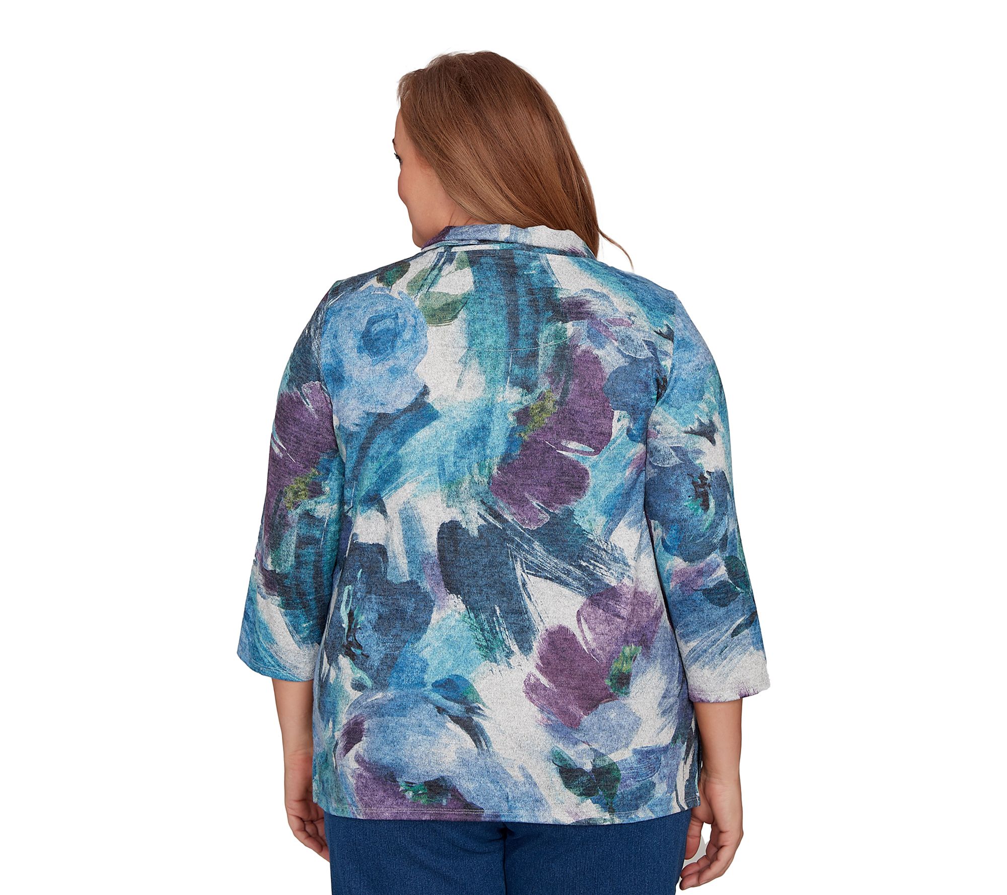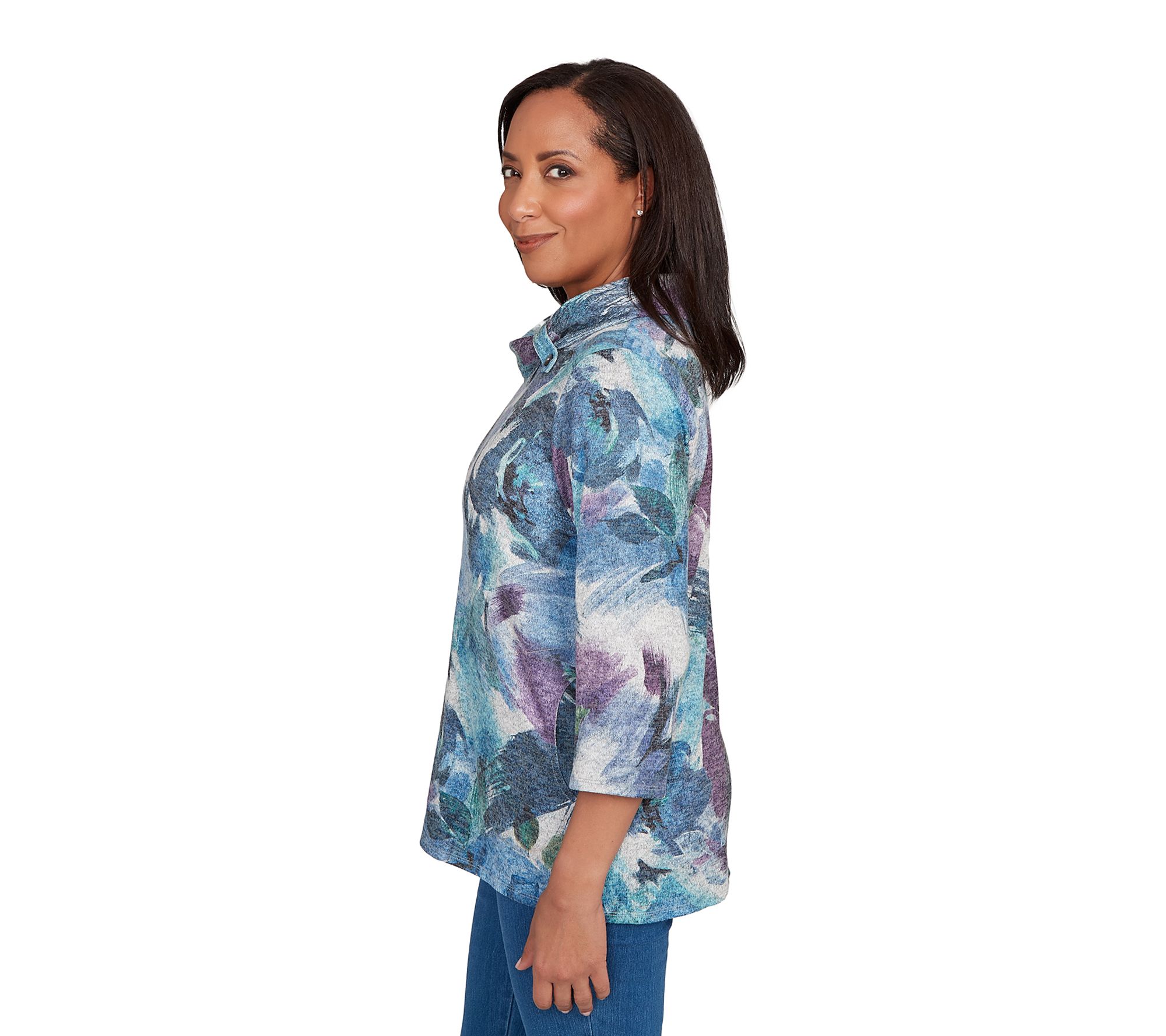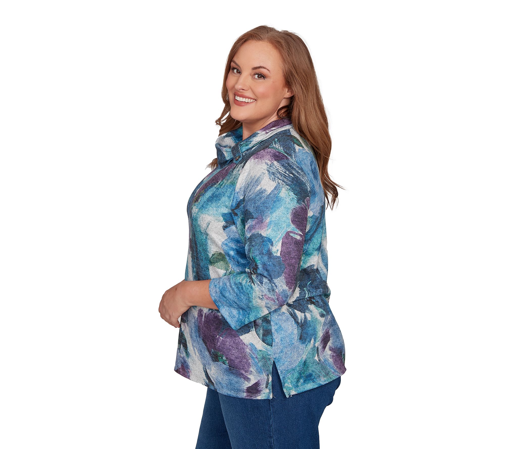 Whether you're heading to brunch with friends or enjoying a leisurely afternoon stroll, this mock-neck top brings a touch of artistry to any moment with its vibrant floral brushstroke design. Enjoy the comfort of a relaxed silhouette and easy movement, making it a go-to choice for both casual outings and cozy gatherings. From Alfred Dunner.