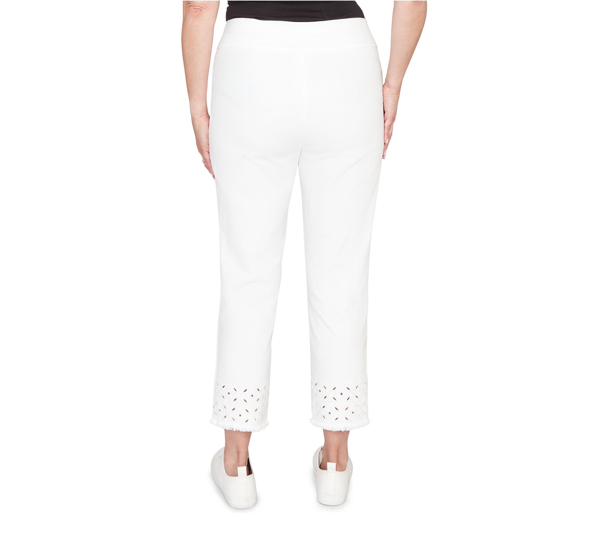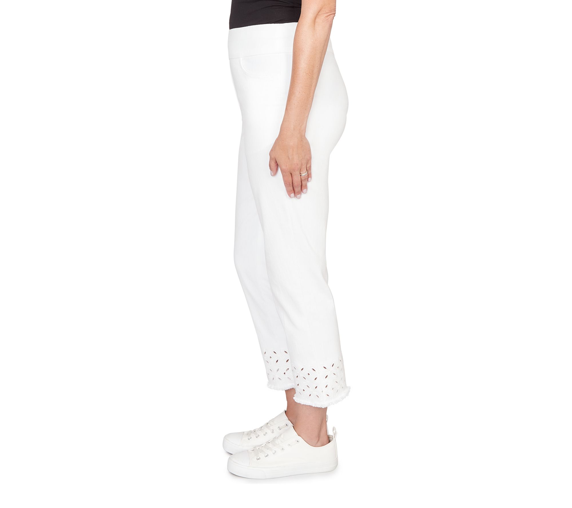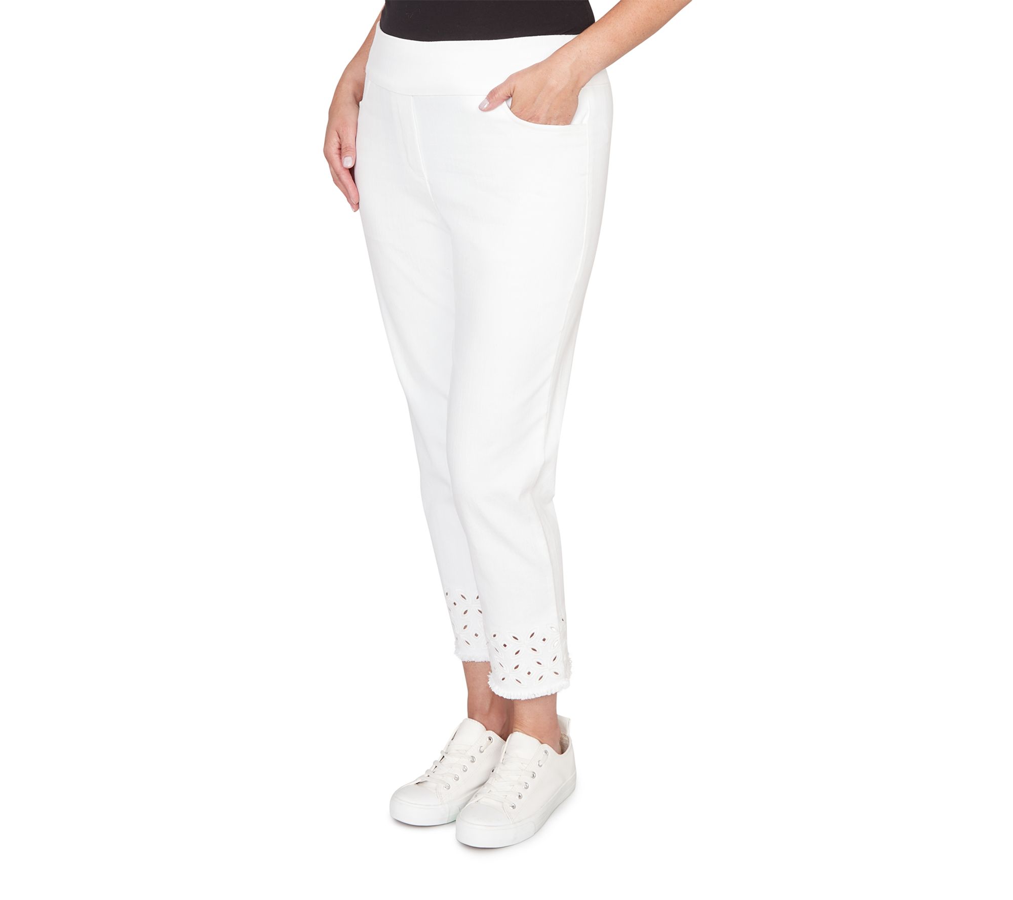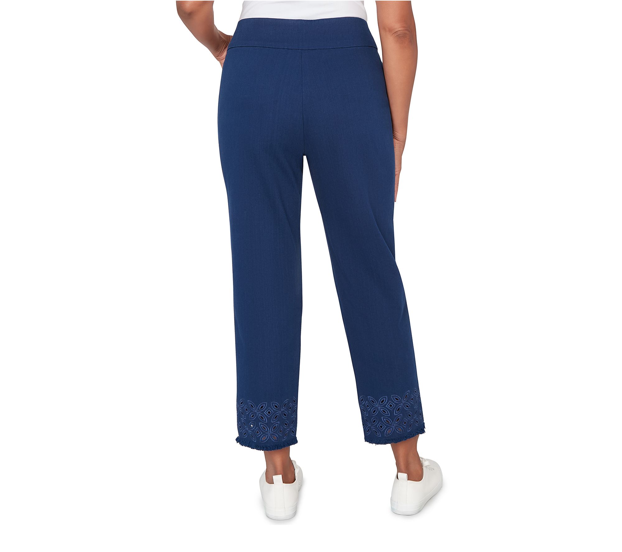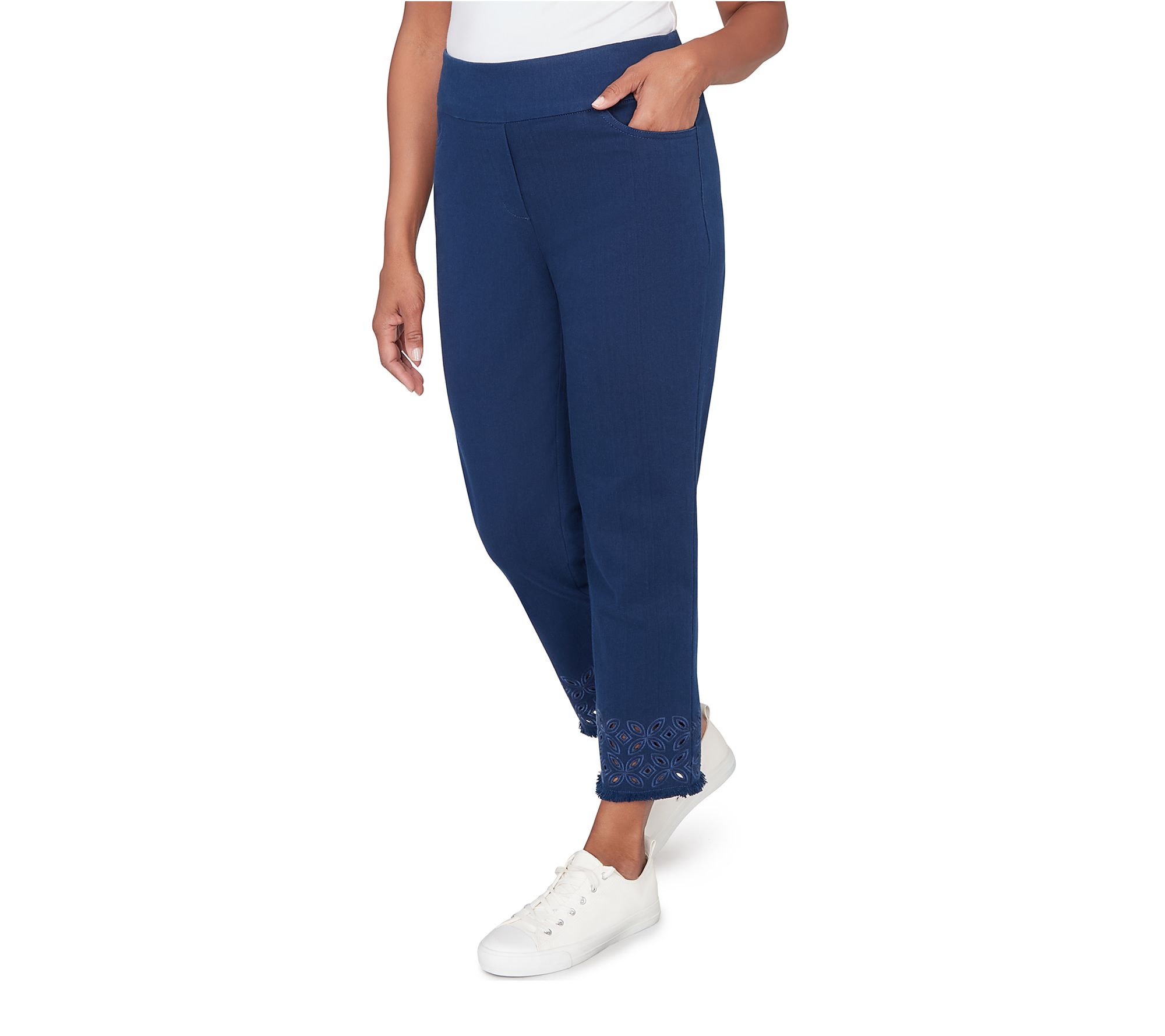 Whether you're strolling the boardwalk or meeting friends for coffee, these stylish stretch denim ankle pants deliver all-day comfort with a polished touch. Geo embroidery adds just the right amount of flair, while the ankle-length design keeps your look modern and fresh. From Alfred Dunner.