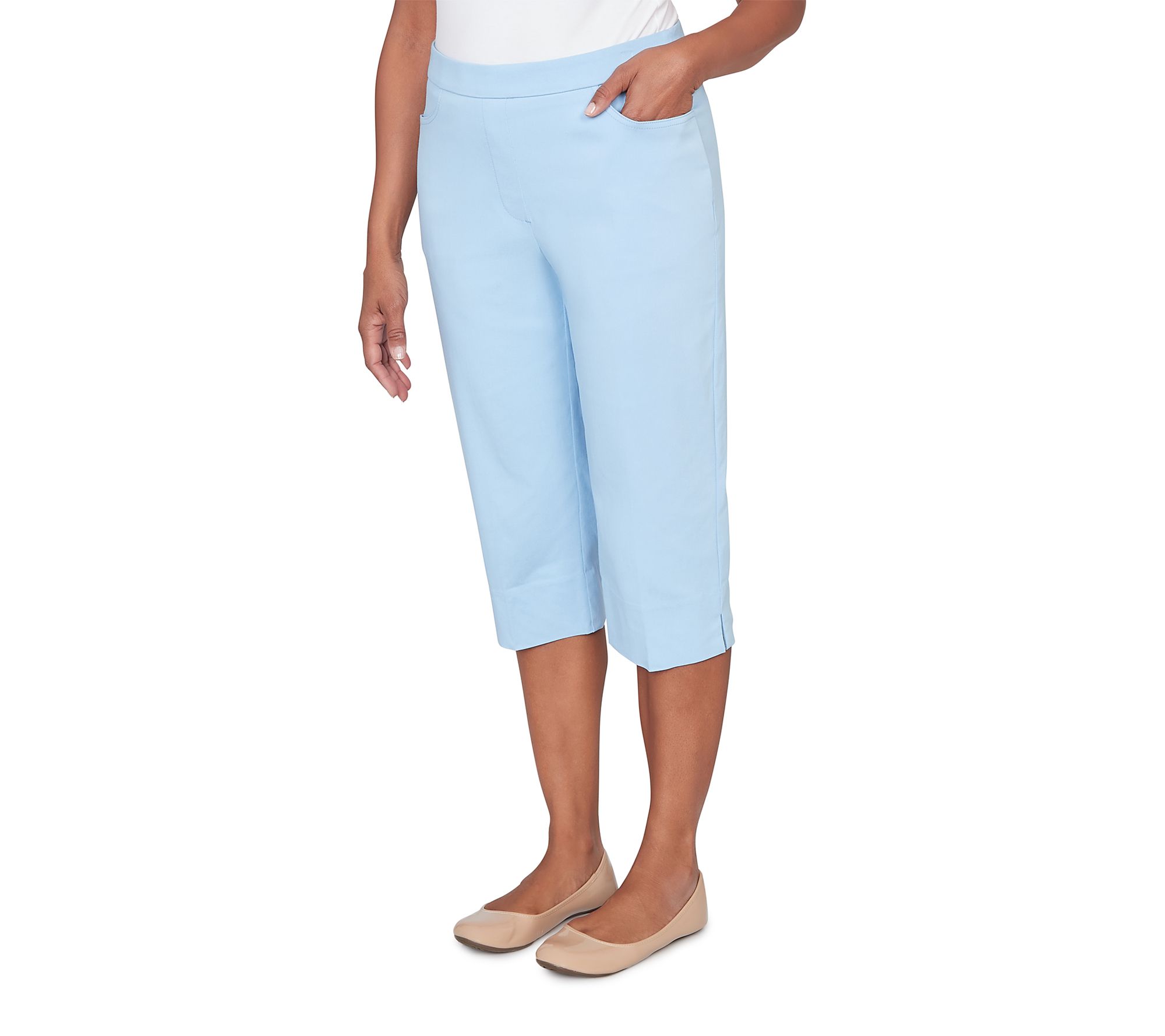 Slip into a pair of clamdigger pants that bring effortless polish and cheerful color to your warm-weather wardrobe. The smooth flat front and comfortable stretch make every outing -- whether brunch with friends or a stroll through the park -- a little brighter, while the Allure Fit flatters with style designed for both ease and confidence. From Alfred Dunner.