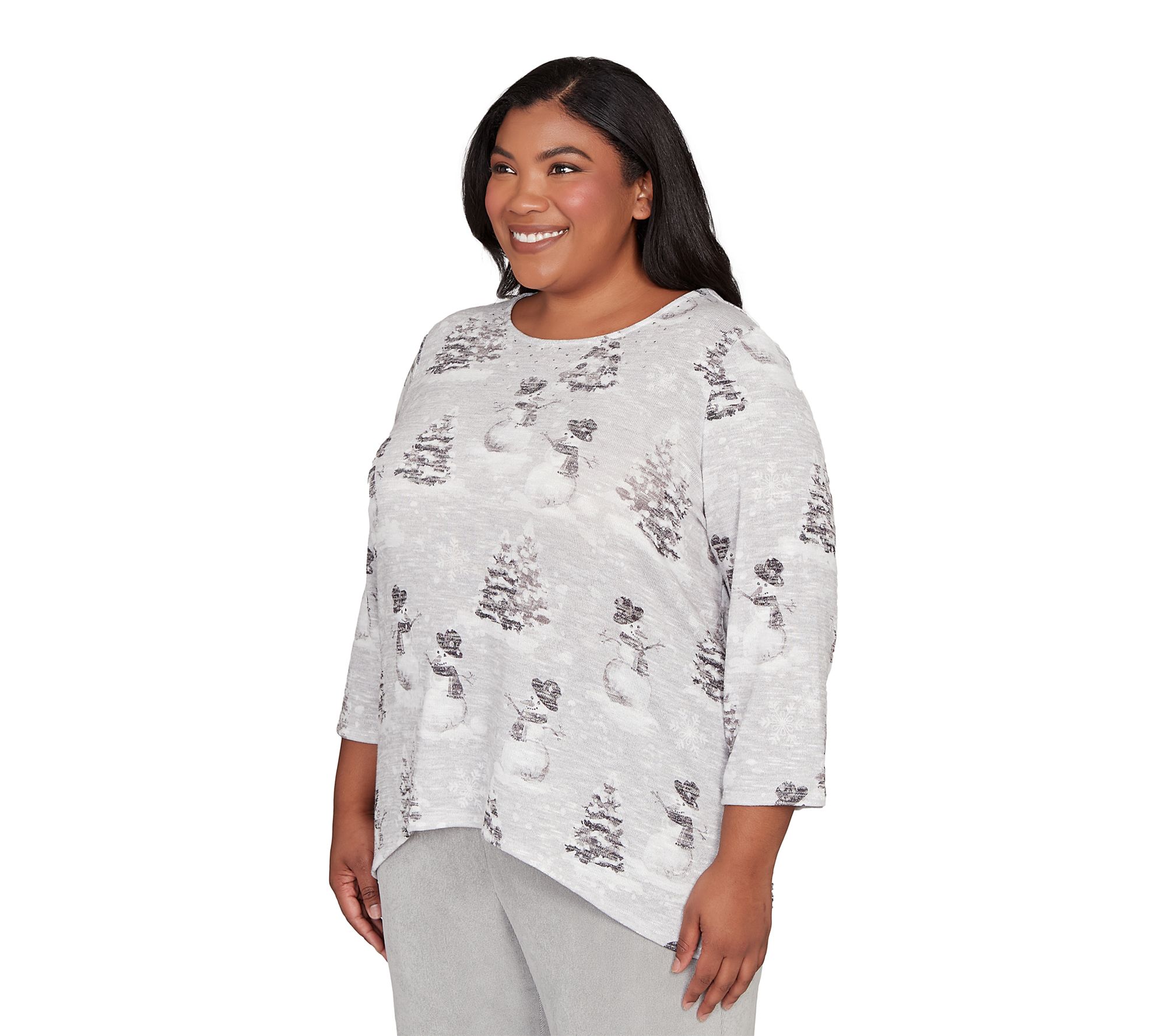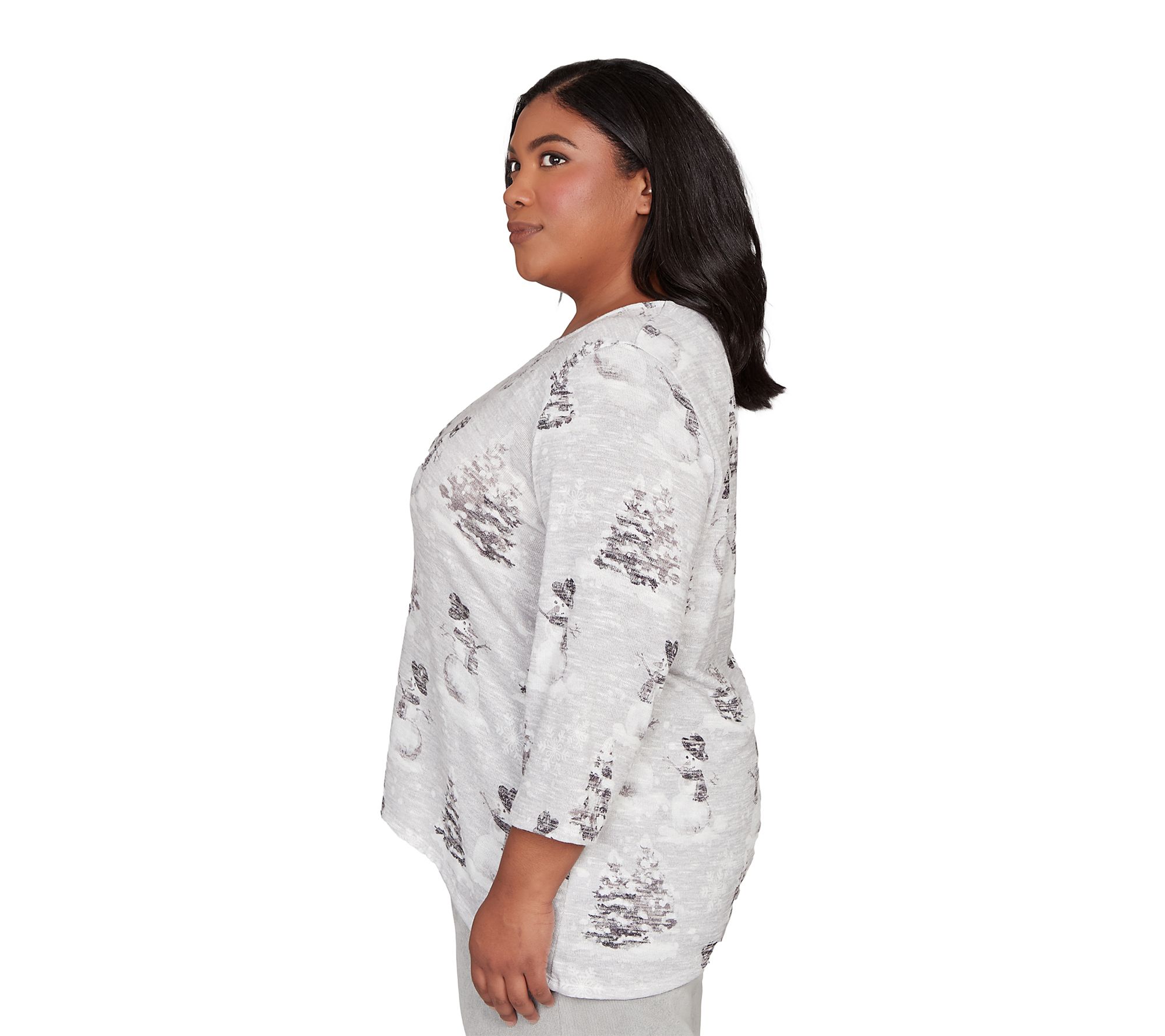 Bring a touch of winter whimsy to your everyday look with this knit top, featuring a cheerful snowmen scene that instantly brightens chilly days. Whether you're heading out for holiday shopping or enjoying a cozy afternoon indoors, its soft fabrication and playful design make it a go-to choice for effortless seasonal style. From Alfred Dunner.