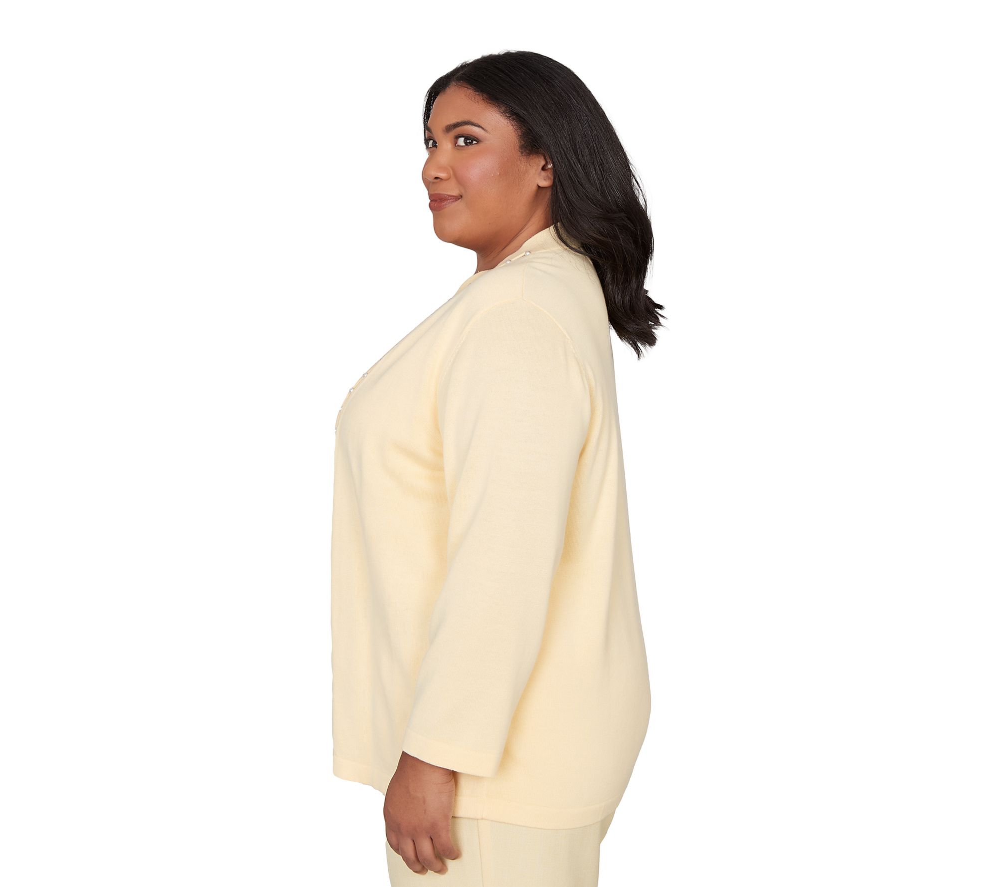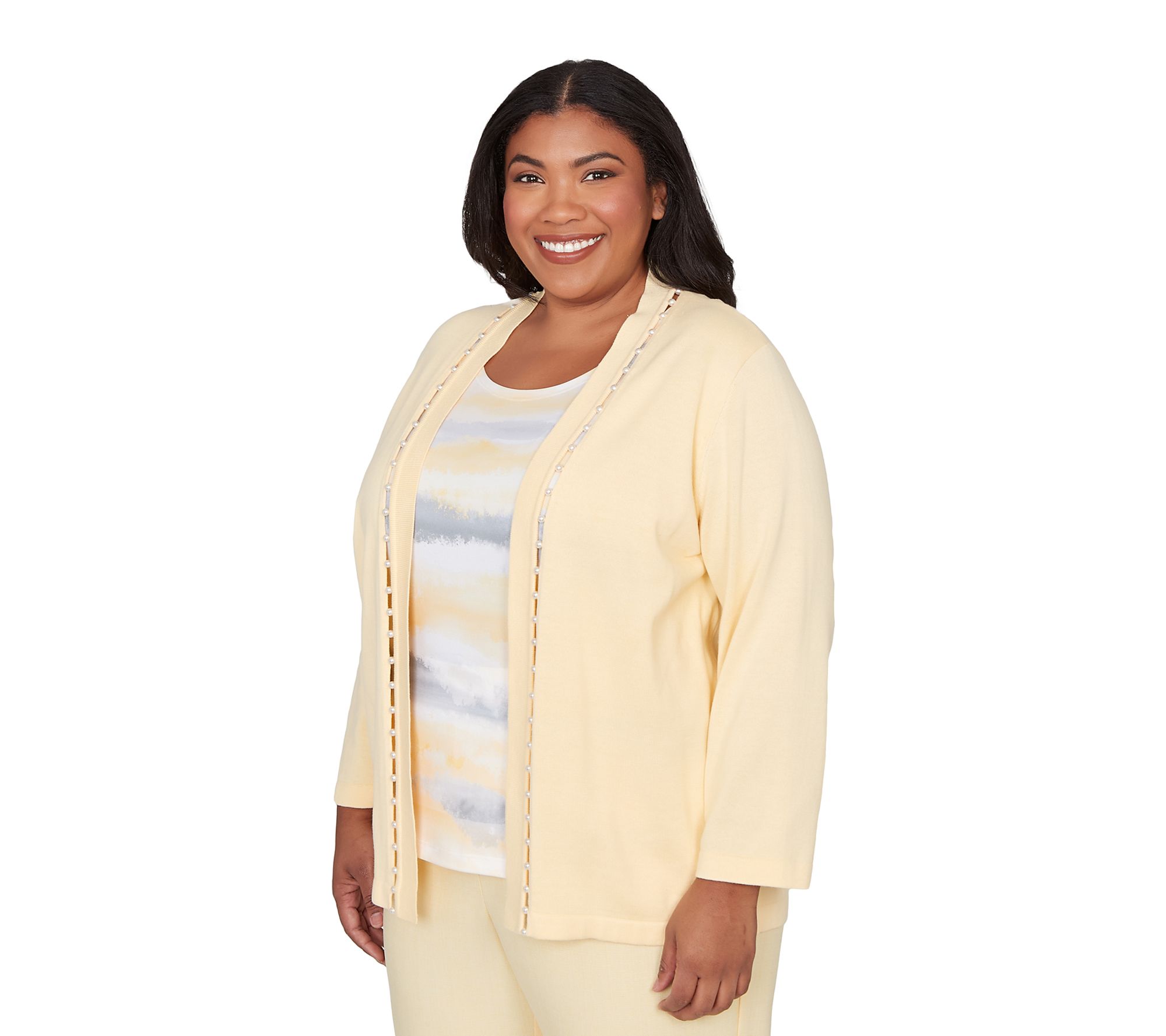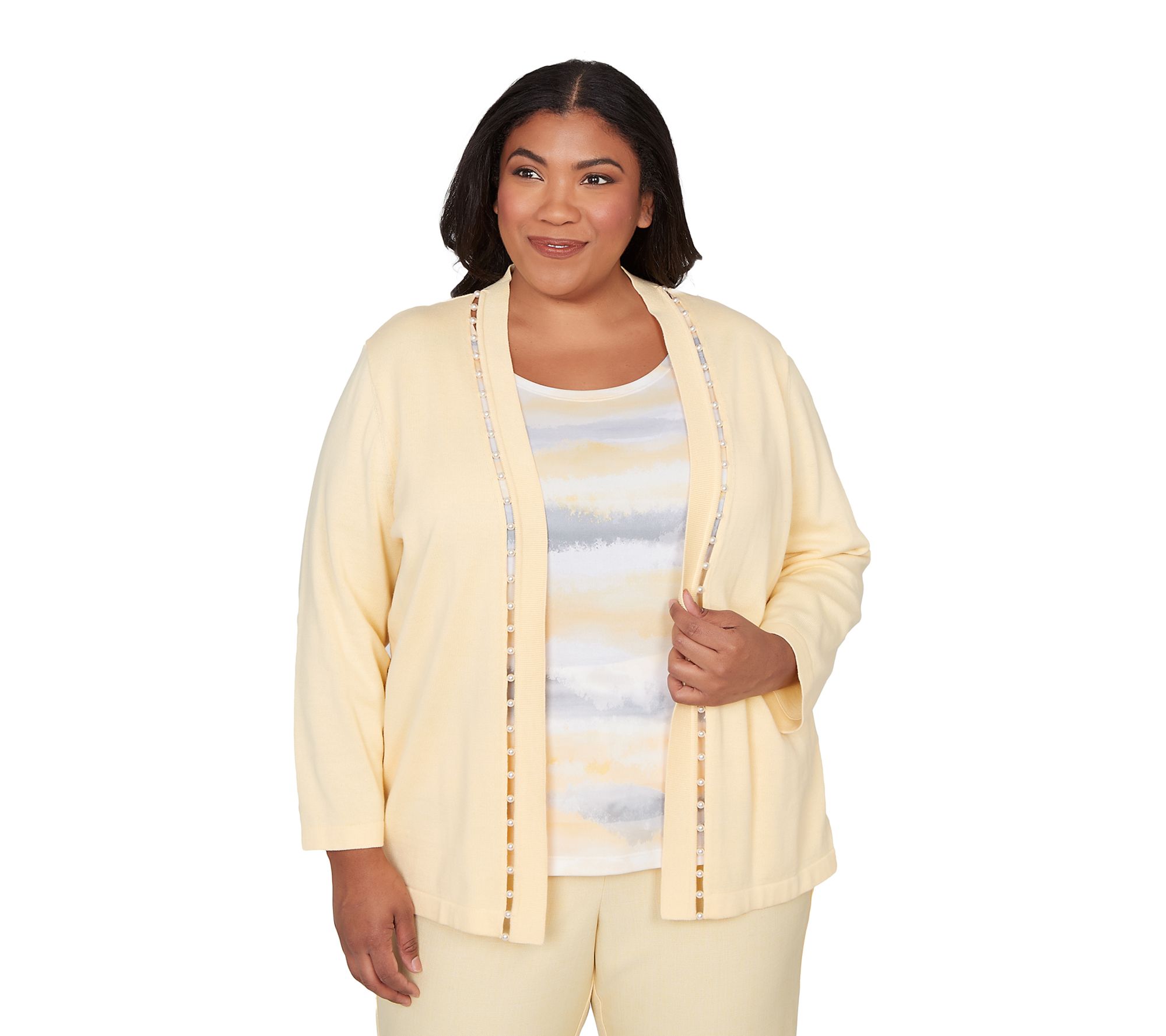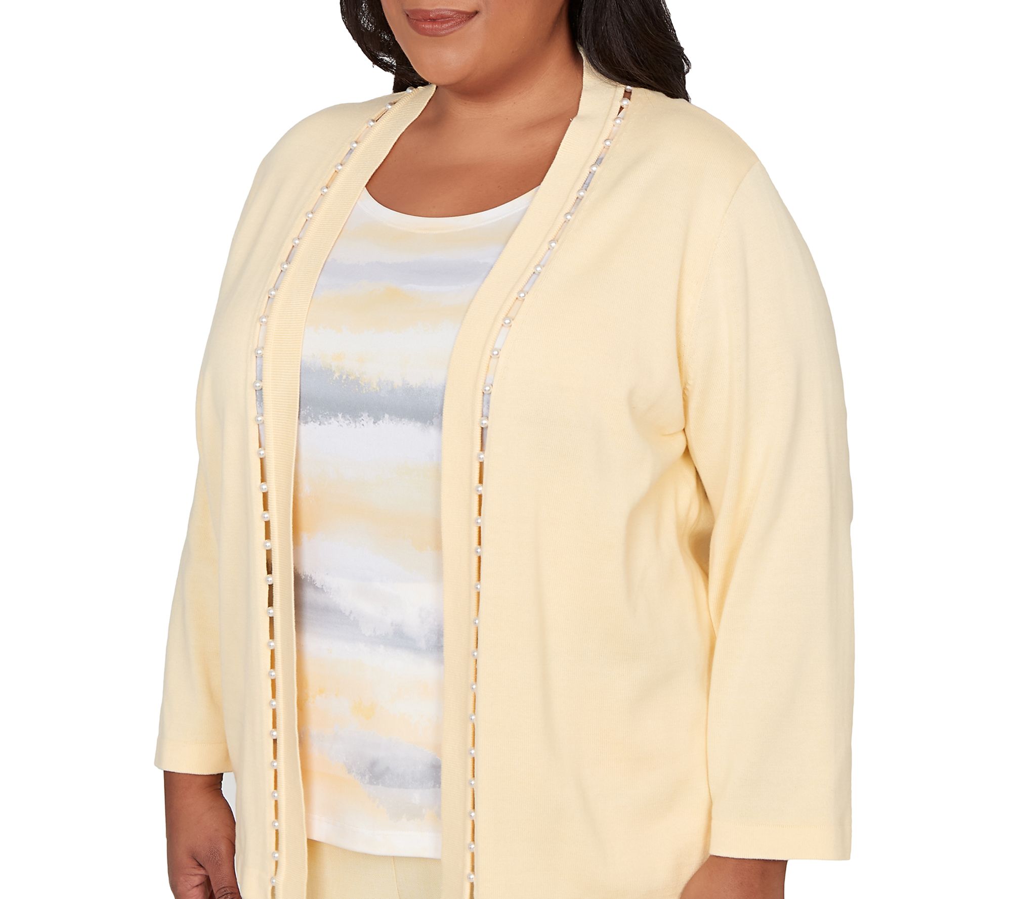 Whether you're heading to brunch with friends or dressing up your weekday wardrobe, this women's sweater blends effortless polish with comfort. Soft biadere stripes peek beneath a coordinating knit overlay accented by simulated pearl-studded ribbon details, giving you the layered look without the fuss. Finished with a shawl collar and crew neckline, its relaxed fit and 3/4-length sleeves transition seamlessly from season to season. From Alfred Dunner.